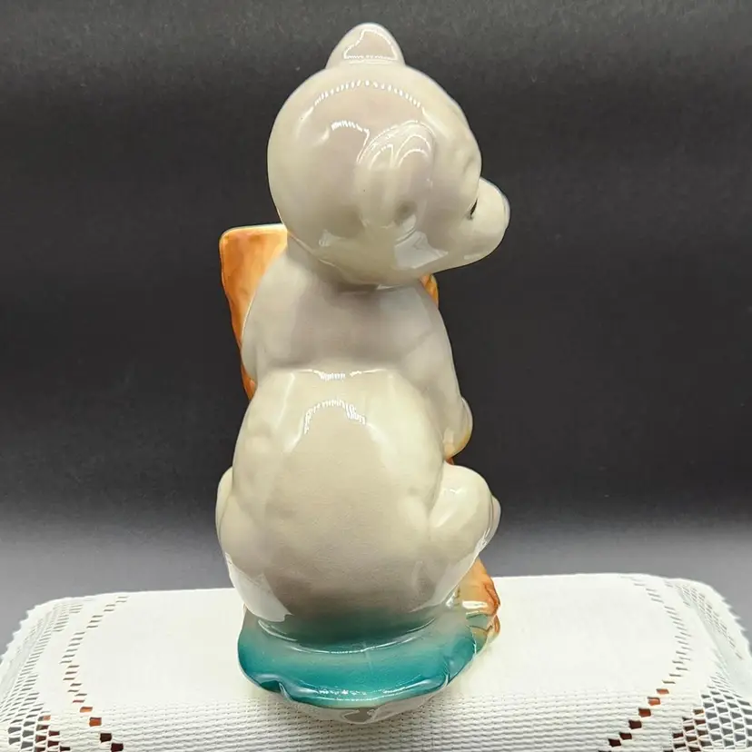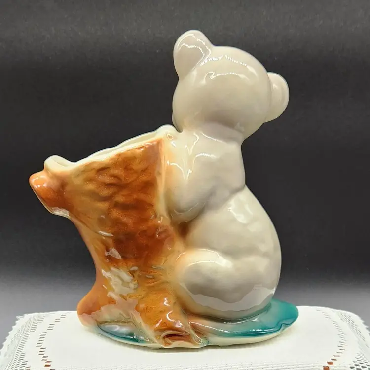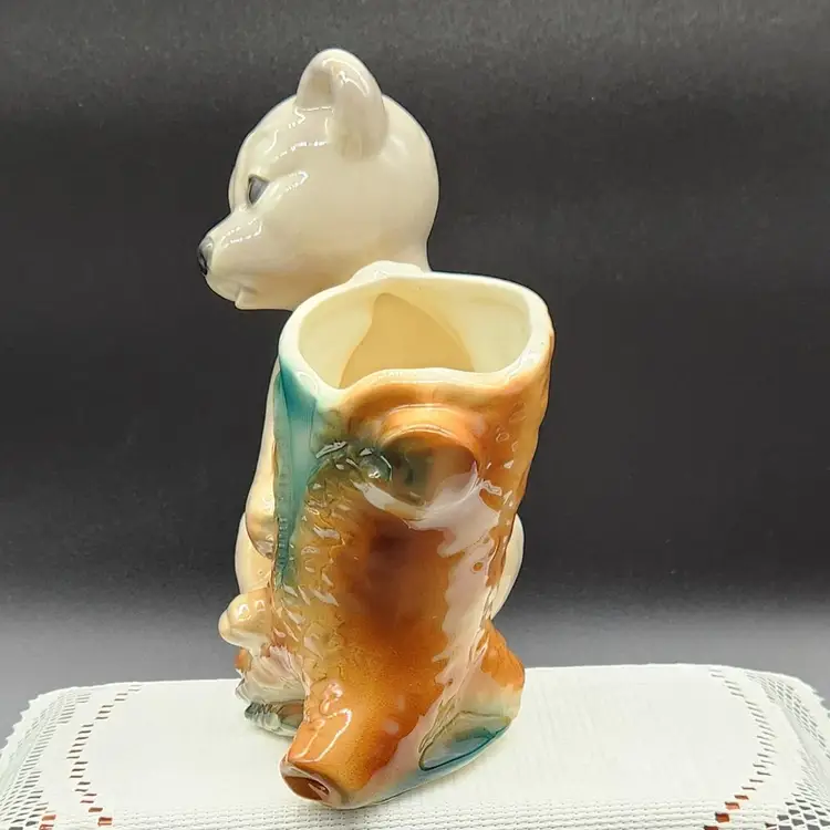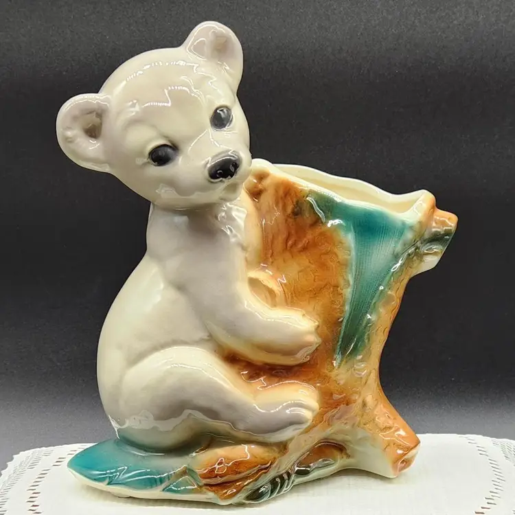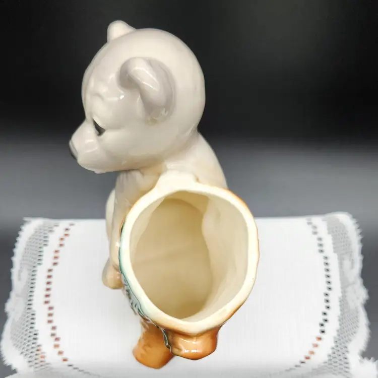 Charming ceramic bear cub planter, perfect for adding a touch of whimsy to your home decor. No visible damage. 7 in H 7.25 in L 4 in W