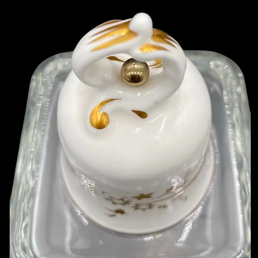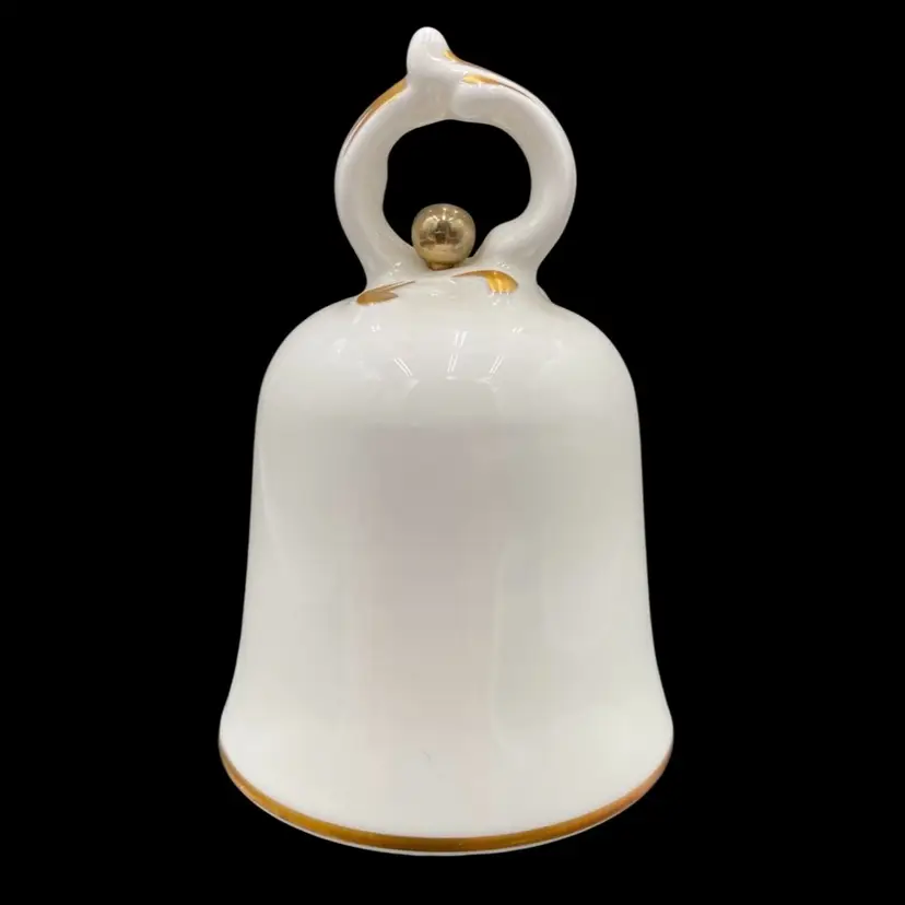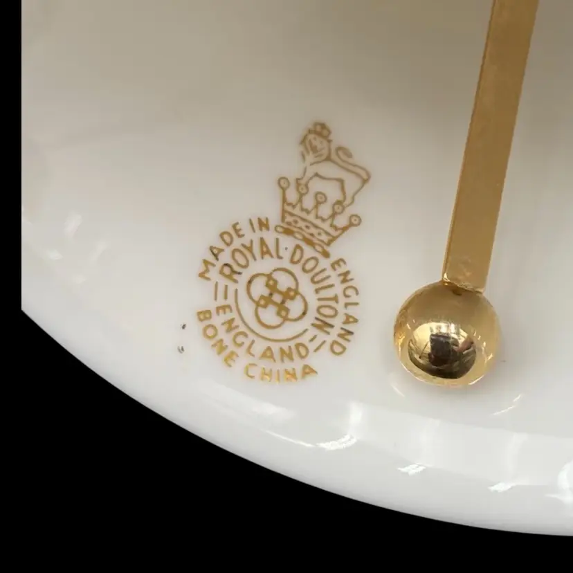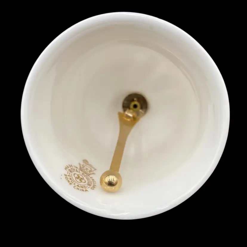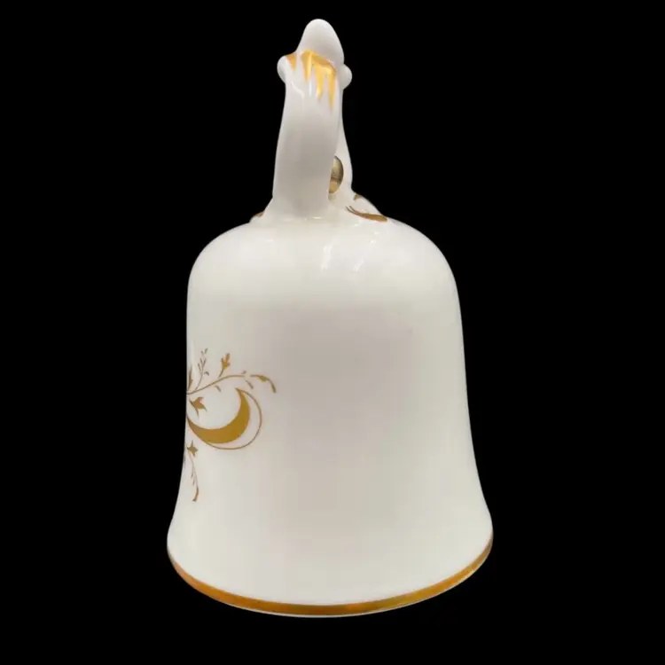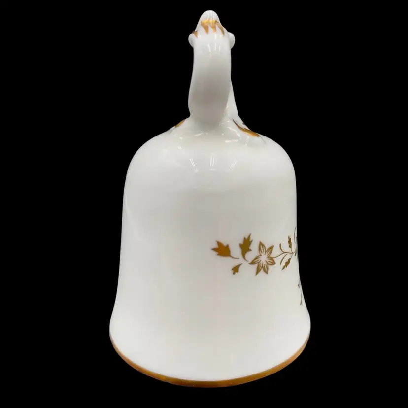 This vintage Royal Doulton bone china bell is a beautiful addition to any collection. Made in England, it stands at 3 inches tall and features an elegant gold floral pattern as well as gold detail work. It is made of high-quality English bone china and has a glossy finish. The bell is small, measuring 2 inches in width and weighing only 1.5 ounces.