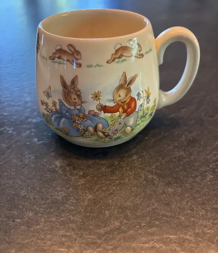 This vintage Royal Doulton Bunnykins mug is a delightful addition to any collection. The mug features a charming pattern of bunnies picking flowers, and is made of high-quality porcelain. It is perfect for enjoying hot or cold beverages, and comes with a convenient handle for easy use.