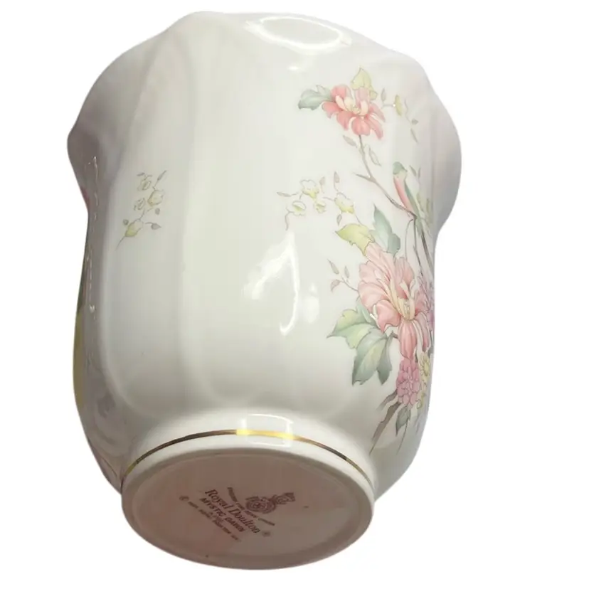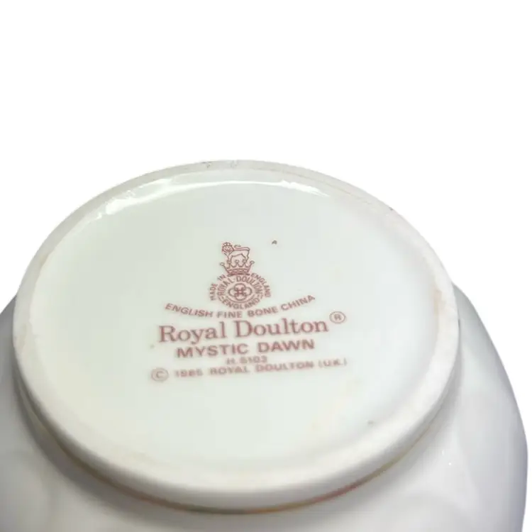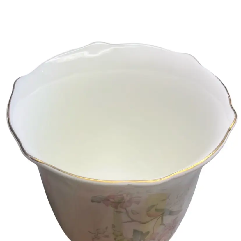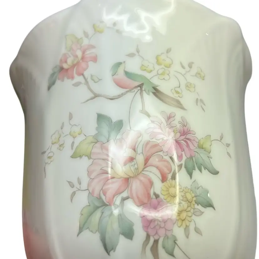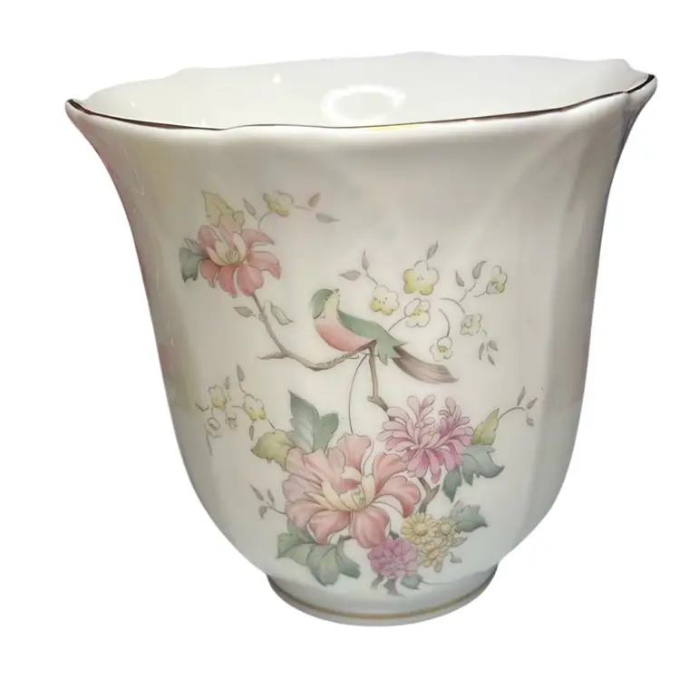Elegant English fine bone china made in 1985 - beautiful florals with a colorful bird perched on a branch. No chips or cracks in excellent condition. Measures 4.5” tall & 4.5” wide