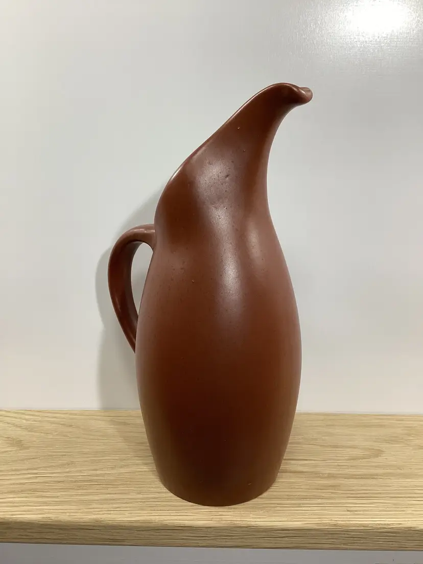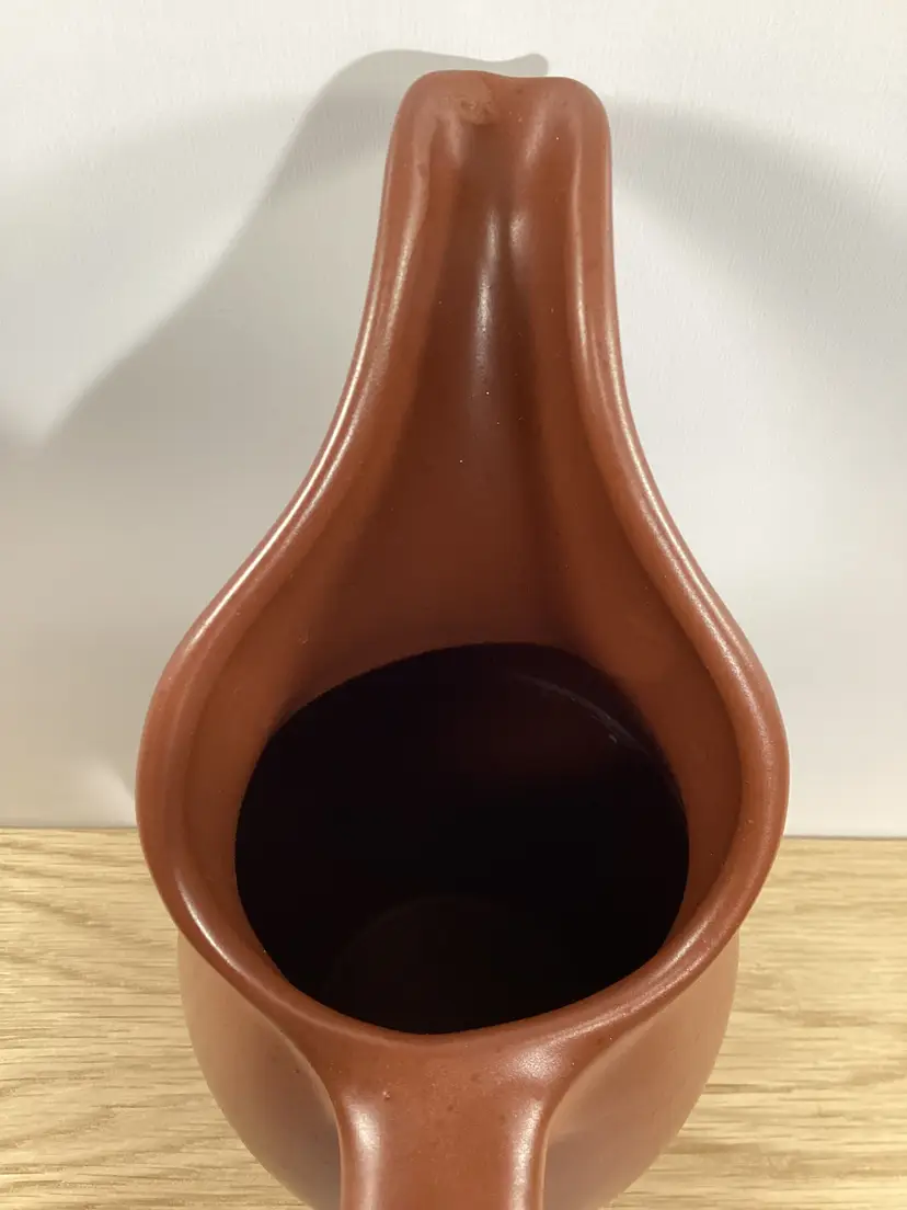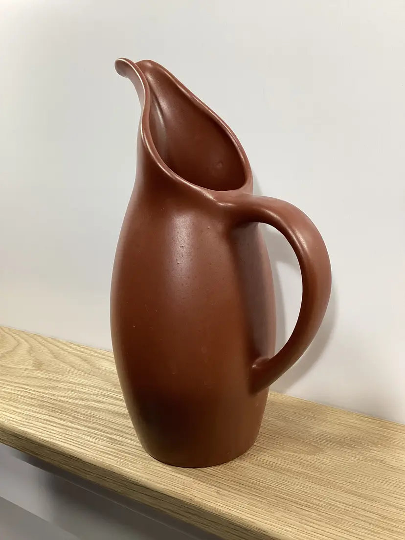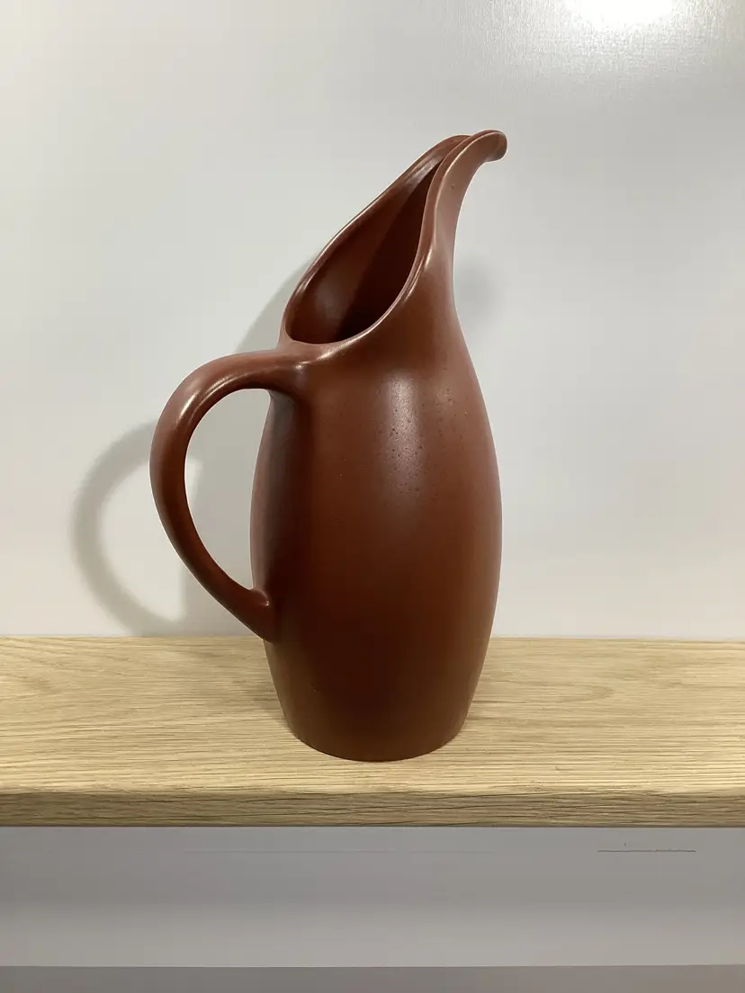 Royal Haeger MCM ceramic pitcher…can also be used as a flower vase. Approx. 10” tall and 4” in diameter. Original dark red / brown coloring with a matte finish. This vintage pitcher has been cleaned and inspected. There are no cracks, chips, or damage. Circa 1960’s. Please review all pictures. Shipping via USPS. Thanks.