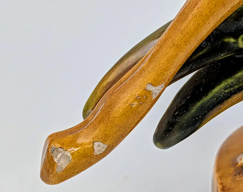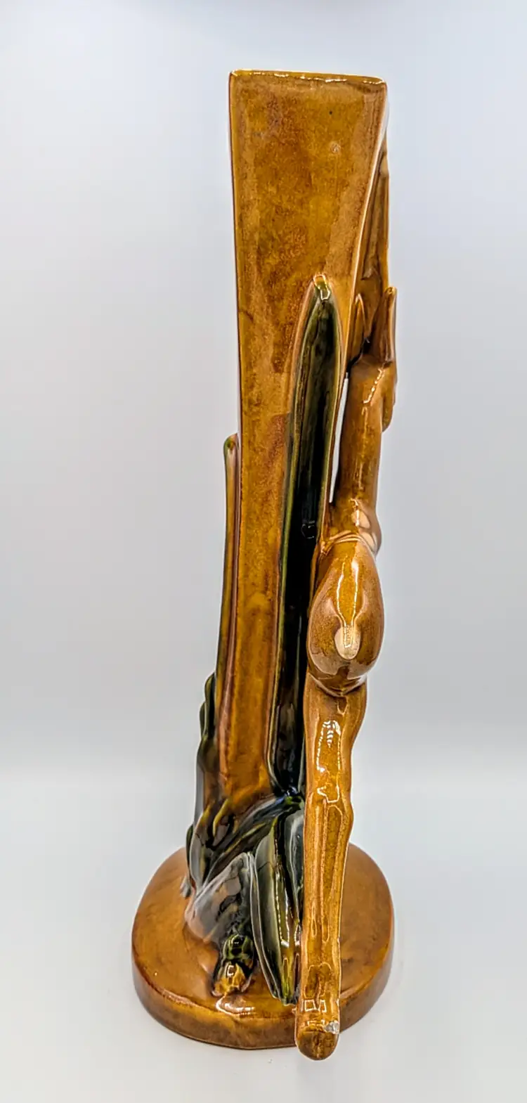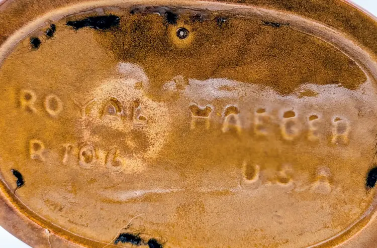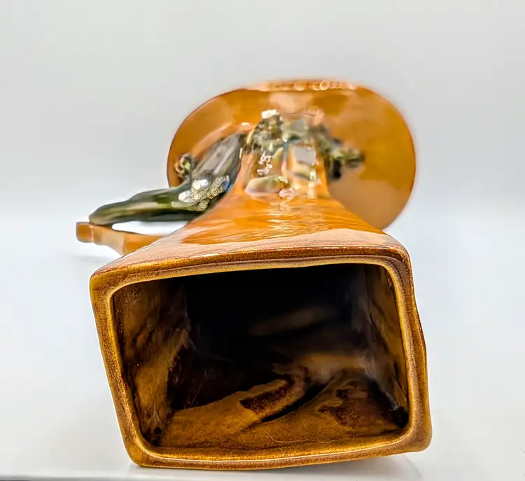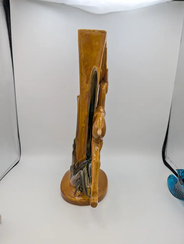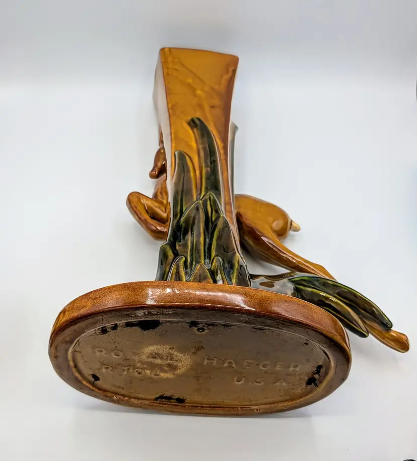 Striking vintage Royal Haeger figural gazelle vase/planter, marked Royal Haeger U.S.A. R706 on the underside. This mid-century design features a graceful leaping gazelle positioned beside a tall rectangular vase form with sculpted grass details at the base. Finished in a warm brown glaze with green accents, the piece reflects the sculptural wildlife designs popular during the 1960s mid-century modern era. Royal Haeger pottery was produced in Dundee, Illinois, and is well known for its decorative art pottery and figural pieces. Measurements Height: approx. 15 inches Base diameter: approx. 6 inches Vase opening: rectangular Good vintage condition. There is visible glaze loss/chipping on the tip of the gazelle leg/hoof, as shown in the photos. No major cracks or repairs observed. Please review all photos carefully for condition details.