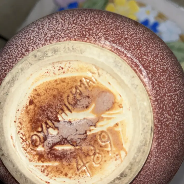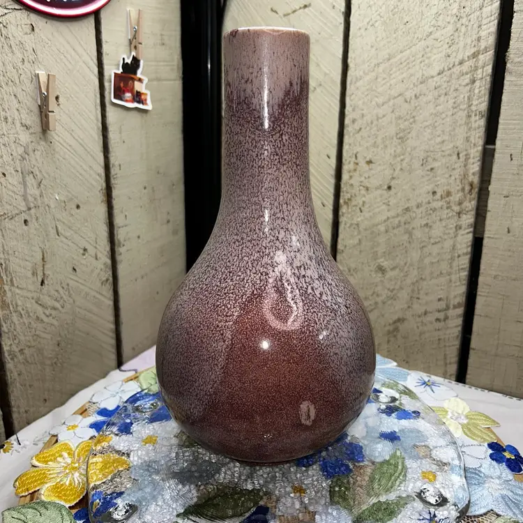 Royal Hickman is artist. This piece probably designed for Haeger in the 1940s. Speckled and drip glaze effect called “Agate”. Rare purple glaze. 11” tall, 1.75” diameter opening, 5.5” diameter at widest. Speckled, over lay glaze. Excellent condition. No chips or cracks.