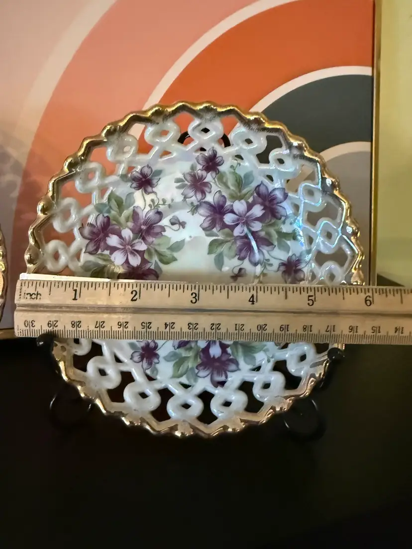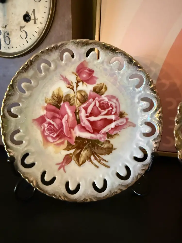 Add a touch of mid-century romance to your home with this lovely pair of Royal Sealy China Japan plates. Each features a lustrous iridescent glaze with scalloped and pierced edges trimmed in rich gold. The first plate displays lush pink roses, while the second showcases violets in lavender and green hues.