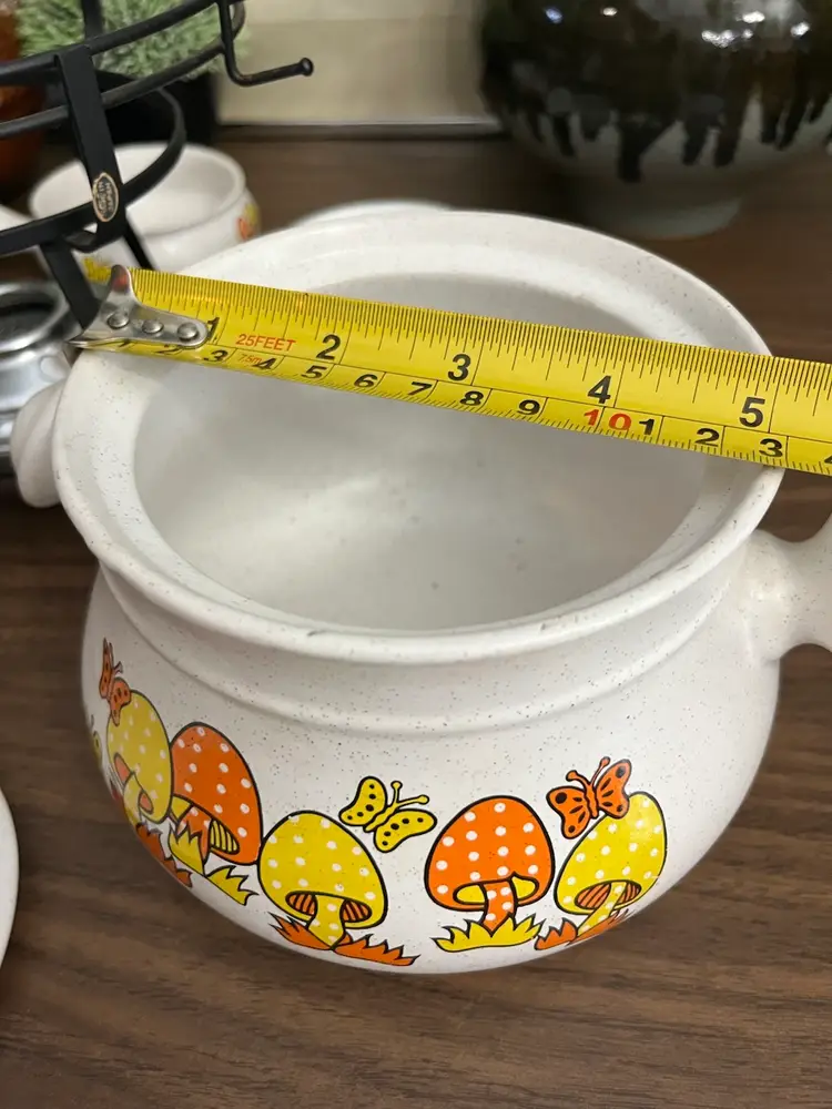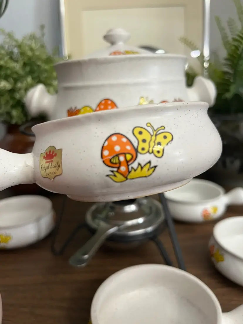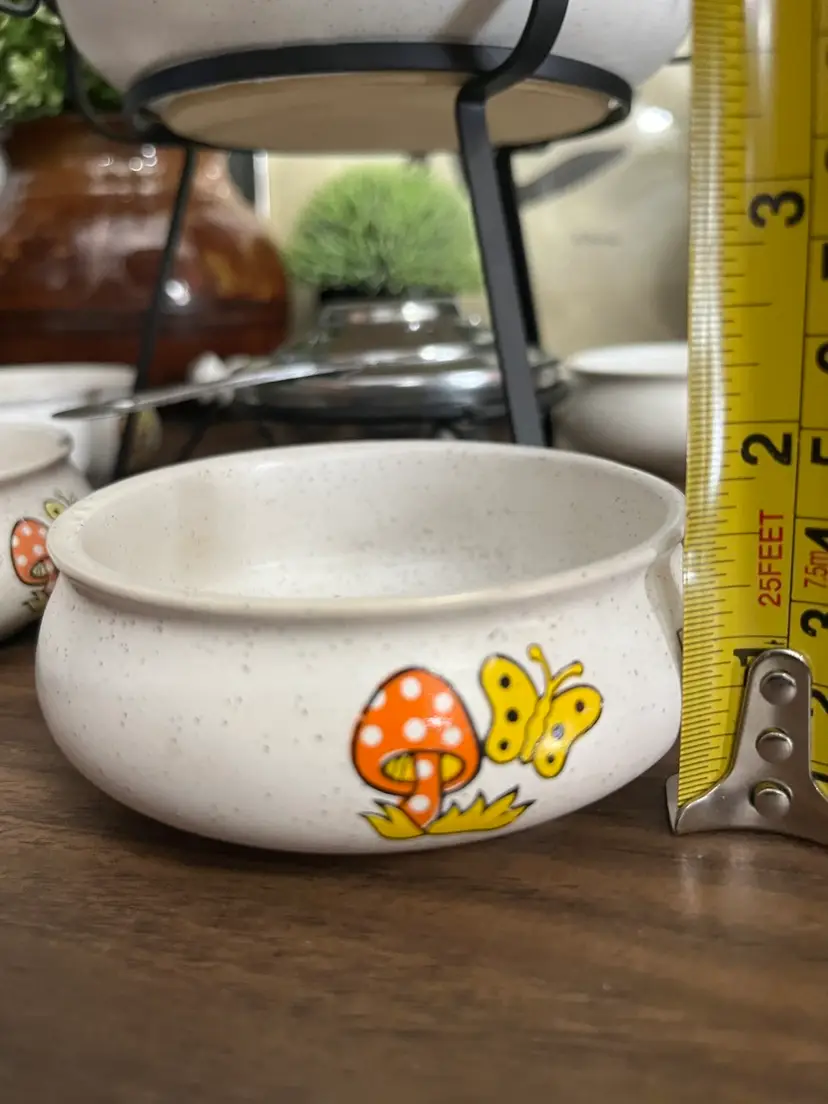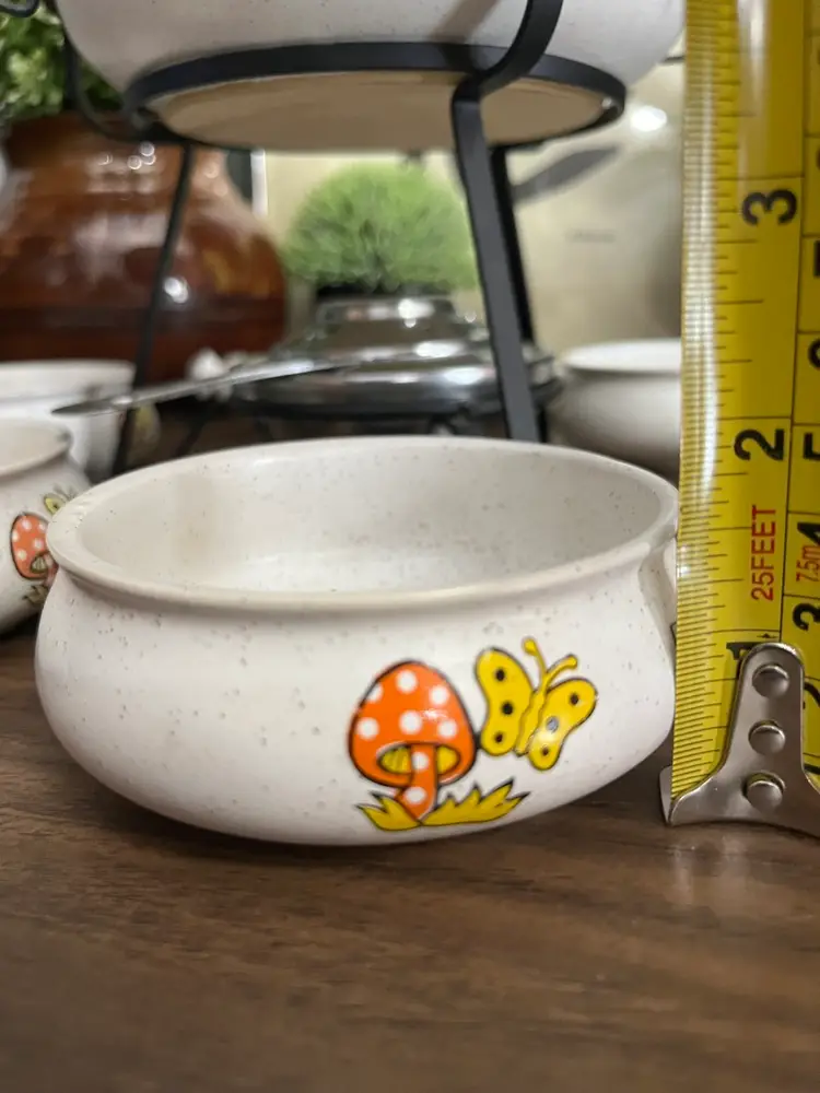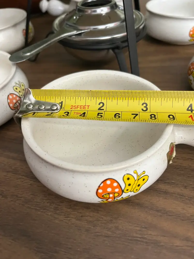 All pieces are in good preowned condition with no chips or cracks. There is some very light wear on some of the imagery on the sides of the bowls as shown, but it’s minor. Most of the pieces still have their original Royal Sealy stickers. This includes everything with the exception of some fondue skewers (could be easily replaced). The small bowls measure approximately 1.5” tall and 3.5” in diameter. The crock measures approximately 4.25” tall without the lid and 5” in diameter at the opening. Message me should you have any questions.