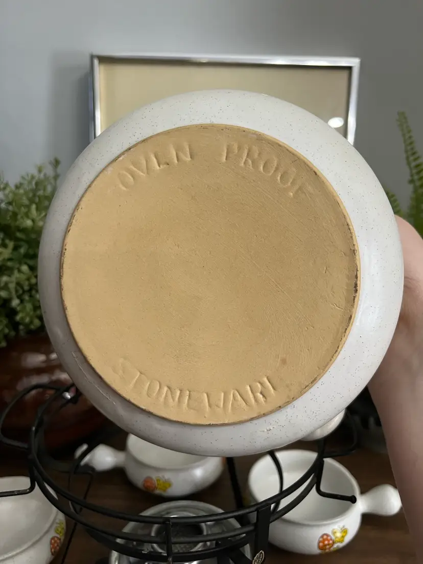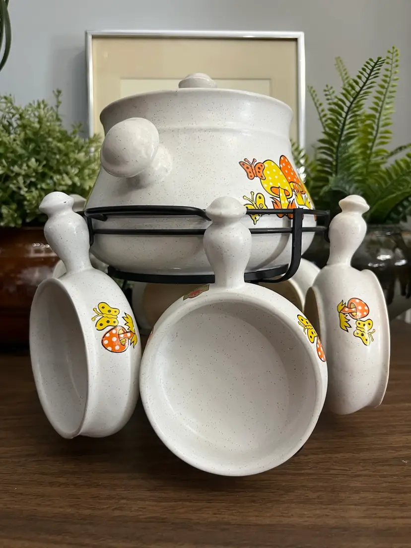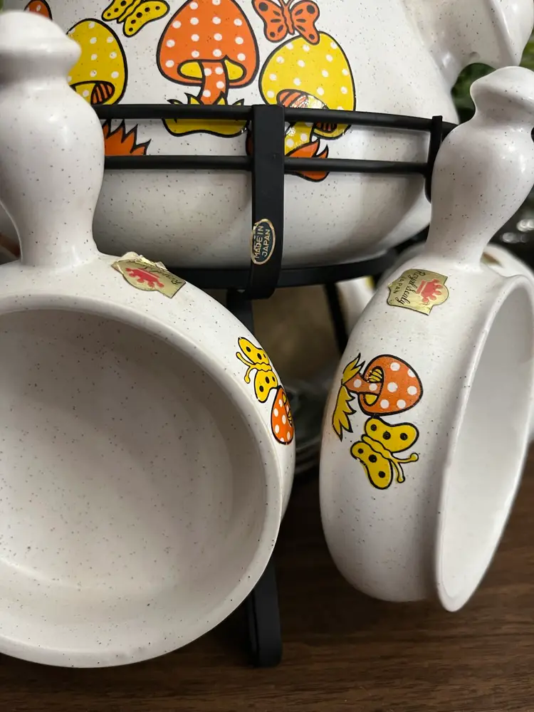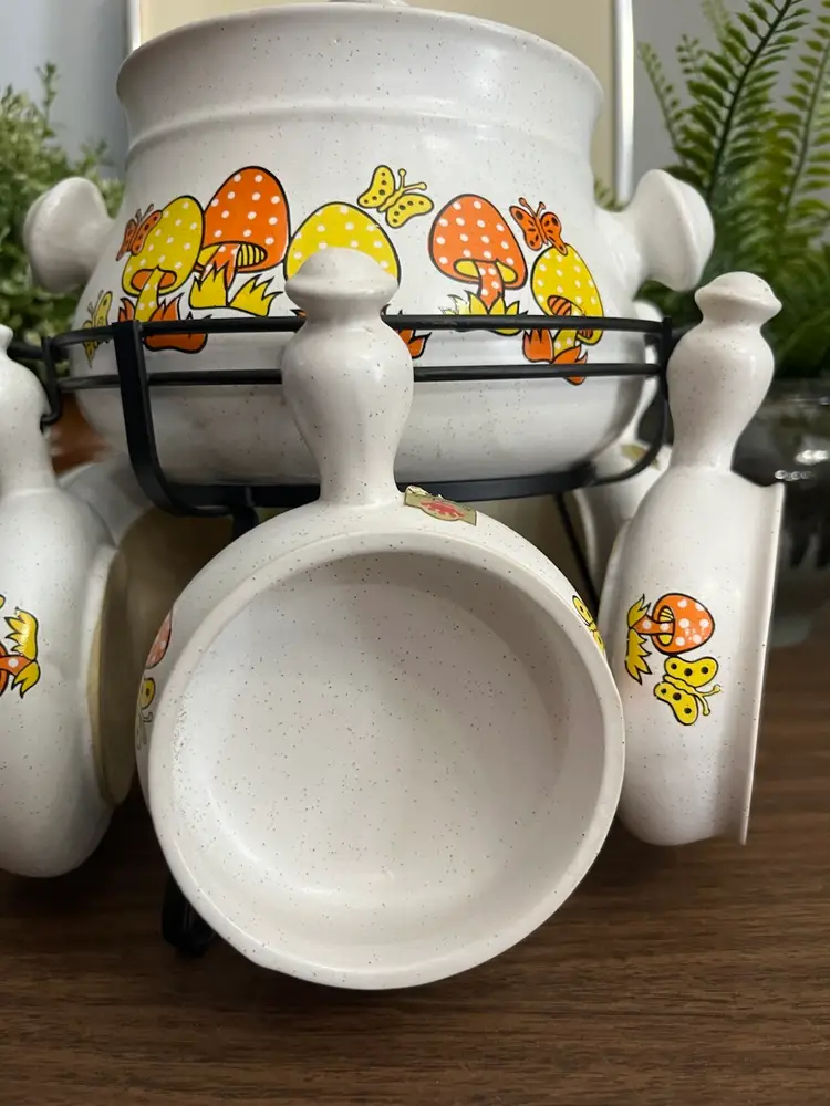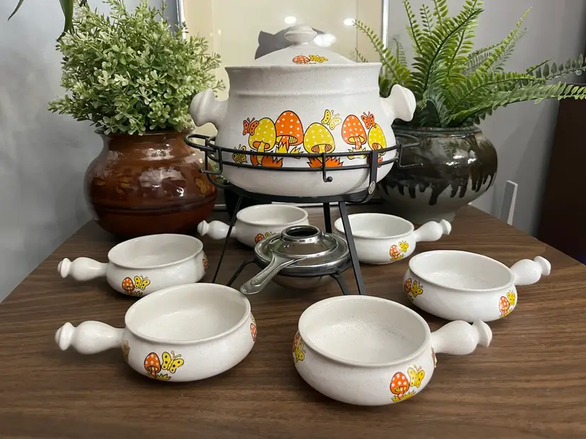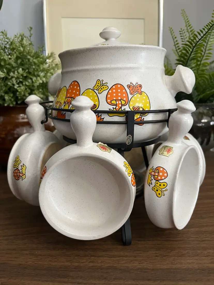 All pieces are in good preowned condition with no chips or cracks. There is some very light wear on some of the imagery on the sides of the bowls as shown, but it’s minor. Most of the pieces still have their original Royal Sealy stickers. This includes everything with the exception of some fondue skewers (could be easily replaced). The small bowls measure approximately 1.5” tall and 3.5” in diameter. The crock measures approximately 4.25” tall without the lid and 5” in diameter at the opening. Message me should you have any questions.