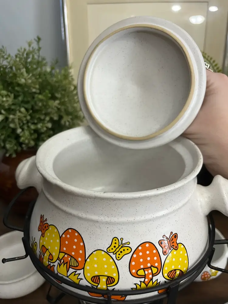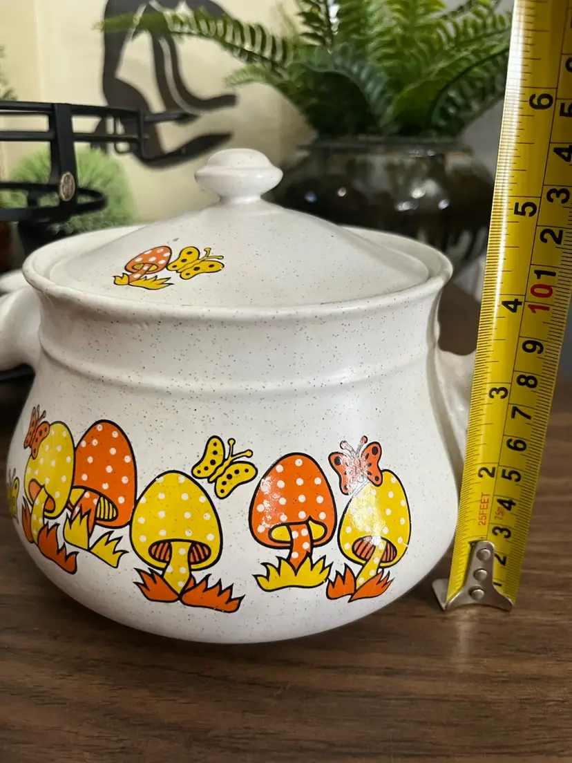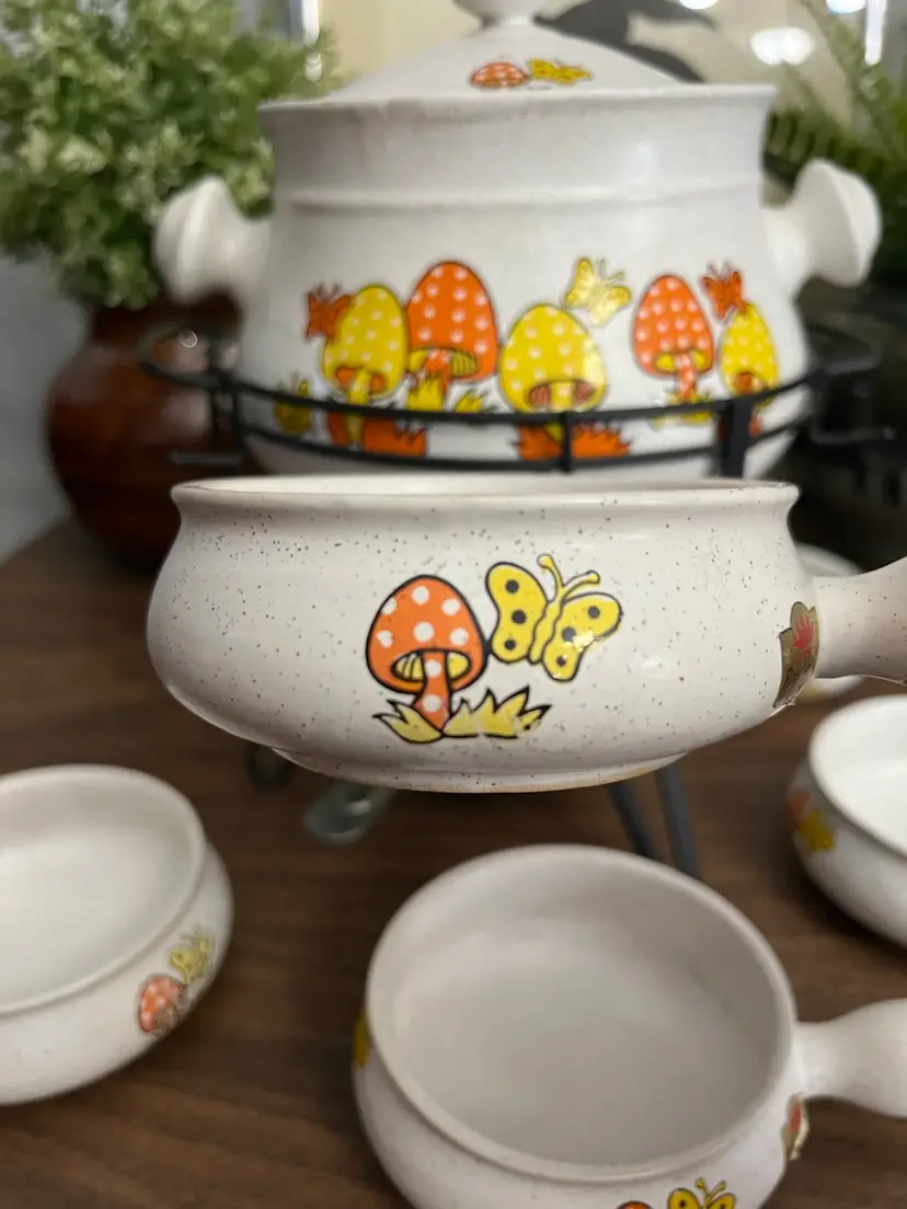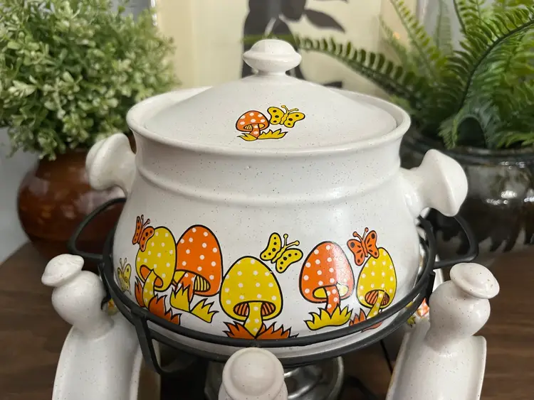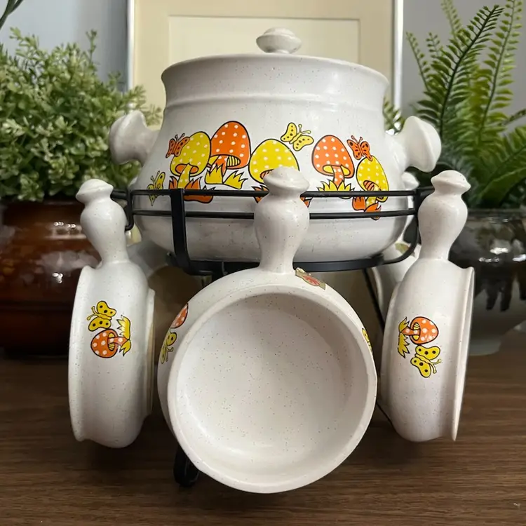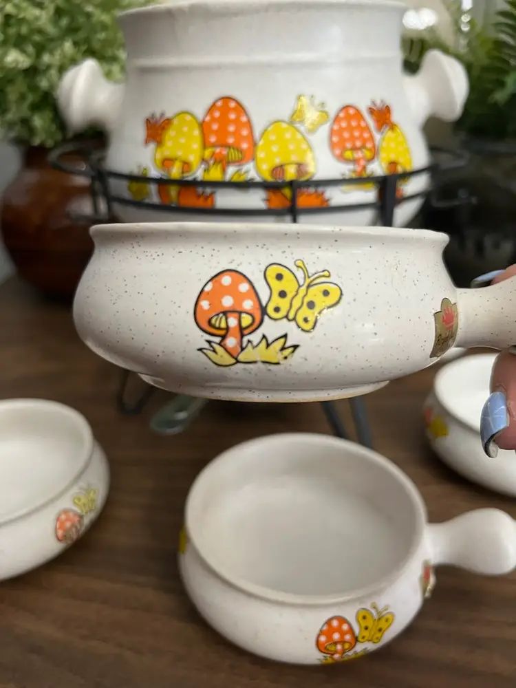 All pieces are in good preowned condition with no chips or cracks. There is some very light wear on some of the imagery on the sides of the bowls as shown, but it’s minor. Most of the pieces still have their original Royal Sealy stickers. This includes everything with the exception of some fondue skewers (could be easily replaced). The small bowls measure approximately 1.5” tall and 3.5” in diameter. The crock measures approximately 4.25” tall without the lid and 5” in diameter at the opening. Message me should you have any questions.