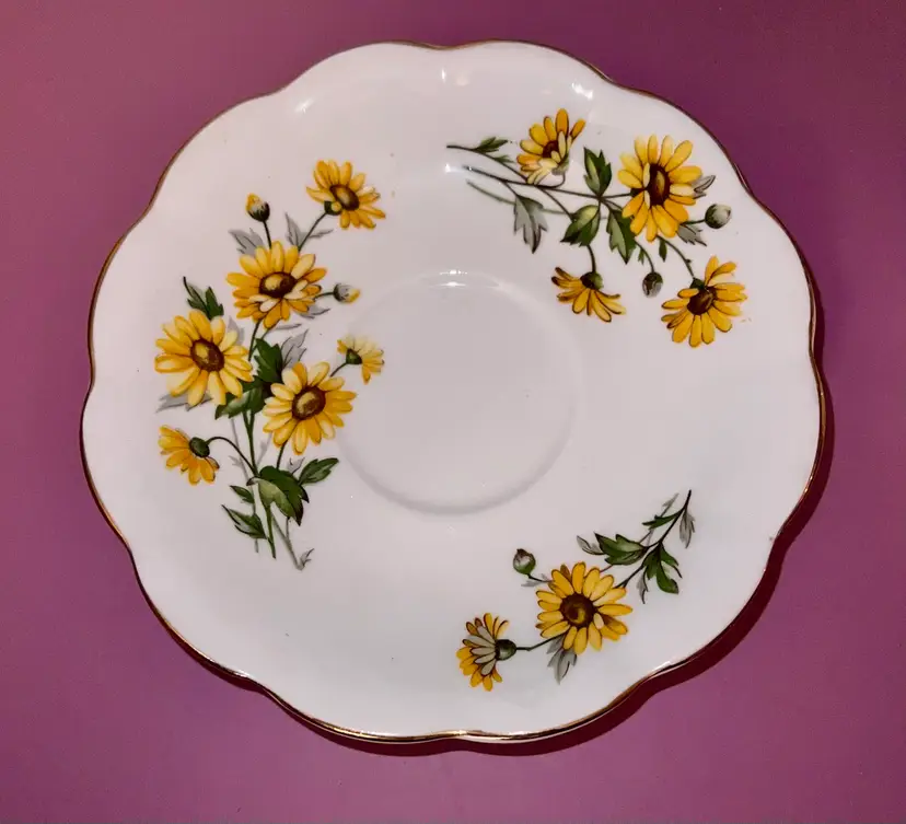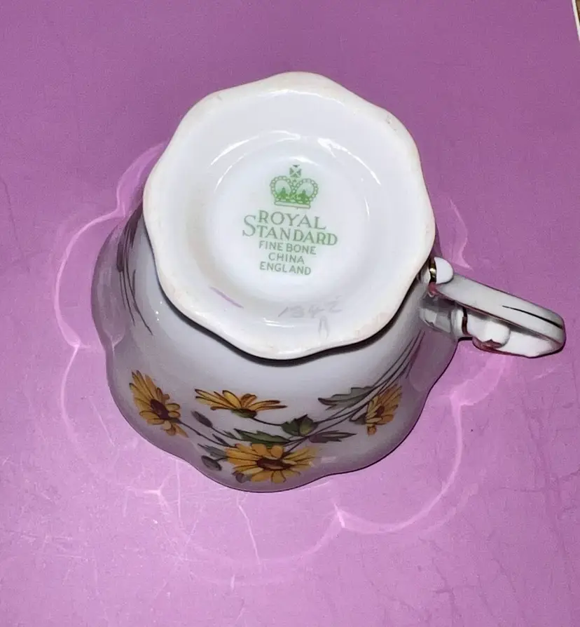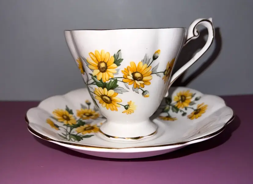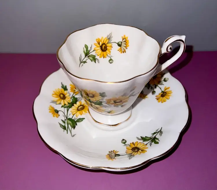 Lovely tea cup and saucer decorated with yellow brown eyed susan. Cup is 3” tall. 6” saucer. No chips or cracks. Because of age, it may have some wear on the gold trim
