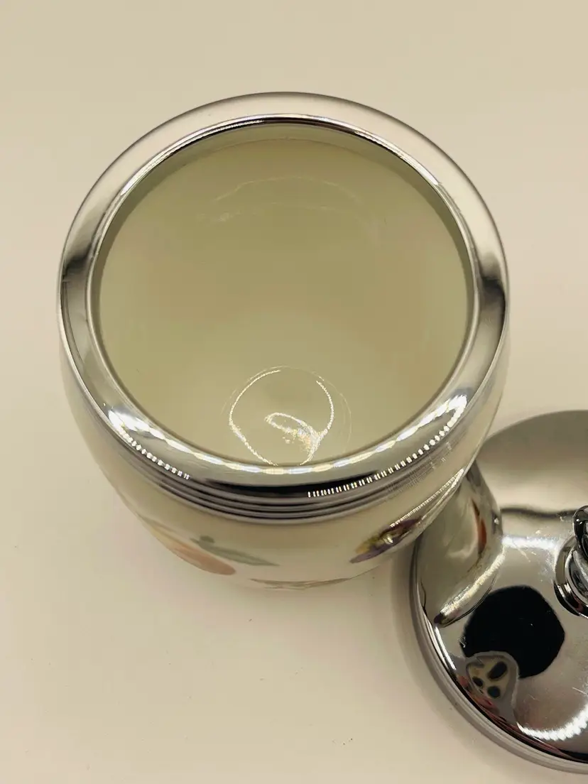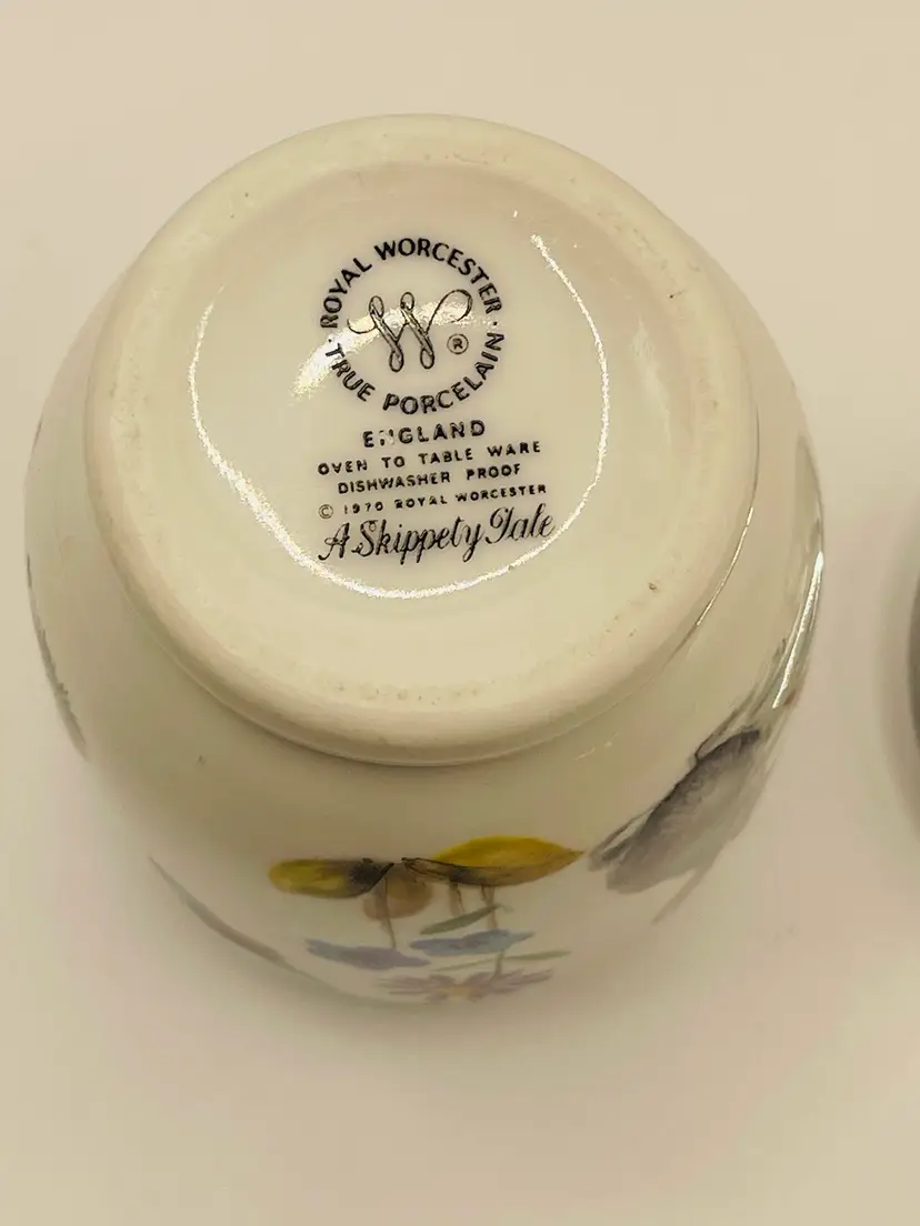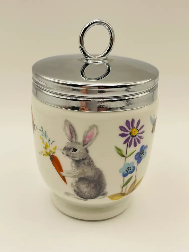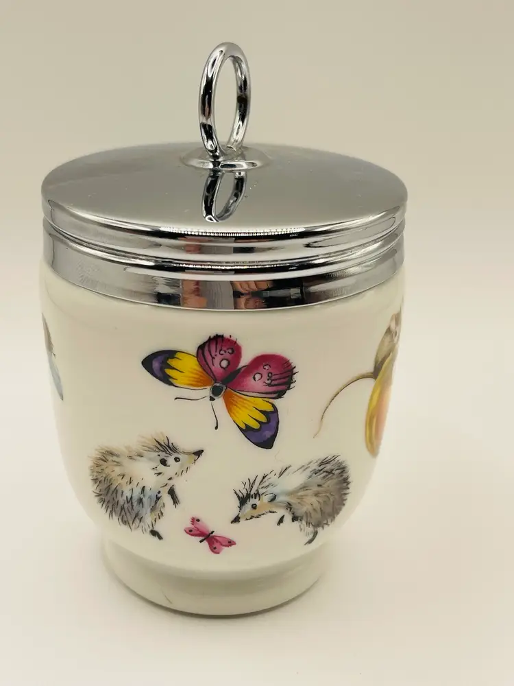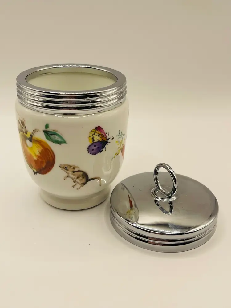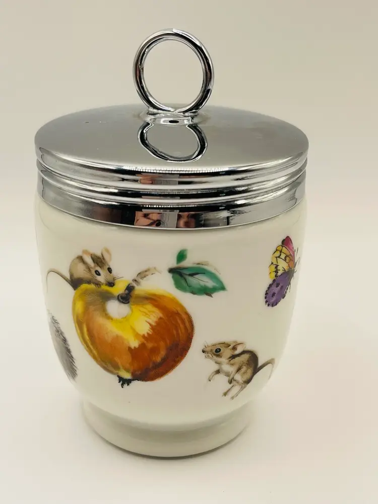 Vintage Royal Worcester Porcelain Egg Coddler. This is the Skippety Tale pattern, which features the cutest little woodland creatures! There’s a rabbit, a pair of hedgehogs, mice and some butterflies, along with fruits and veggies. This is a “king sized” egg coddler and was designed to hold two eggs. It has a screw on top, that is intact, there is a few minor surface scratches on the lid, which can be seen in the photo. This stand 4 inches tall with the lid on.