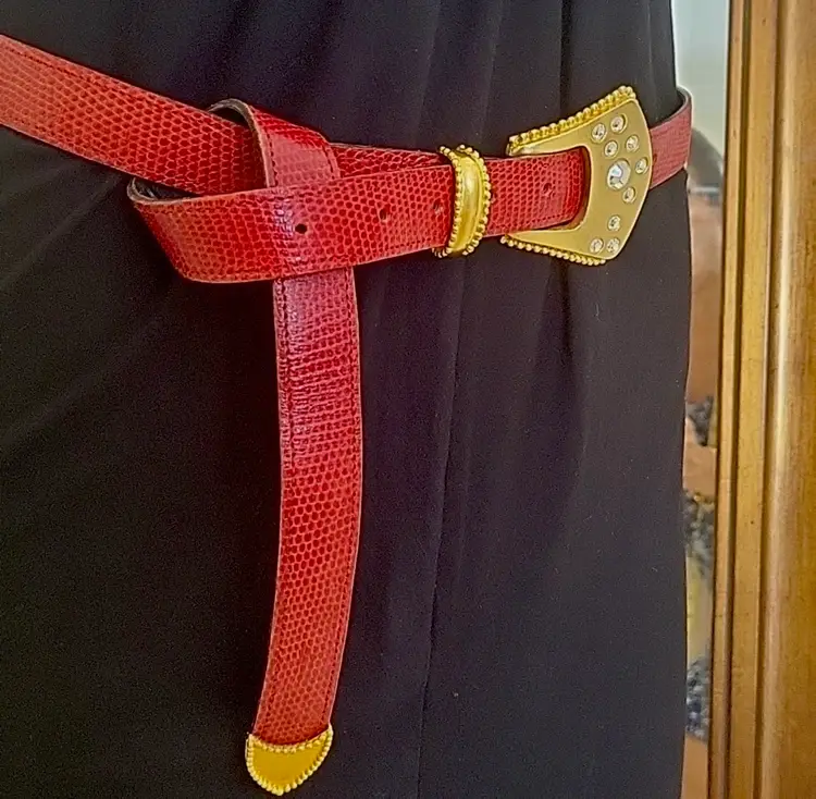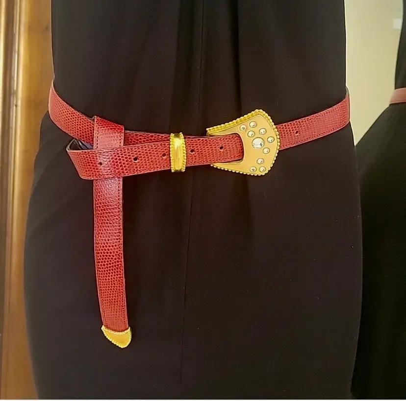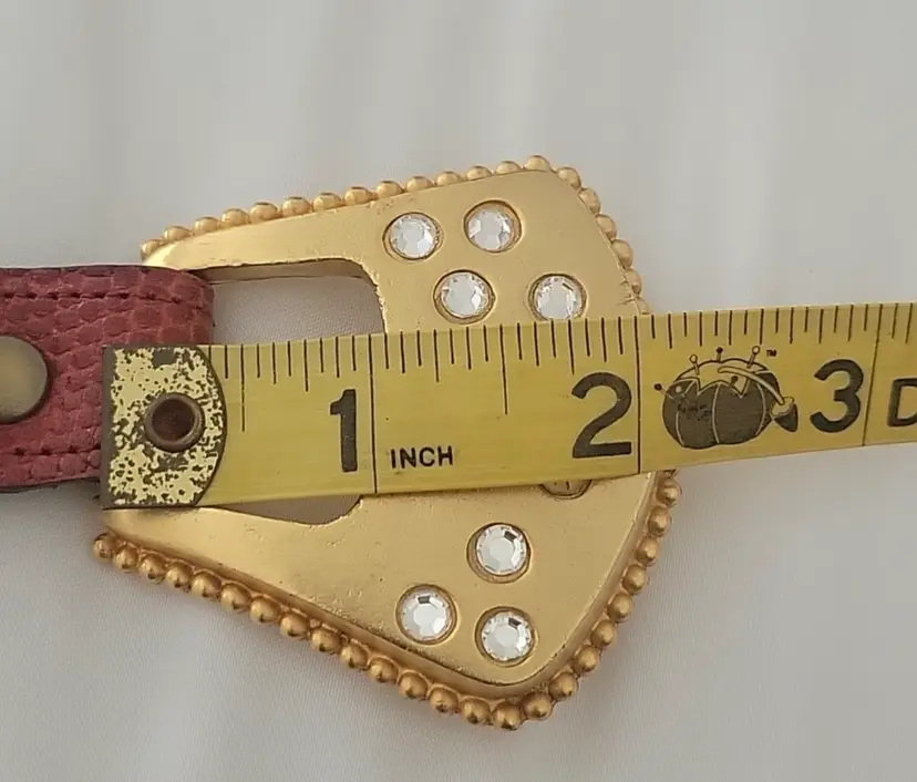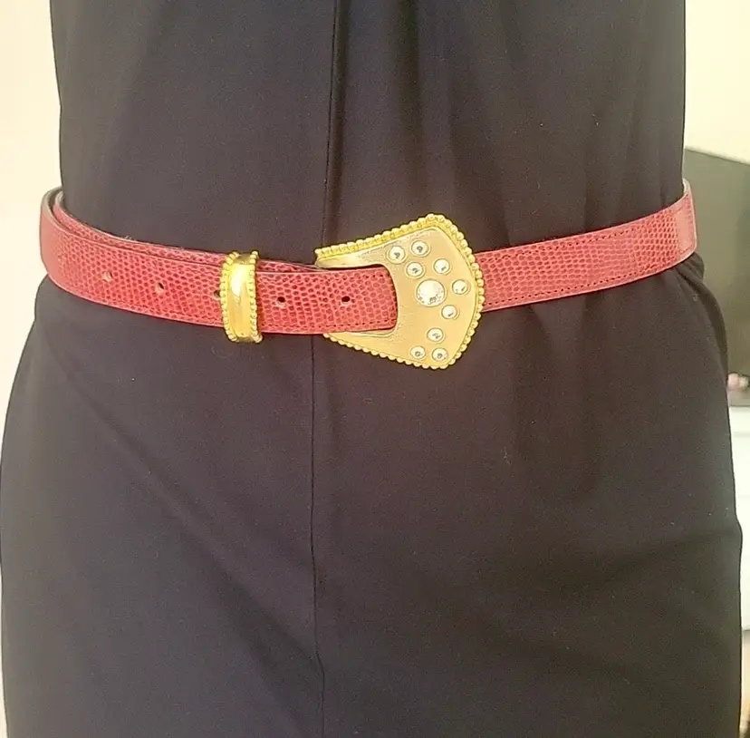 Beautiful 1970's Vintage R.Spencer Designs Red/ Gold Tone Buckle with Crystal Rhinestone Belt in excellent condition 45" total length