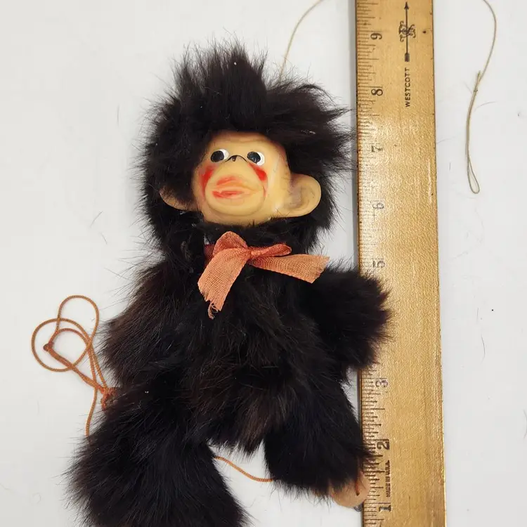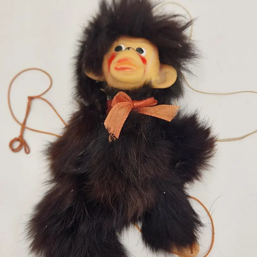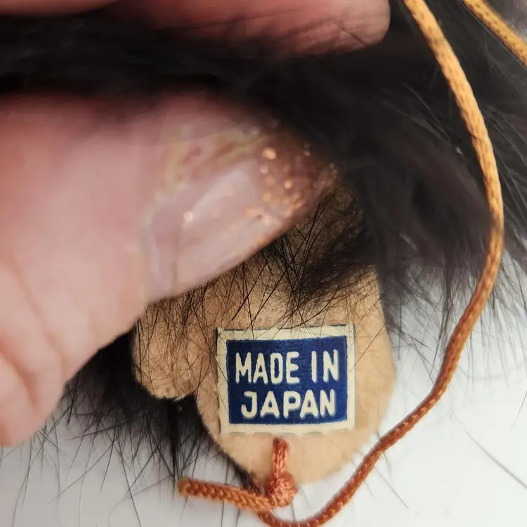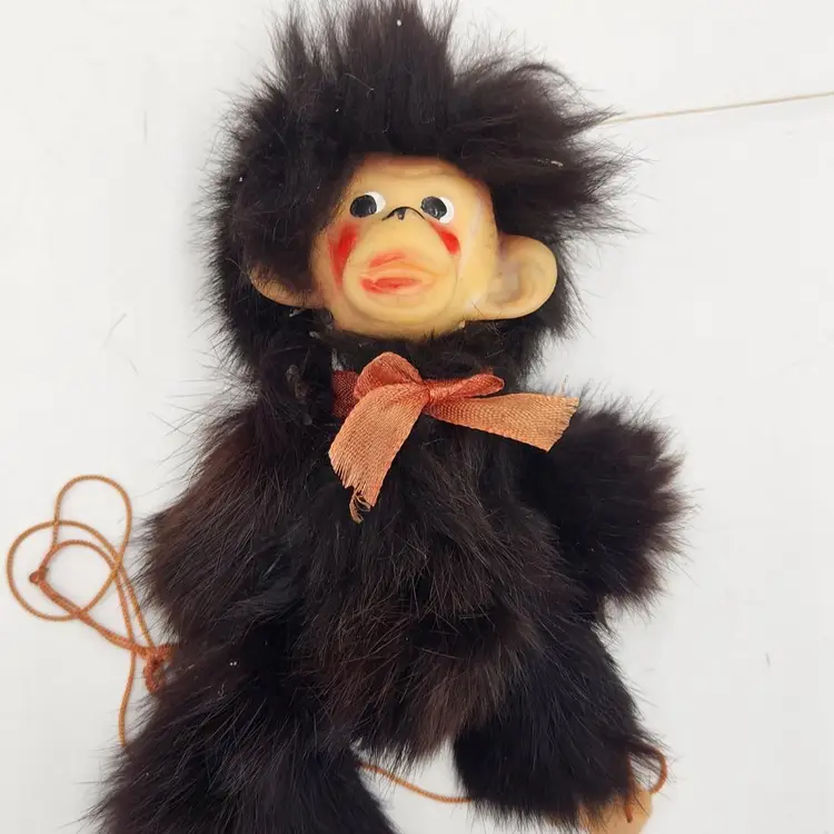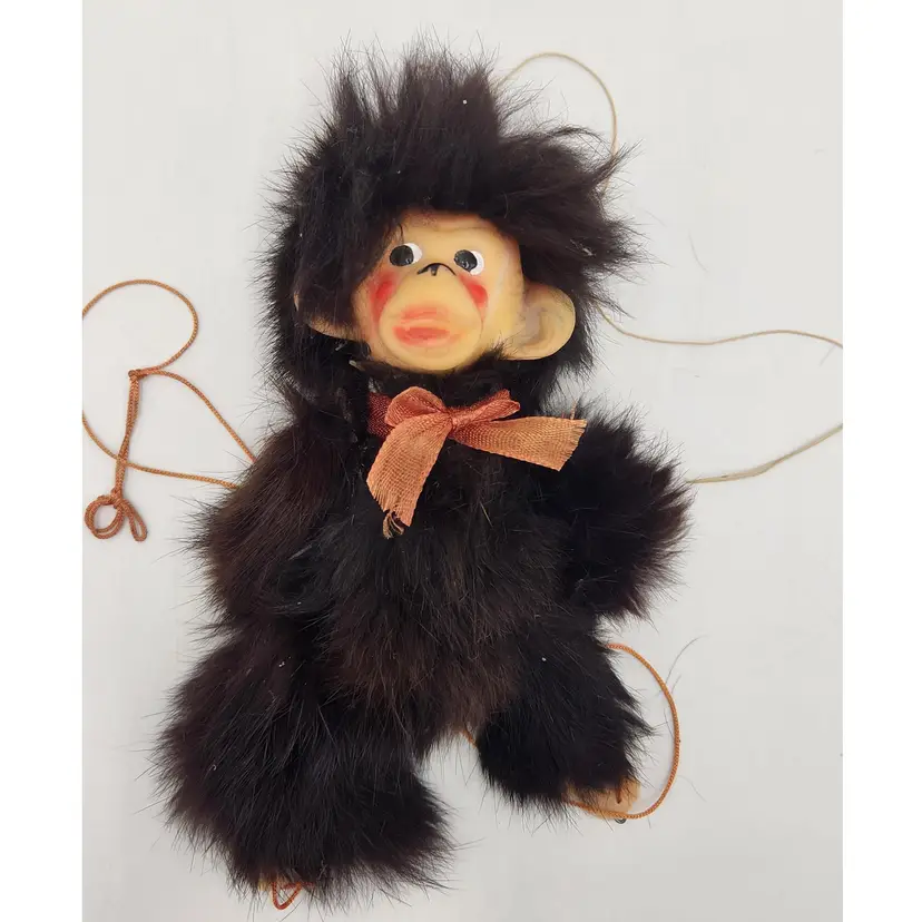 This monkey is made in Japan. The Fur is super soft. I couldn't figure out how to get the strings to work but I also didn't mess with it to much because it is old and delicate.