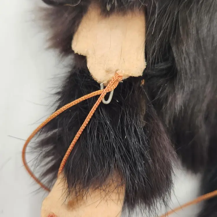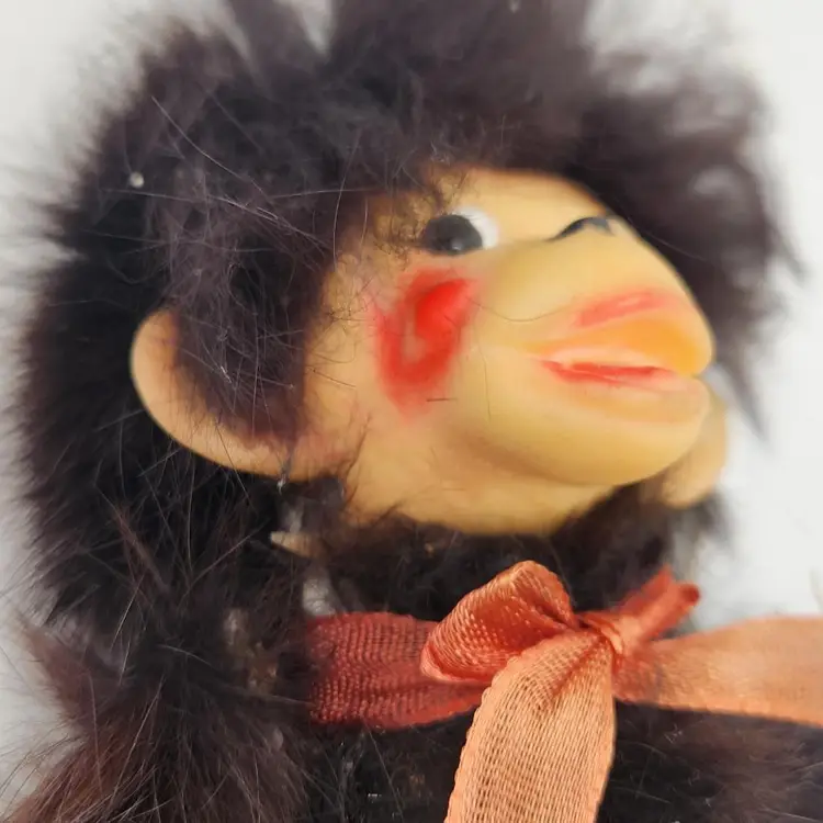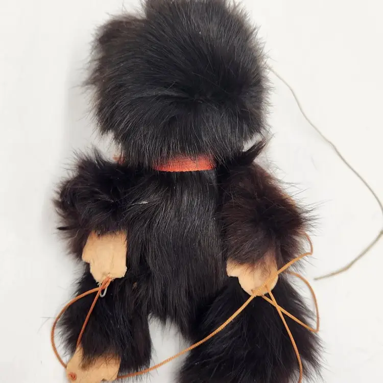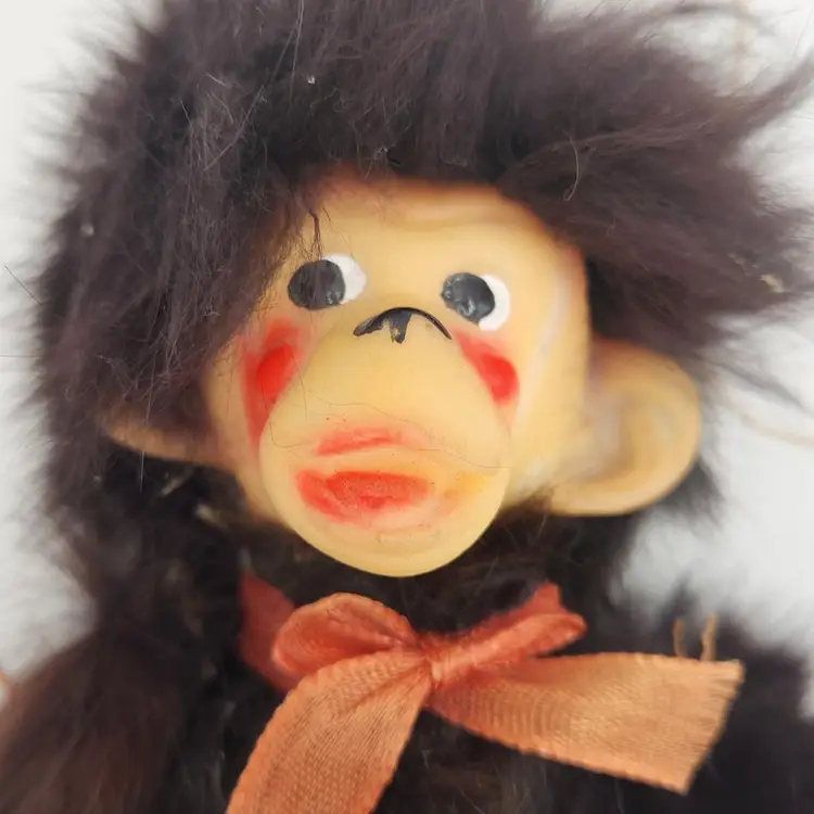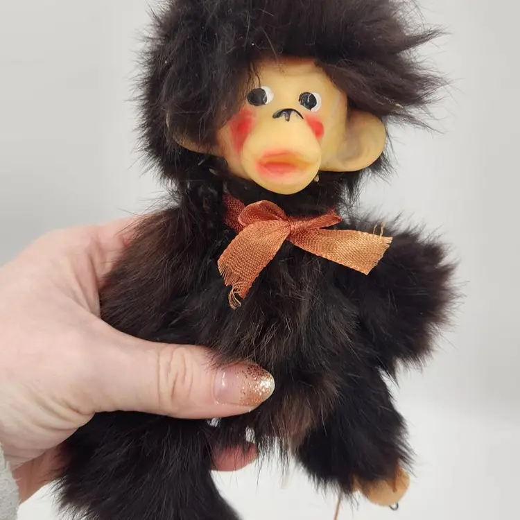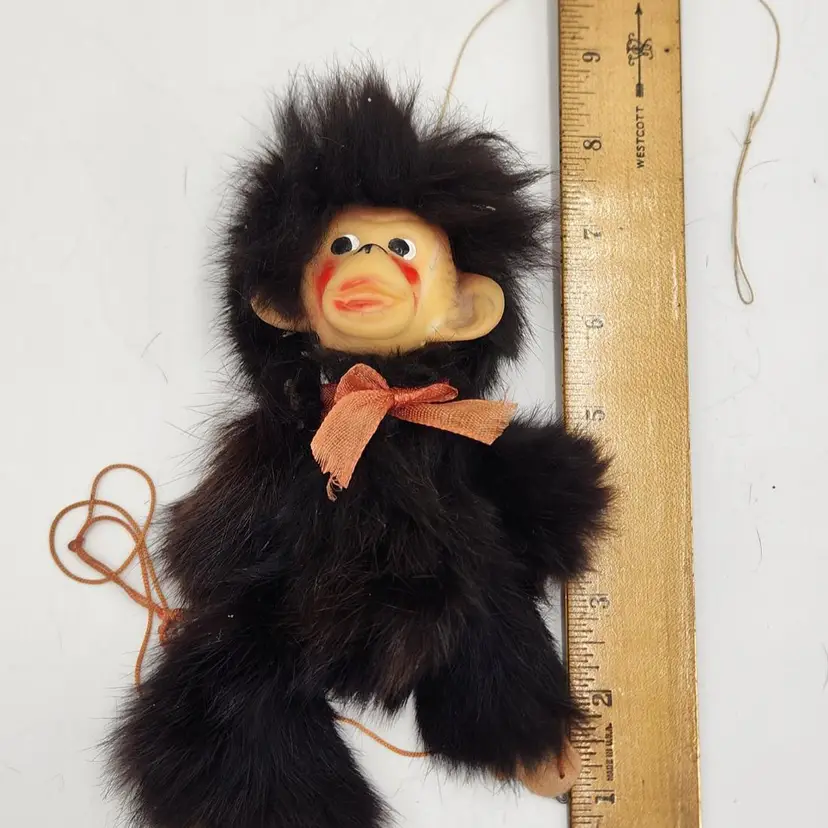 This monkey is made in Japan. The Fur is super soft. I couldn't figure out how to get the strings to work but I also didn't mess with it to much because it is old and delicate.