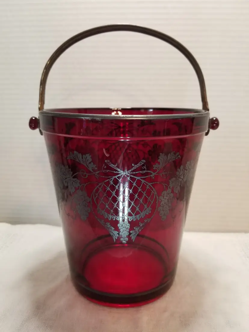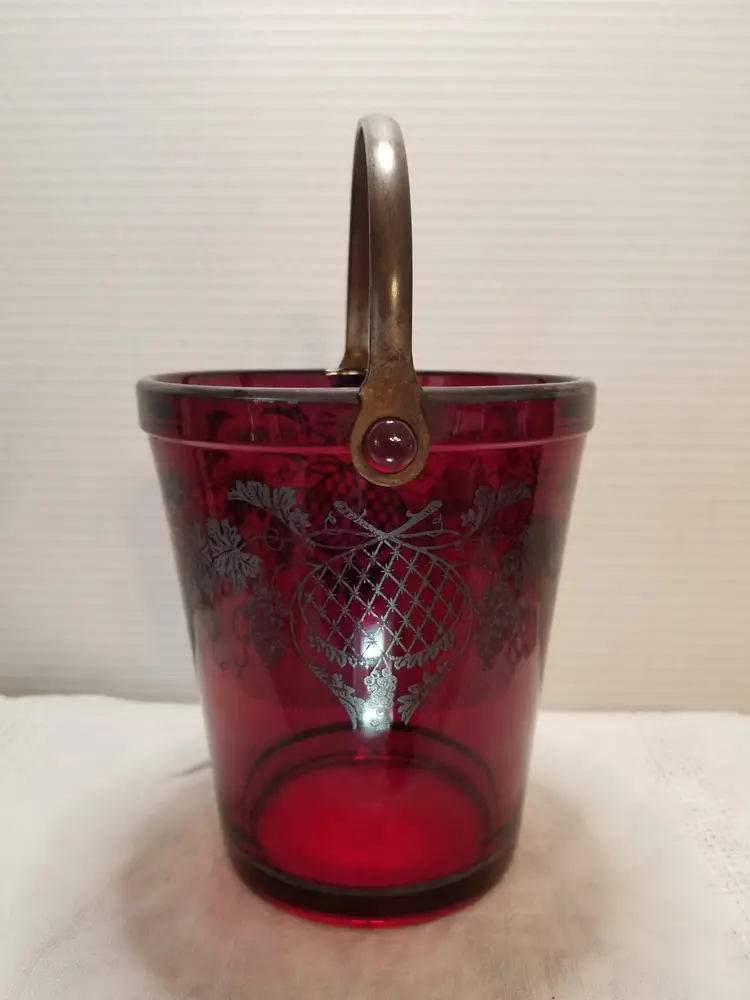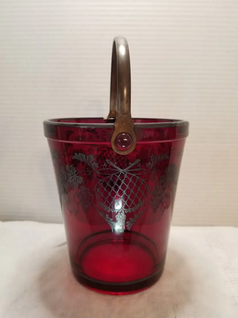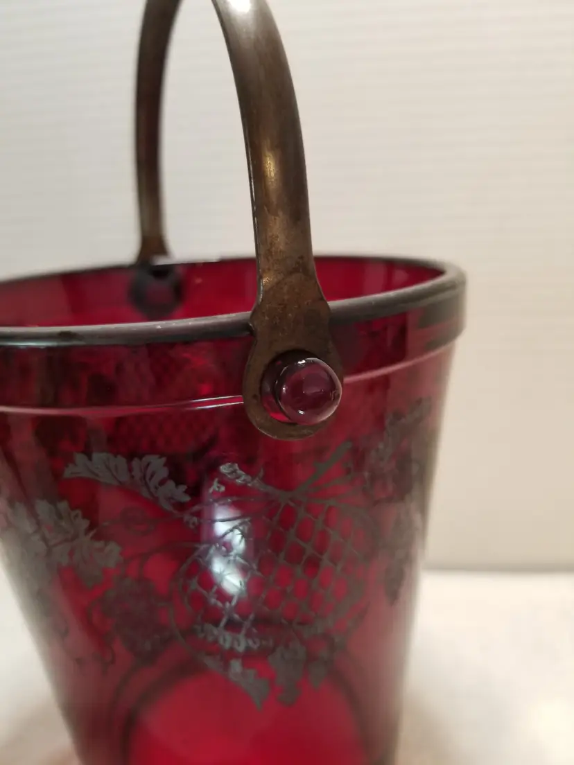 Vintage Ruby Red Depression Glass Ice Bucket is 6" tall to top of glass and 9" tall with handle extended x 6" wide. This is a pretty deep red glass ice bucket with a grape valance pattern applied in Sterling Silver. It is a pretty, quality glass with beautiful clarity. The silver overlay appears to be worn in spots, perhaps just tarnished, it is hard to tell. I did not attempt to clean the silver as I did not want to damage it. The handle could use a polish as well. No chips, cracks or repairs. Please view pictures and feel free to ask questions. Thank you for visiting my shop.