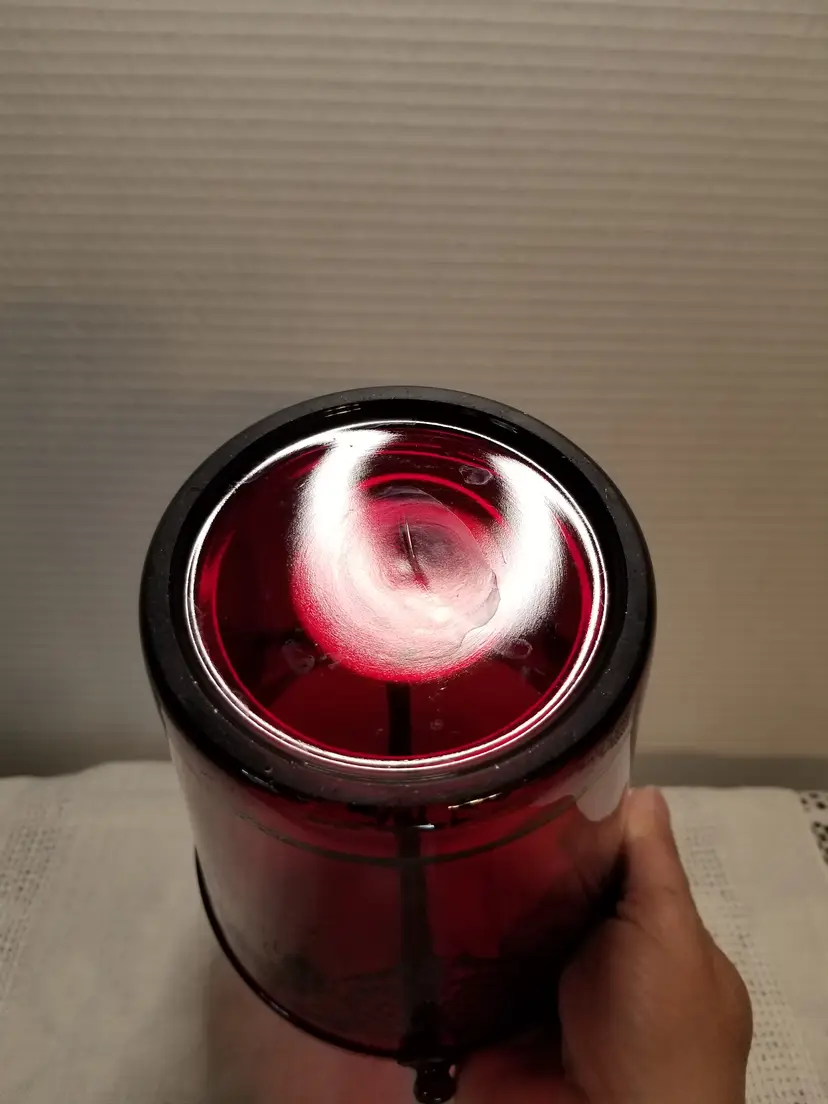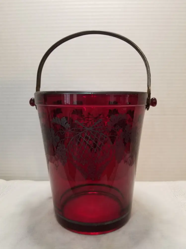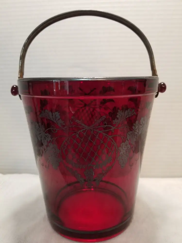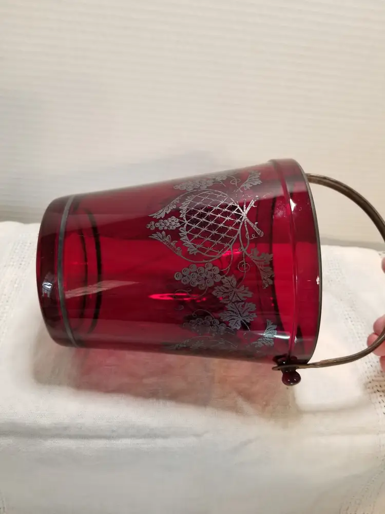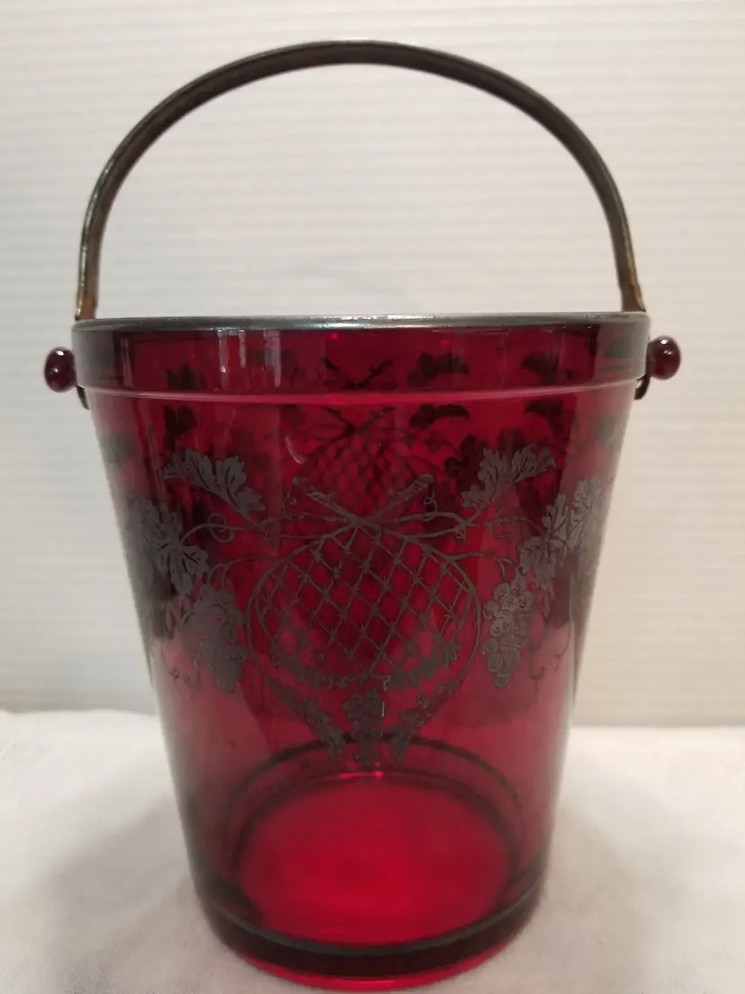 Vintage Ruby Red Depression Glass Ice Bucket is 6" tall to top of glass and 9" tall with handle extended x 6" wide. This is a pretty deep red glass ice bucket with a grape valance pattern applied in Sterling Silver. It is a pretty, quality glass with beautiful clarity. The silver overlay appears to be worn in spots, perhaps just tarnished, it is hard to tell. I did not attempt to clean the silver as I did not want to damage it. The handle could use a polish as well. No chips, cracks or repairs. Please view pictures and feel free to ask questions. Thank you for visiting my shop.