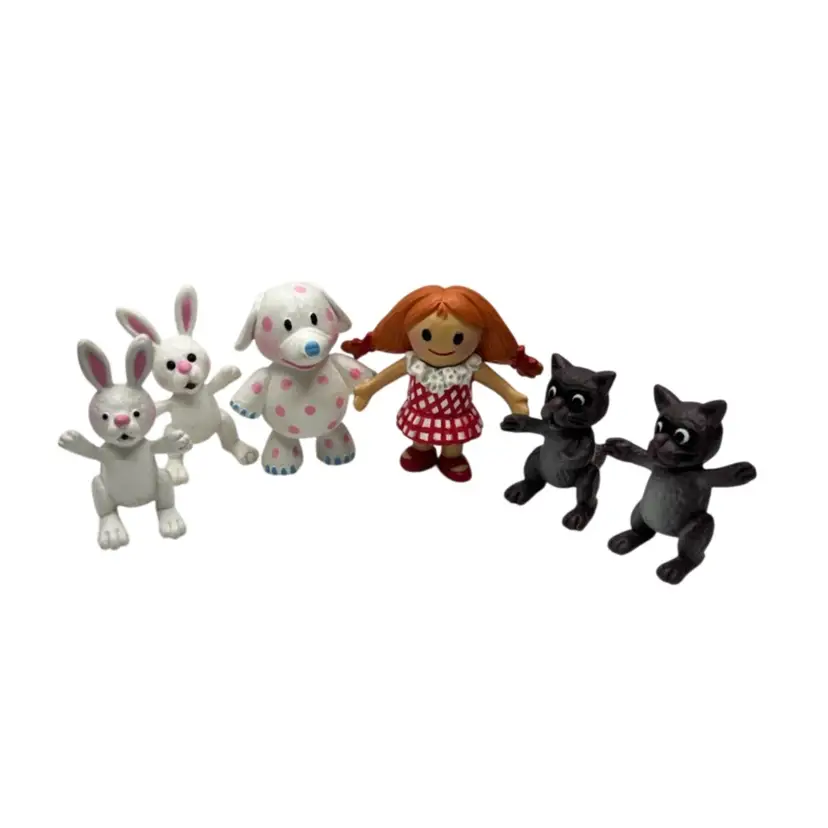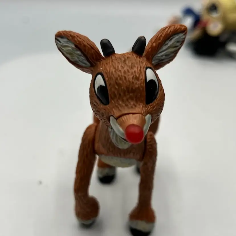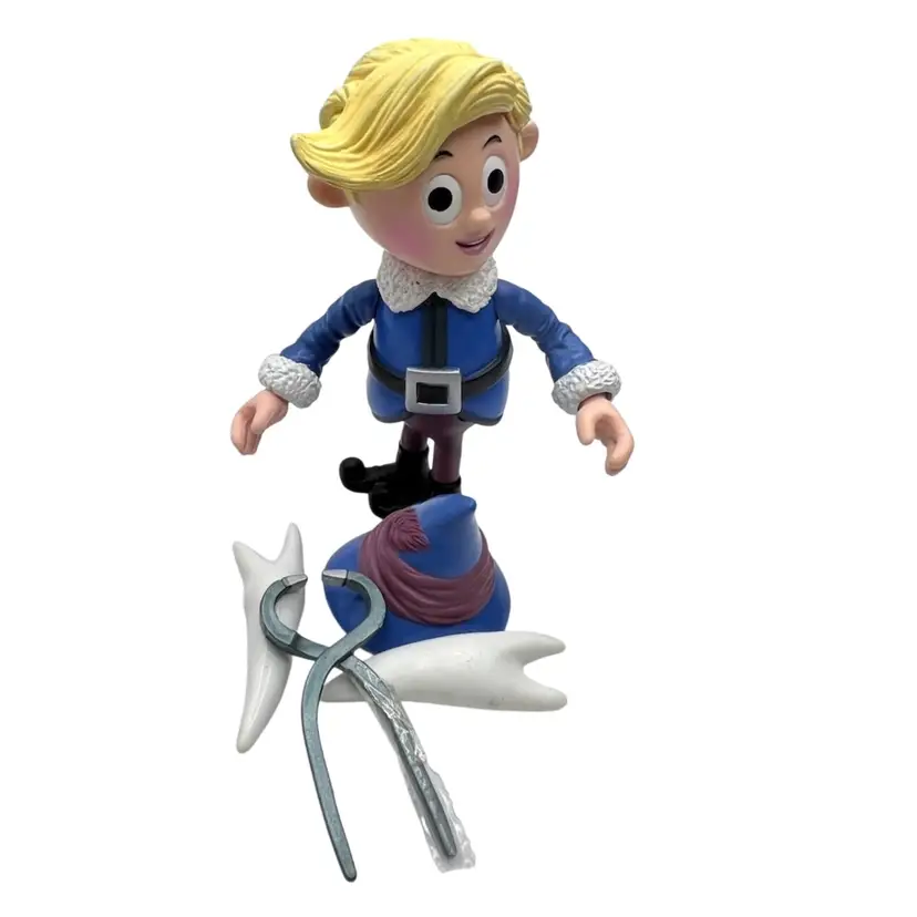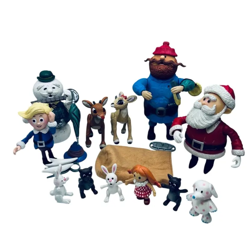 Hermes the Elf wanting to be a dentist comes with teeth and tooth puller also has his hat Santa with his hat and bag Yukon Cornelius with his earmuffs 1 snow shoe a pick axe and mallet Some misfit toys Clarice Rudolph Snowman with his umbrella and banjo also a hat