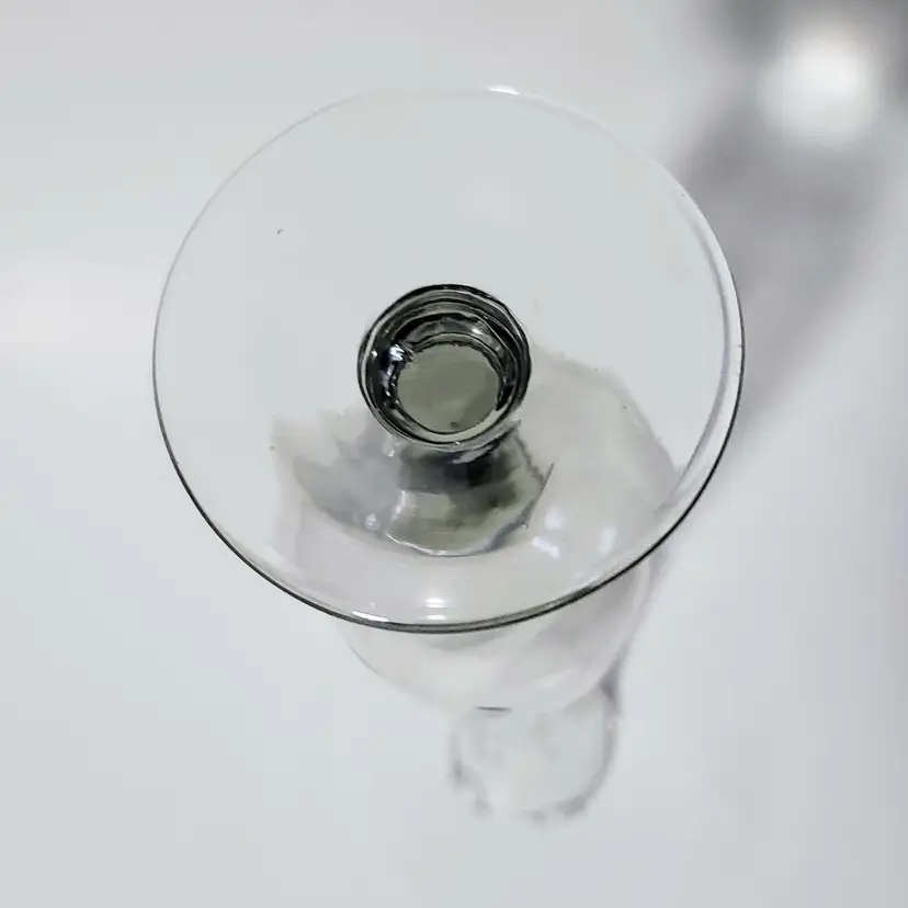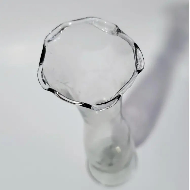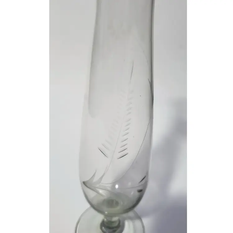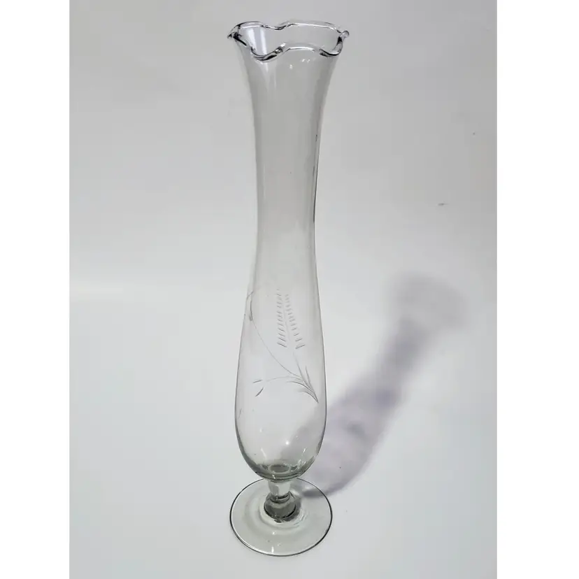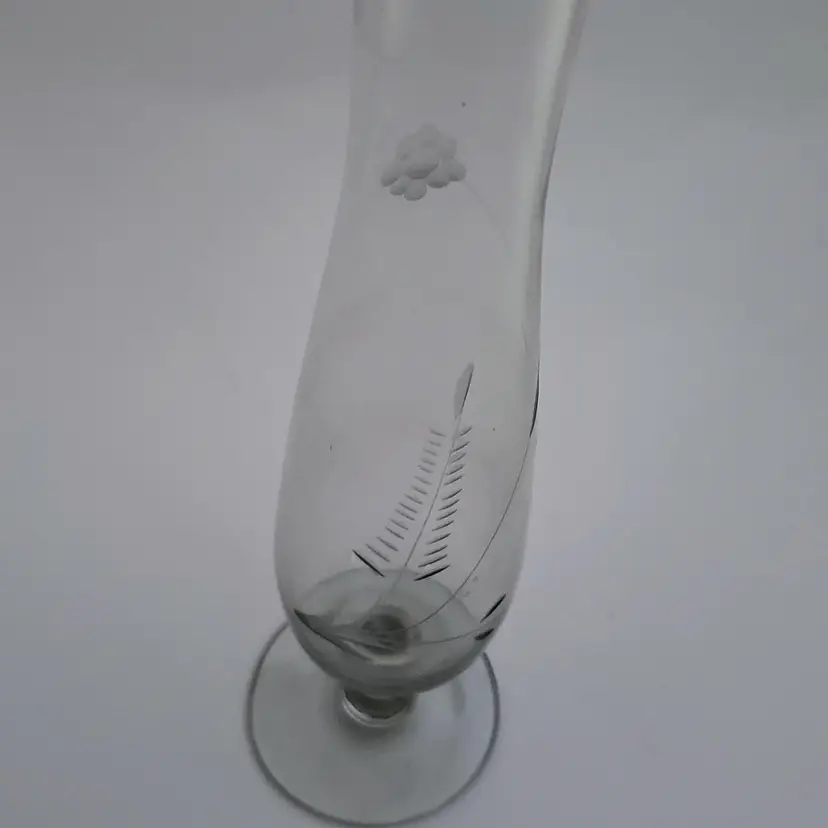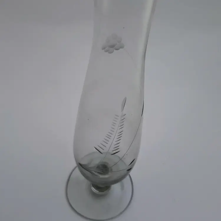 Very pretty clear etched glass bud vase. There are a couple of bubbles that make it clear this was stretched glass and not crystal. Nice etched floral design, I purposely cast a shadow on it in the last picture to make the etching show up better. Thin and delicate, but in perfect condition with no chips or cracks. 10in tall.