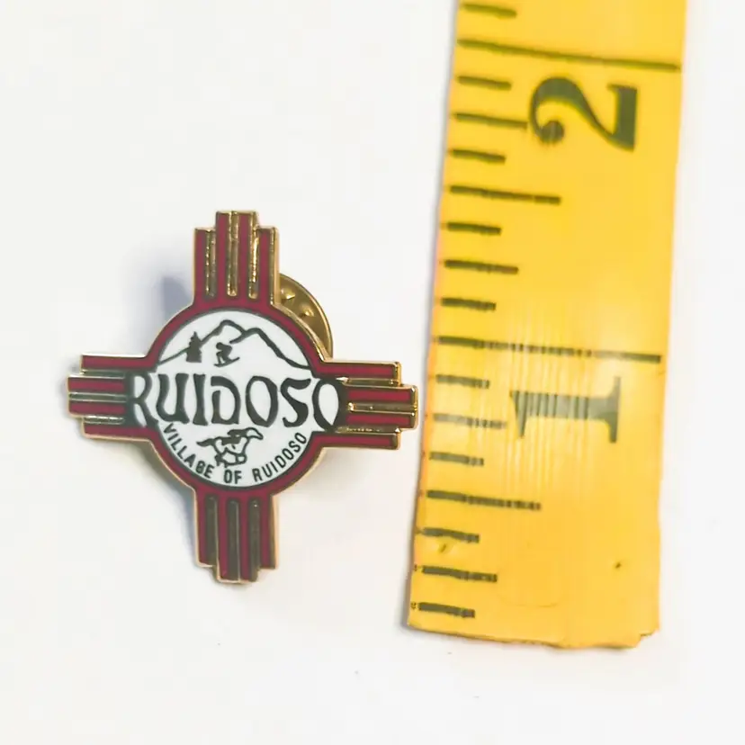Vintage Ruidoso Village Of Ruidoso Enamel Lapel Pin Zia Symbol. Condition is preowned. Celebrate the charm of Ruidoso with this vintage enamel lapel pin. (FC03)