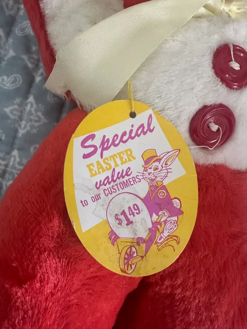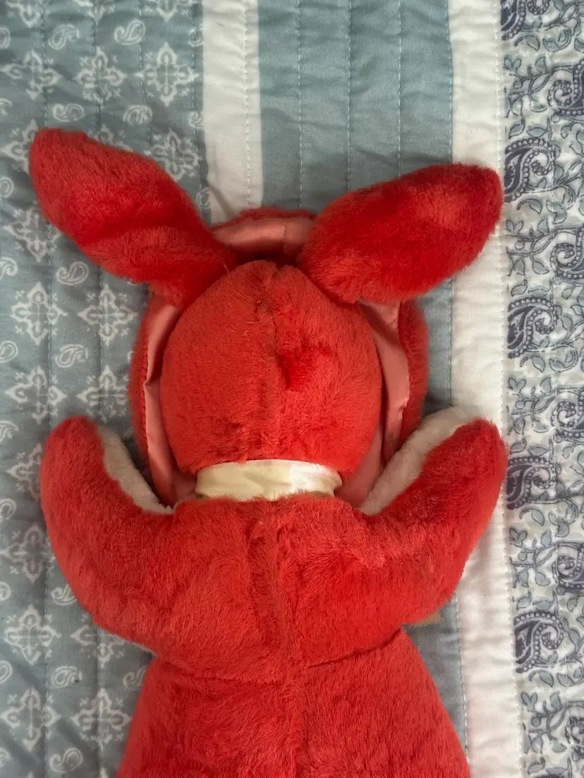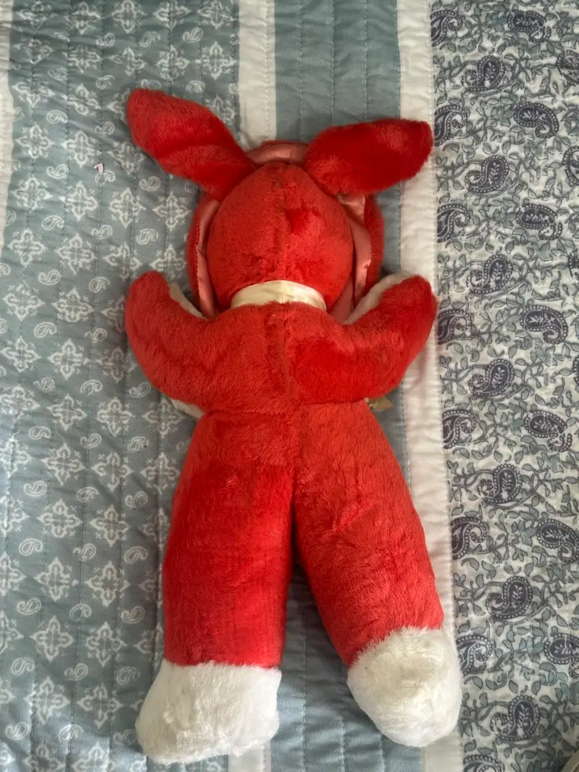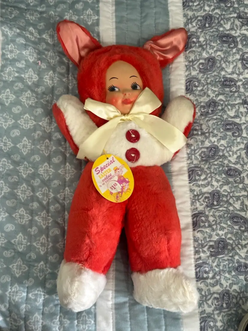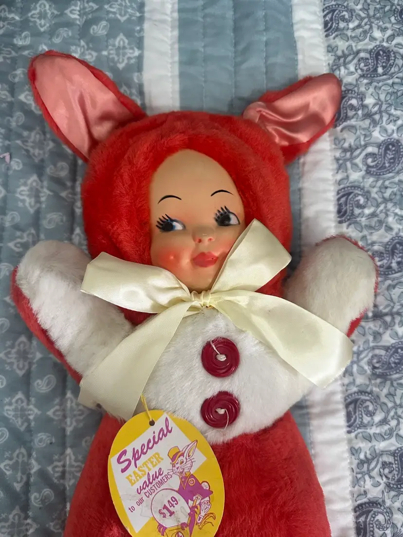 This vintage 15" Bunny Doll by Rushton ? is a charming addition to any collection. The doll features a rubber face and blue eyes. She is dressed as an Easter Bunny. This doll is in excellent condition and is perfect for all occasions. The doll is an original and was manufactured in Japan in the 1960s. This doll does not have a Rushton marking