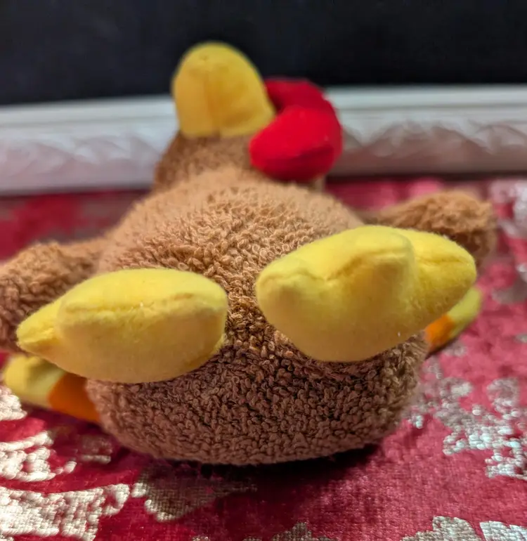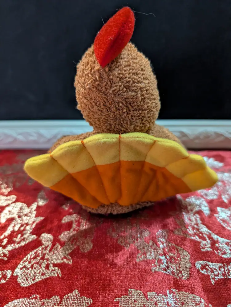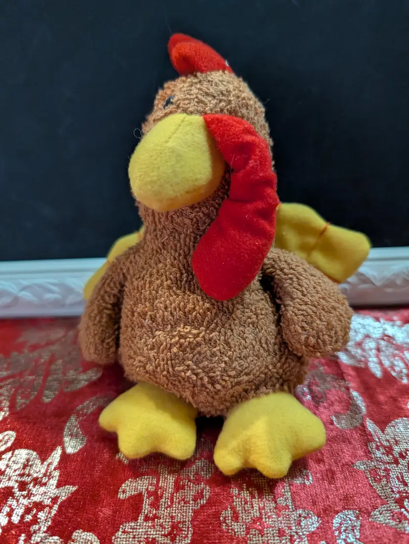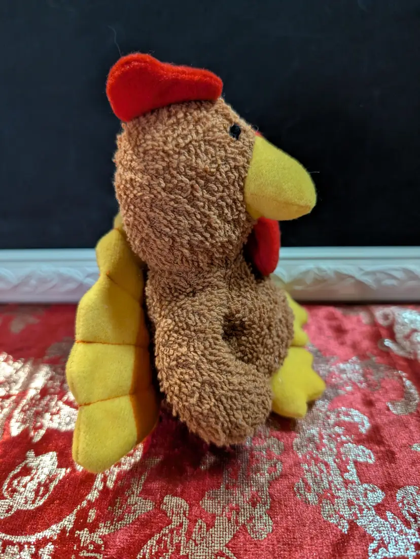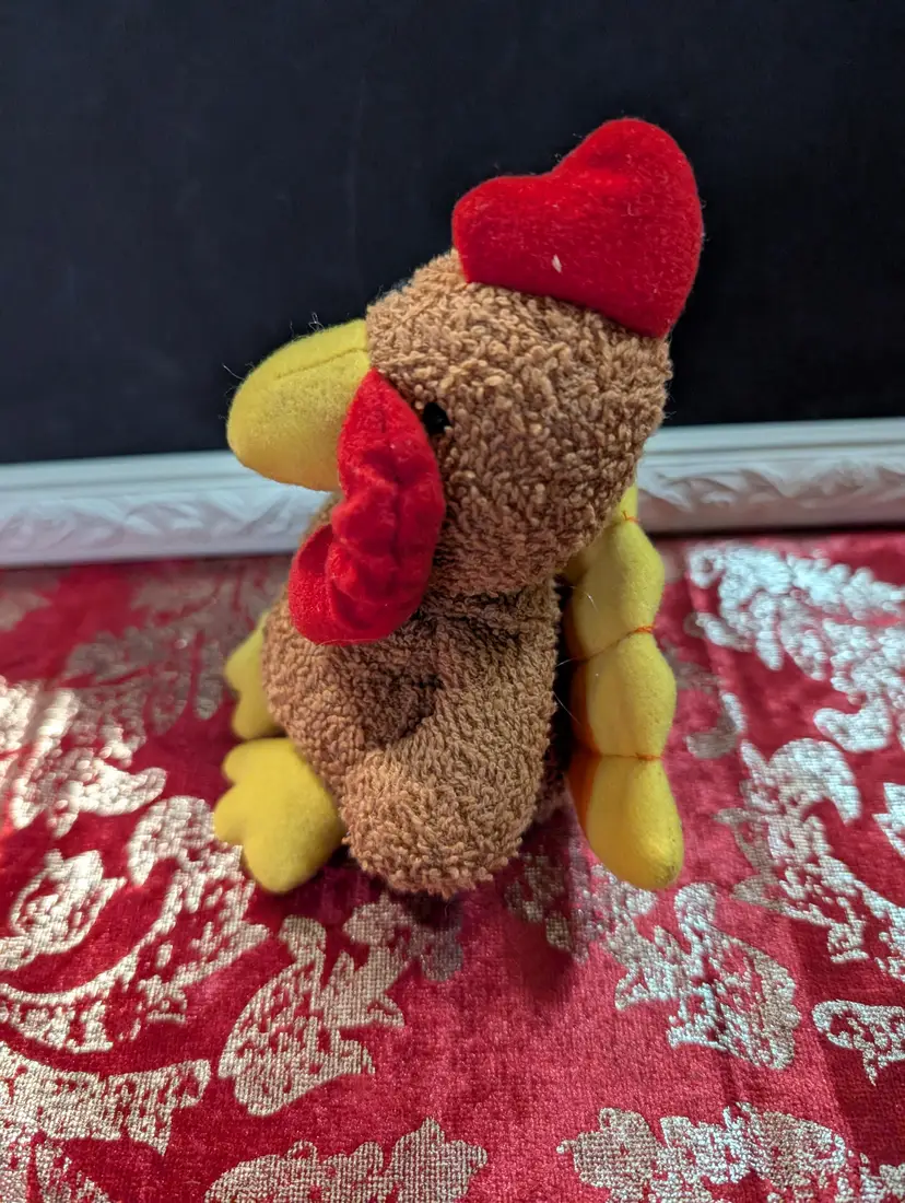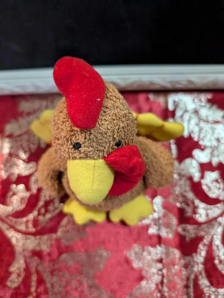 Adorable vintage Russ plush chicken toy featuring a vibrant red comb and yellow beak and feet. This charming collectible is in great condition, perfect for adding a touch of whimsy to your vintage toy collection or as a nostalgic gift. Measures approximately 8 inches tall.