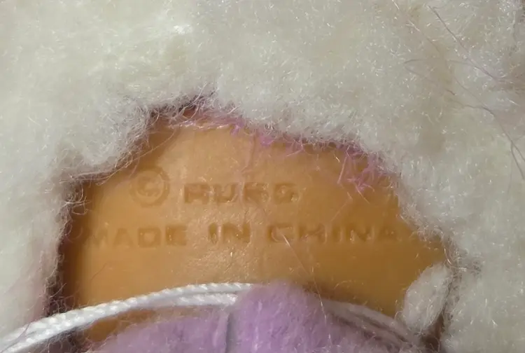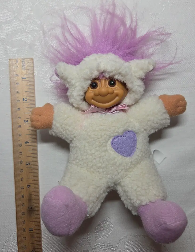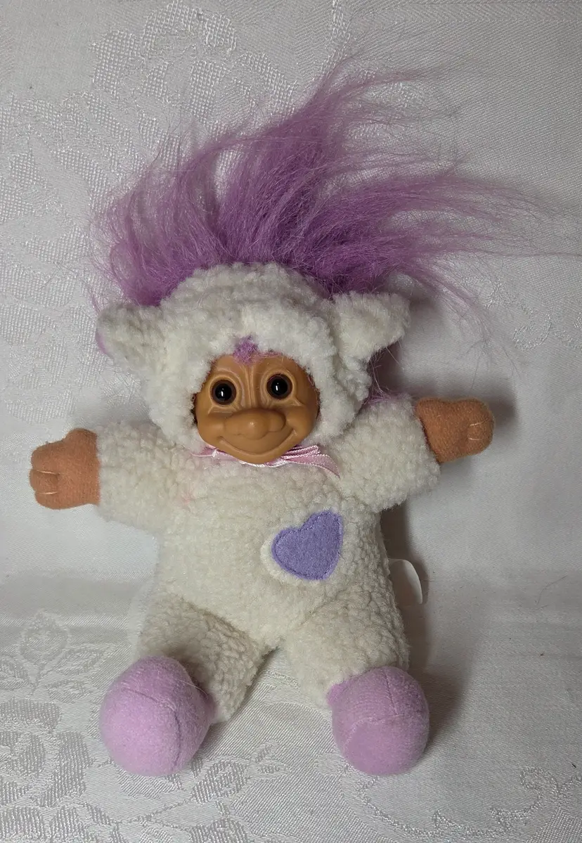 The Vintage Russ Troll Doll is an 8" plush doll with a soft body, featuring purple hair and brown eyes. This Easter-themed lamb sheep doll was manufactured in China during the 1990s by Russ, making it an original vintage piece. The set includes the doll only, perfect for collectors or those looking to add a unique and nostalgic touch to their doll collection.