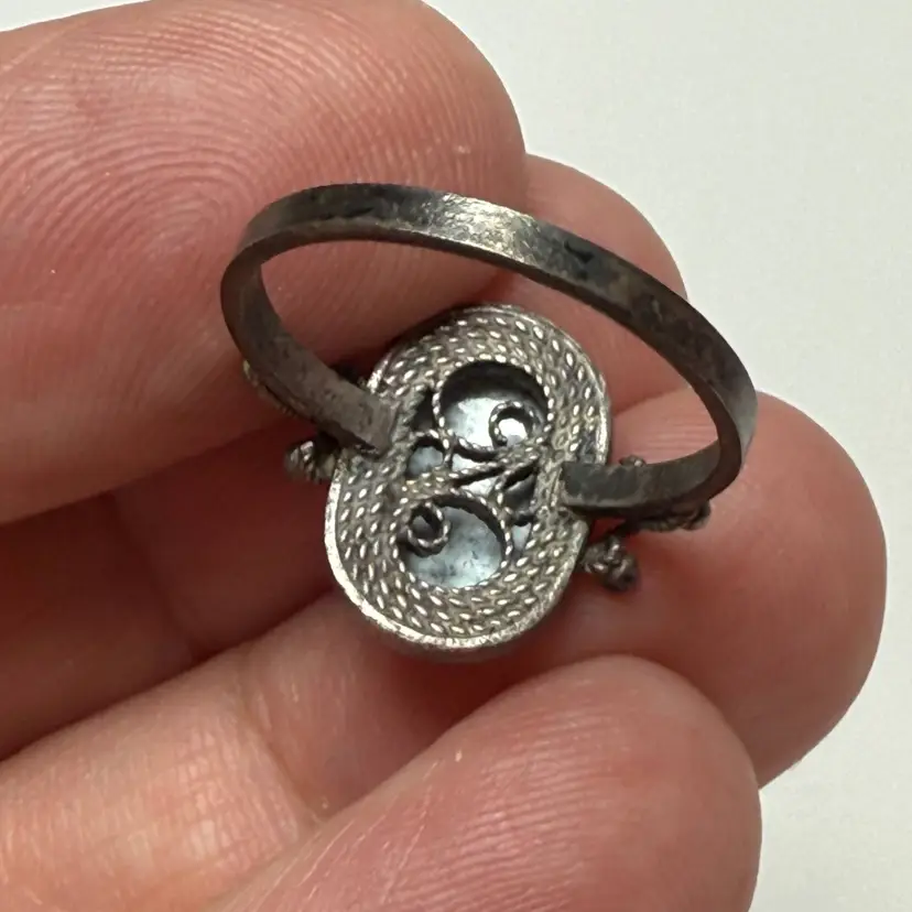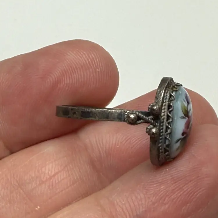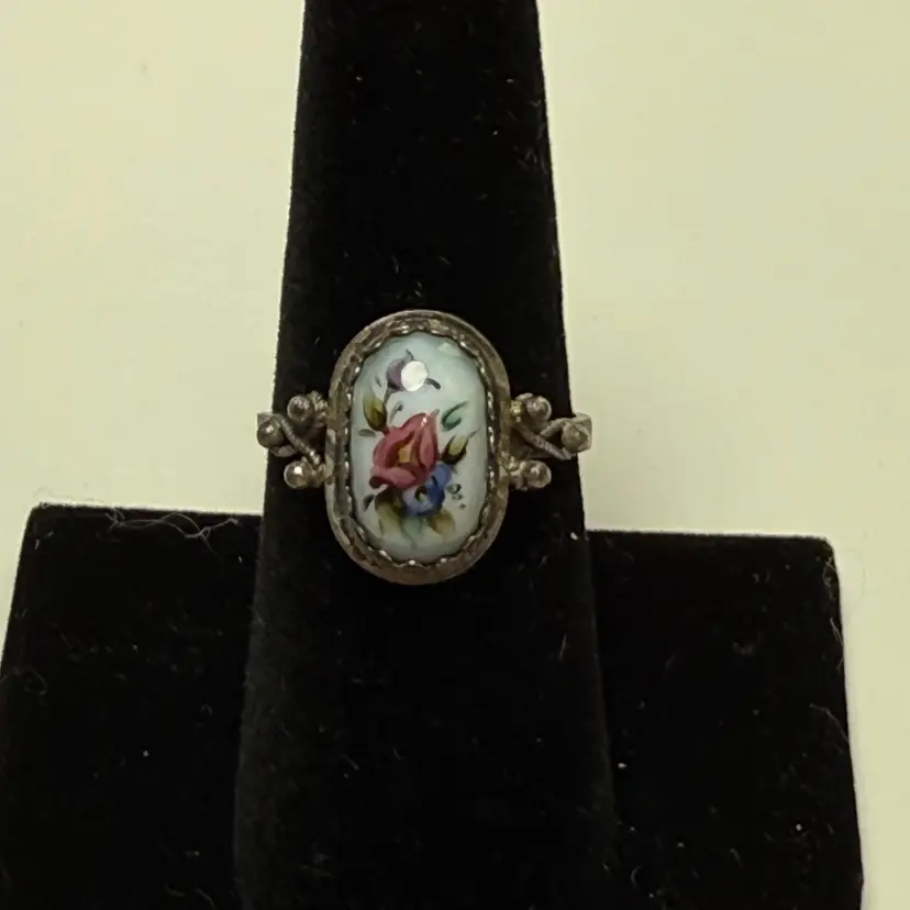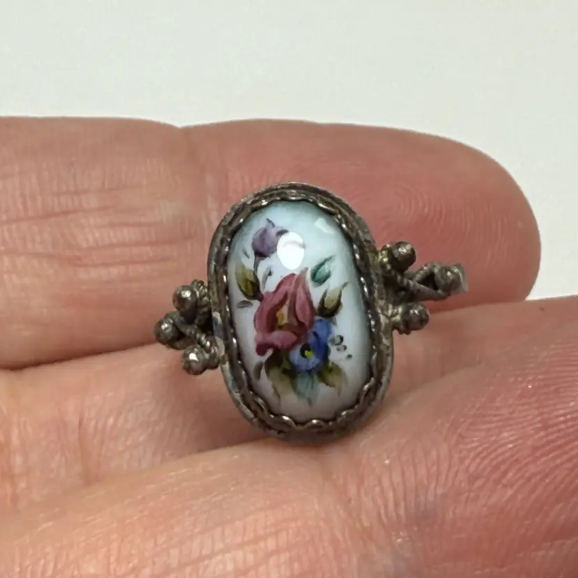 Vintage Russian Finift Rostov Ring Size 7.5 Hand Painted Fired Enamel Roses Floral. I am unsure of the metal composition but may be 800 silver. The central oval features a miniature hand painted floral design on fired enamel. Great condition. No issues. Patina on metal.