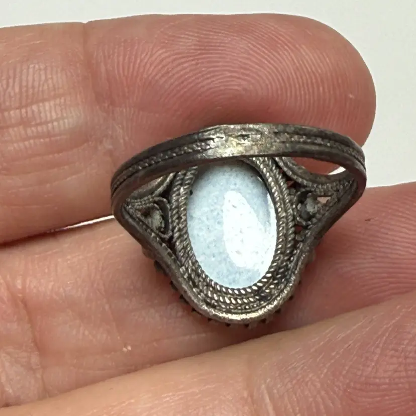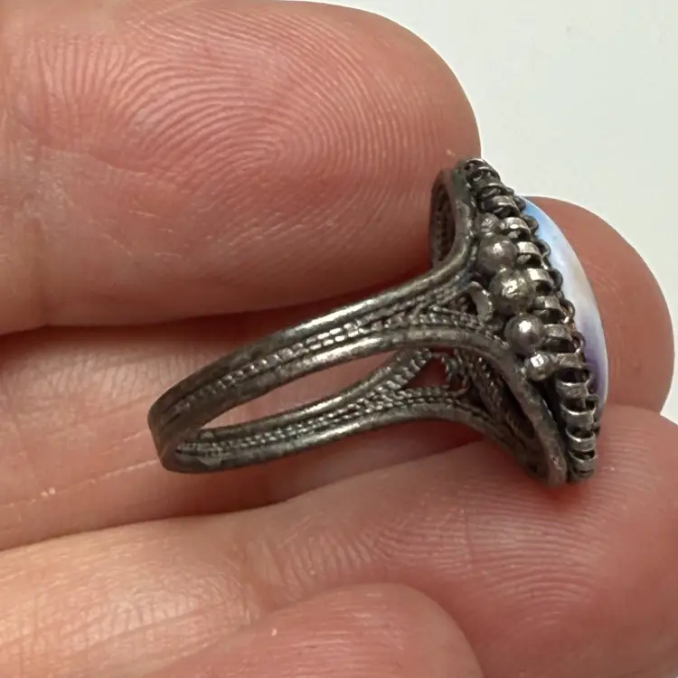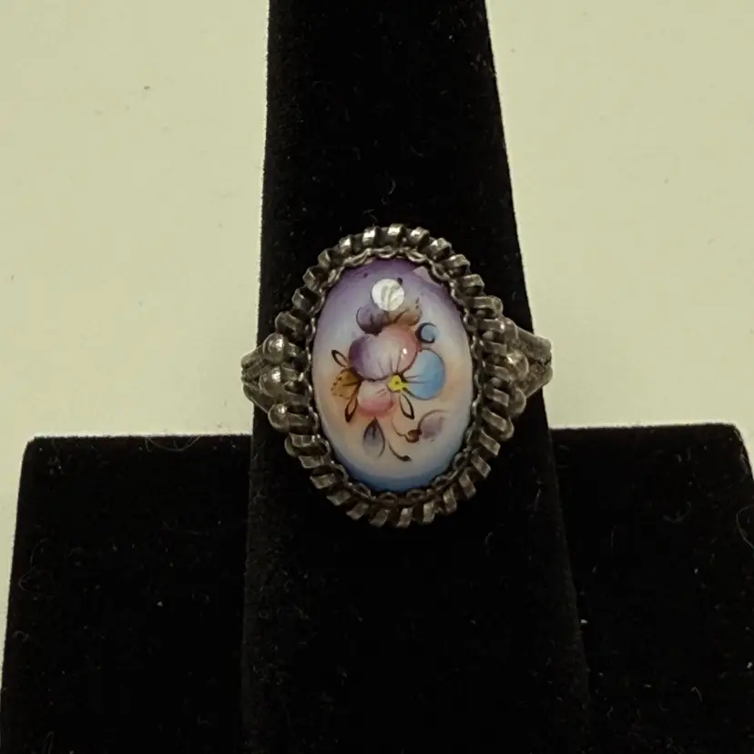 Vintage Russian Finift Rostov Ring Size 8 Hand Painted Fired Enamel Pansy Floral. I am unsure of the metal composition but may be 800 silver. The central oval features a miniature hand painted floral design, specifically a pansy flower, known in the Victorian language of flowers to symbolize thoughtfulness or remembrance. Great condition. No issues. Patina on metal.