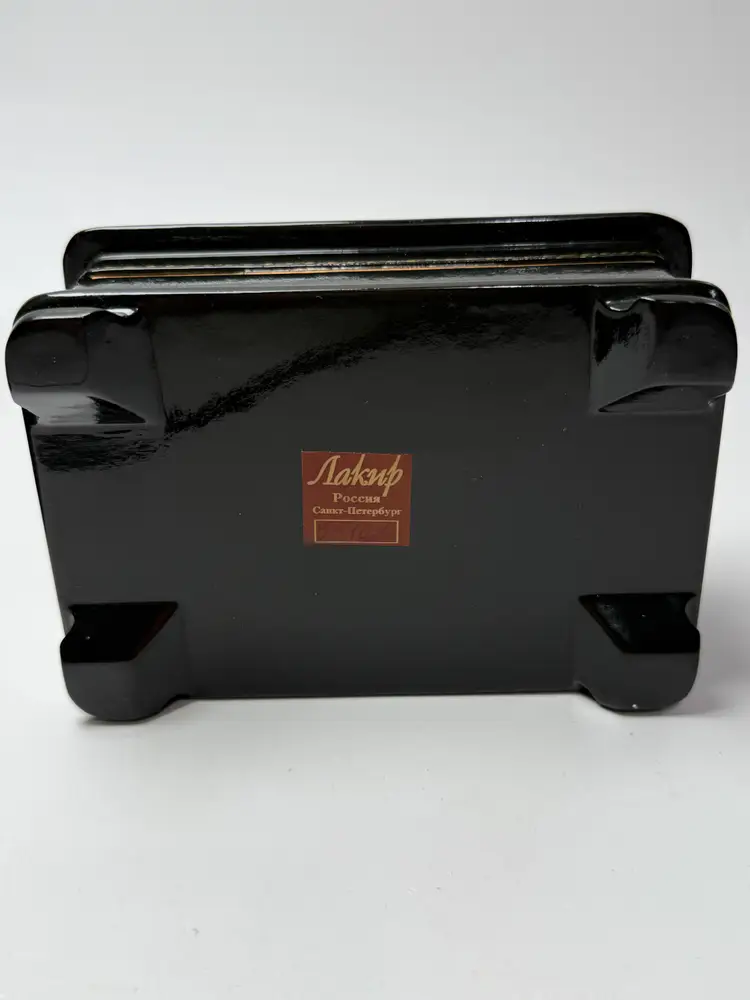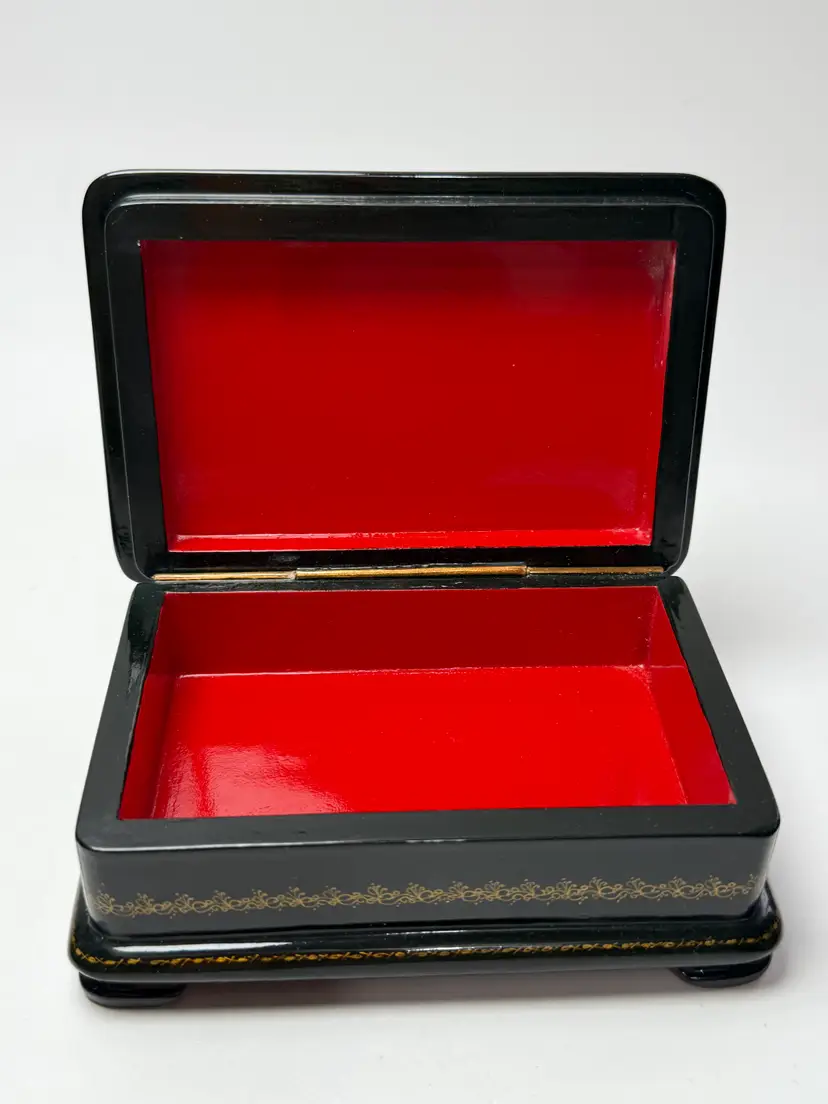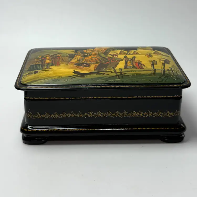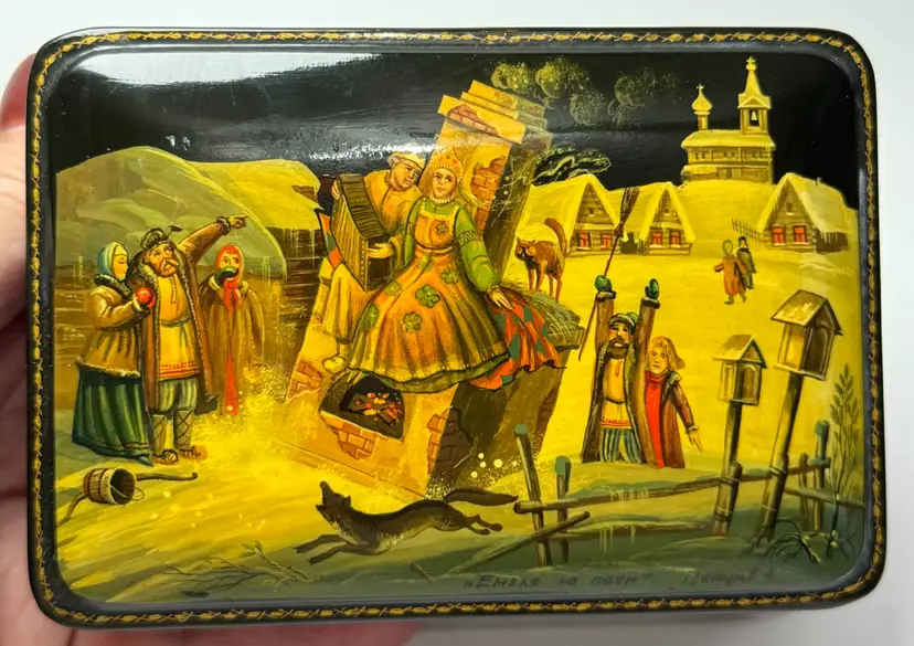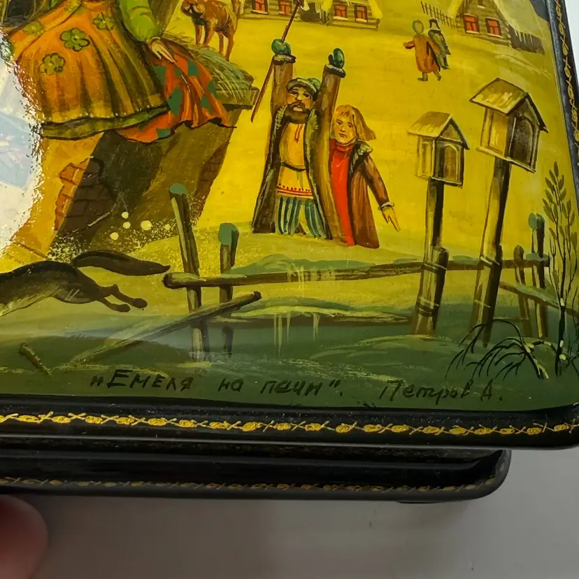 Vintage Russian Black Lacquer Box Fairy Tale Man Woman on Hearth Fox Cat Village Scene. 5" x 3.5" x 2" tall. Great condition. Little to no wear. Signed by artist.
