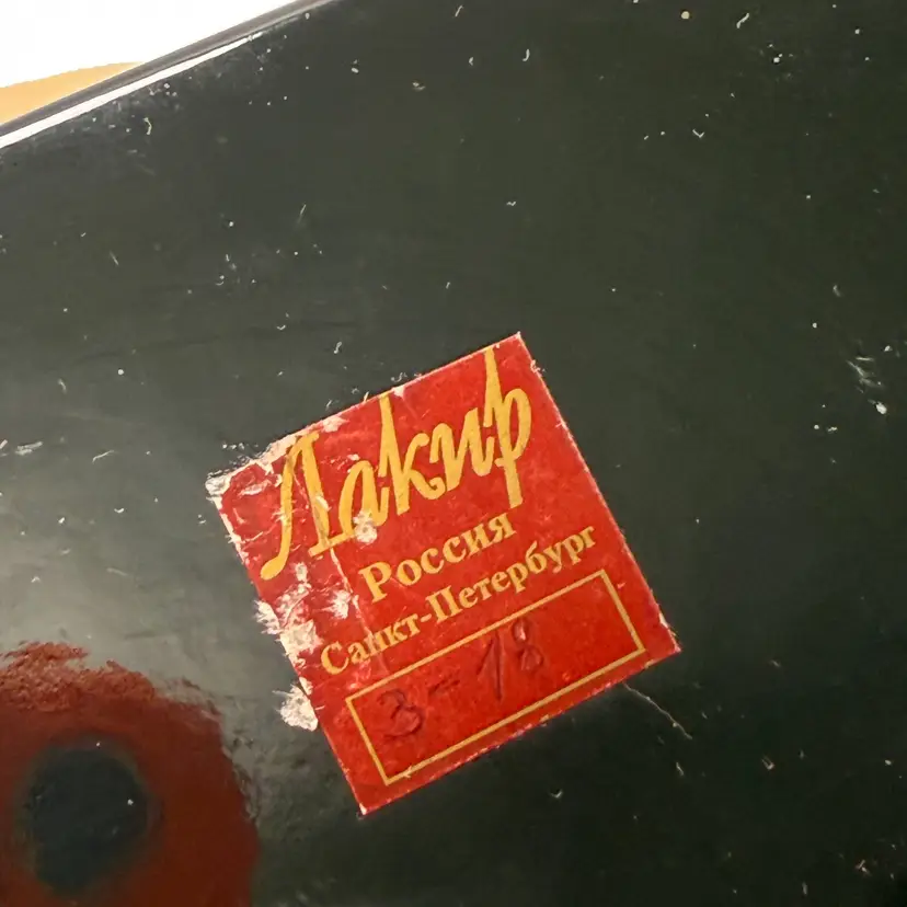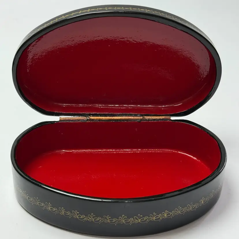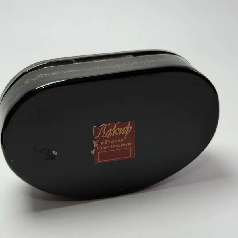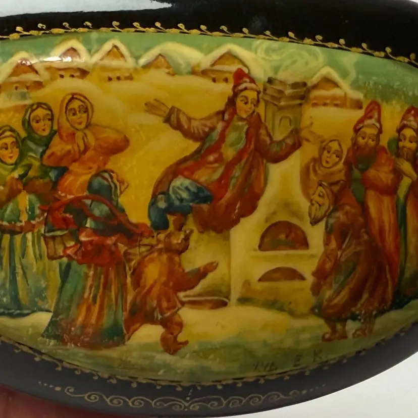 Vintage Russian Lacquer Box Fairy Tale Village Scene Hearth Bear Signed Miniature painting. Signed. Made in St. Petersburg. Original label on the bottom. 4" x 2.5" x 1.5" tall. Clamshell shape. Great condition. Little to no wear.