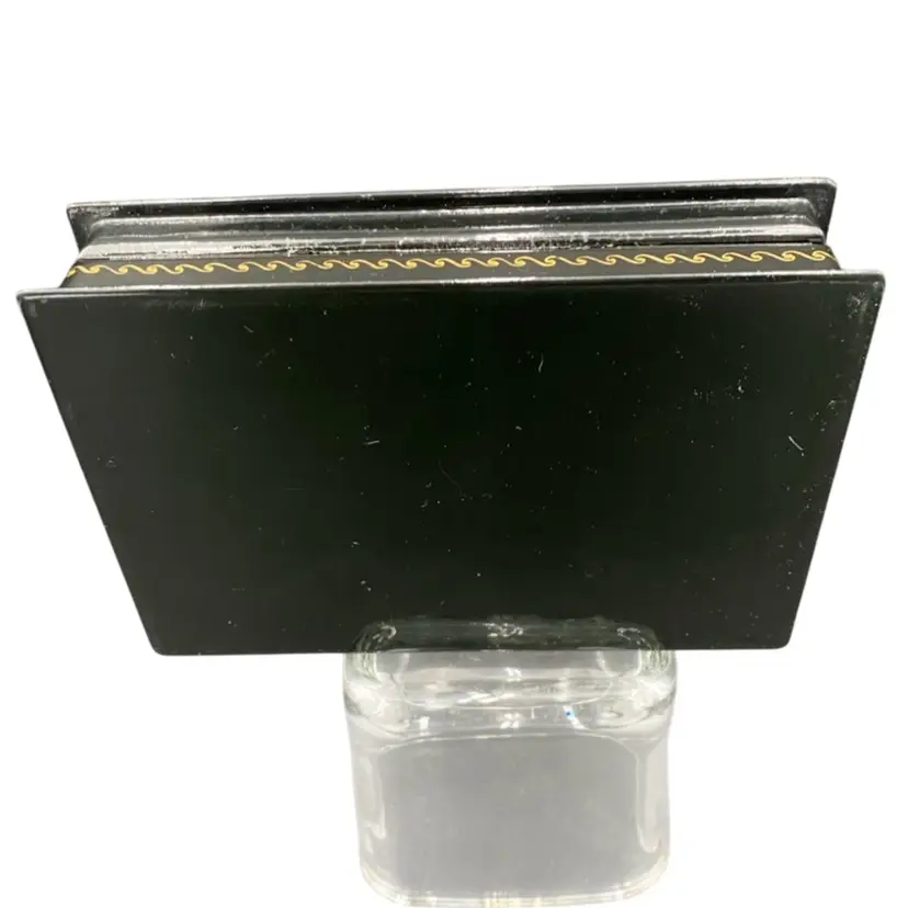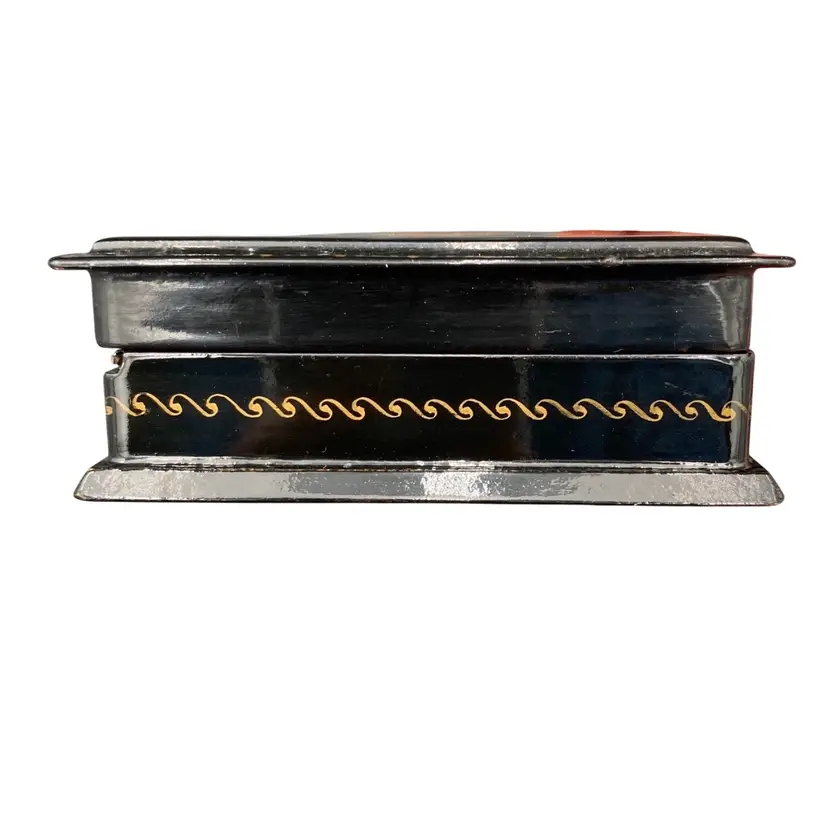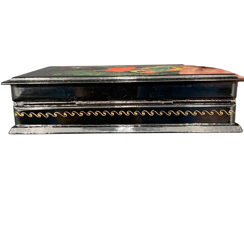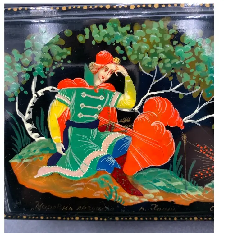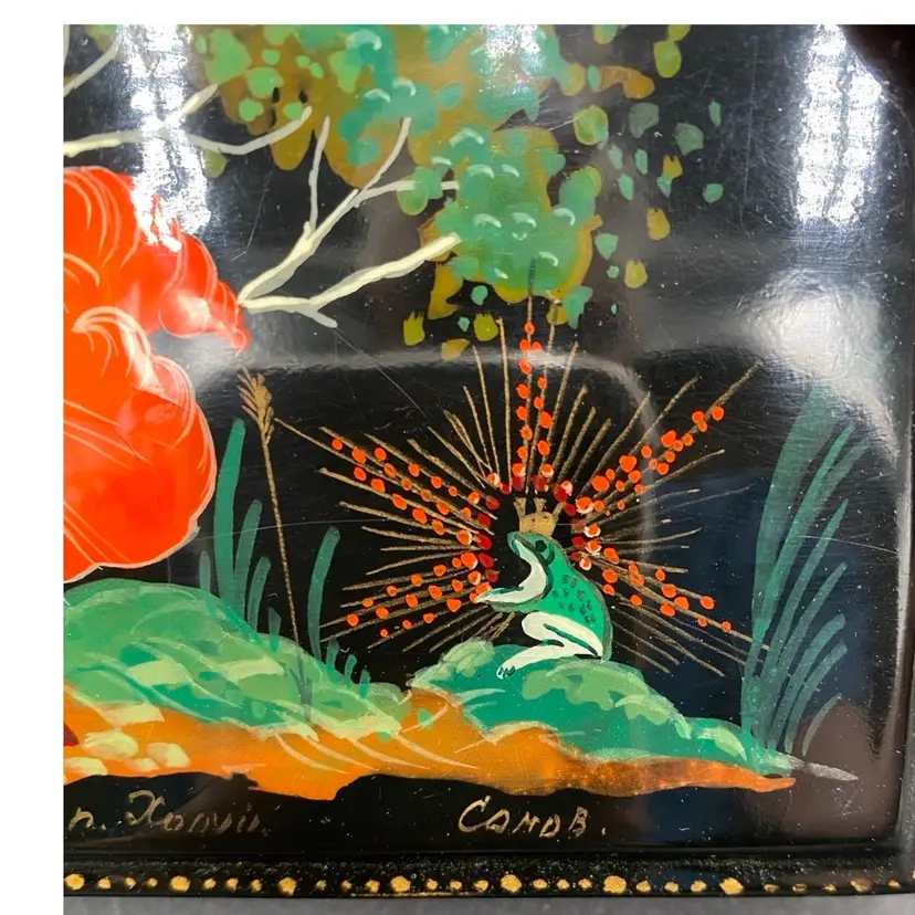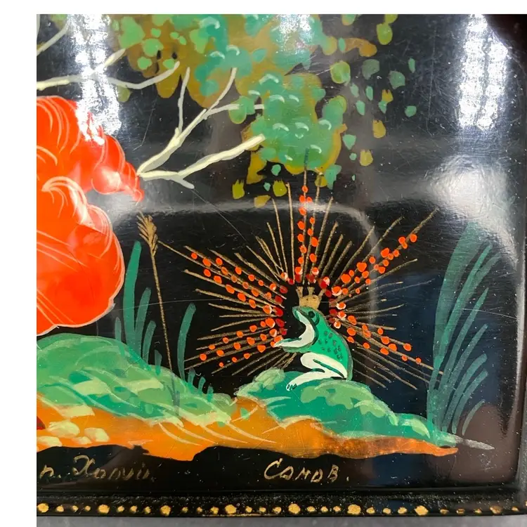 This vintage Russian lacquer box features a beautifully hand-painted scene of the Frog Princess Kholui. The box depicts the Russian Fairy Tale "The Frog Princess" by N. Grovmov. Materials used are egg tempura paints, papier-mache and lacquer. There is Russian writing along the front edge of the box in gold with the name of the scene (Frog Princess Kholui) and the artist who made it. The box is a unique collectible piece that showcases the Russian culture and craftsmanship. The box is made in the Russian Federation and is completely handmade.