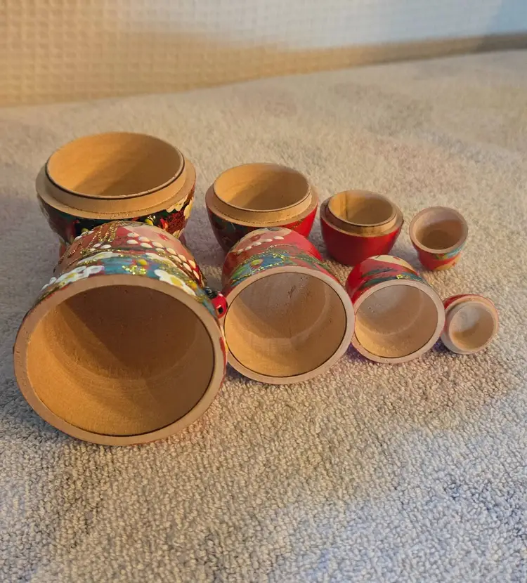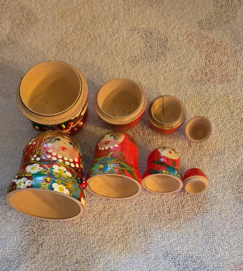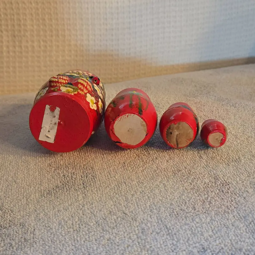 Usually crafted from Linden or birch wood. Hand crafted and hand painted depicting women in traditional folk costumes. Featuring floral patterns and colorful shawls. Sometimes scenes from Russian fairy tales. The tallest little lady in this bunch has a lady bug on her. Largest measures 3 1/2" tall, 2nd doll is 2 1/2" tall, 3rd doll is1 3/4" tall, and the 4th is 11/4" tall. In great condition. No chips, cracks, or repairs.