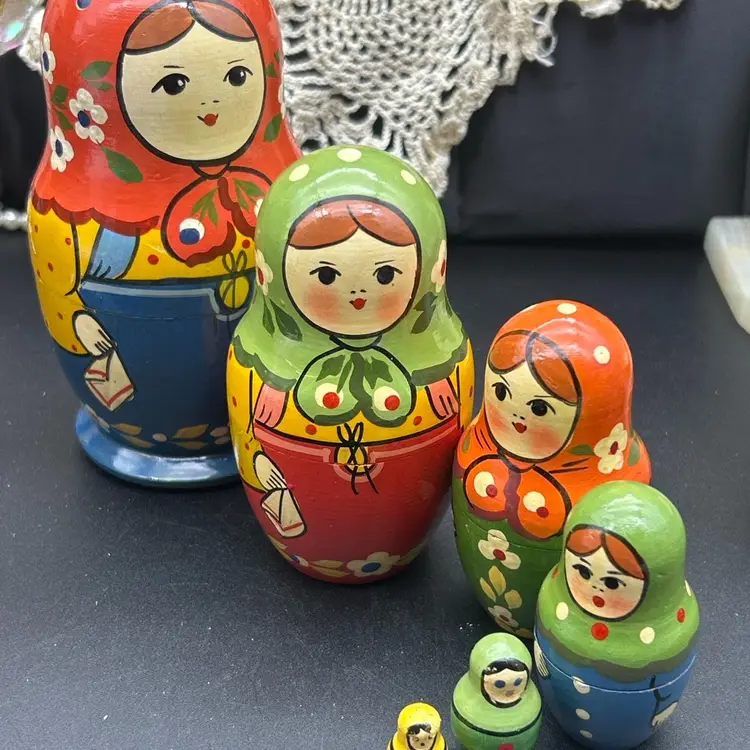 Notable Details: • Set of 6 nesting dolls • Hand-painted wooden construction • Traditional Russian folk art style • Largest doll approx. 6.5” tall • Bright colors: red, green, orange, blue, and yellow • Vintage condition with light wear, consistent with age