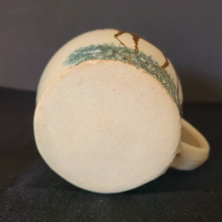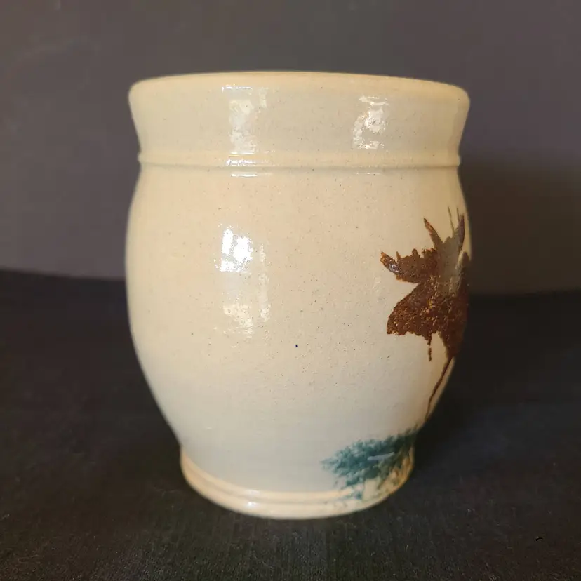 This charming rustic woodland friend is handmade and hand painted. Mr Moosykins is dark brown and he just out chillin' in the wilderness. Approx 4.25" tall and 3.75" in diameter at the belly. Holds 14oz. Looks to have the tiniest flea bit chip on the bottom edge as shown in pic, but it might have just been a bloop in the clay as it was drying. Dunno.