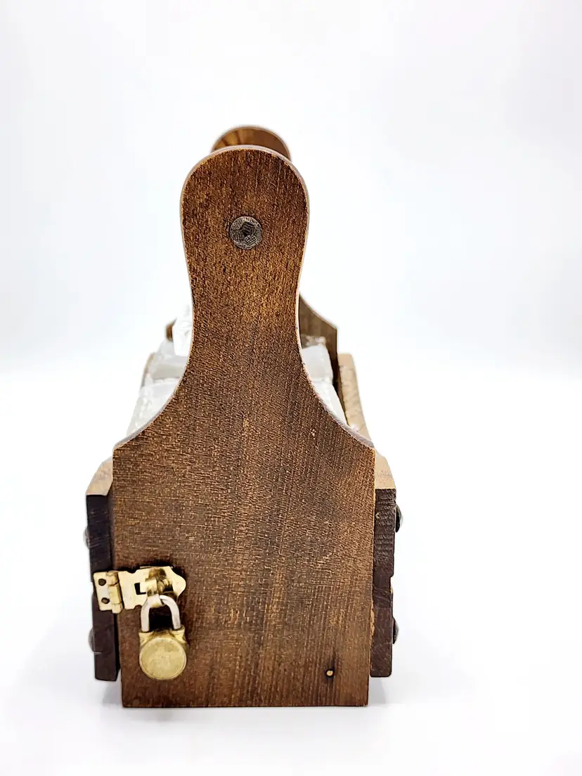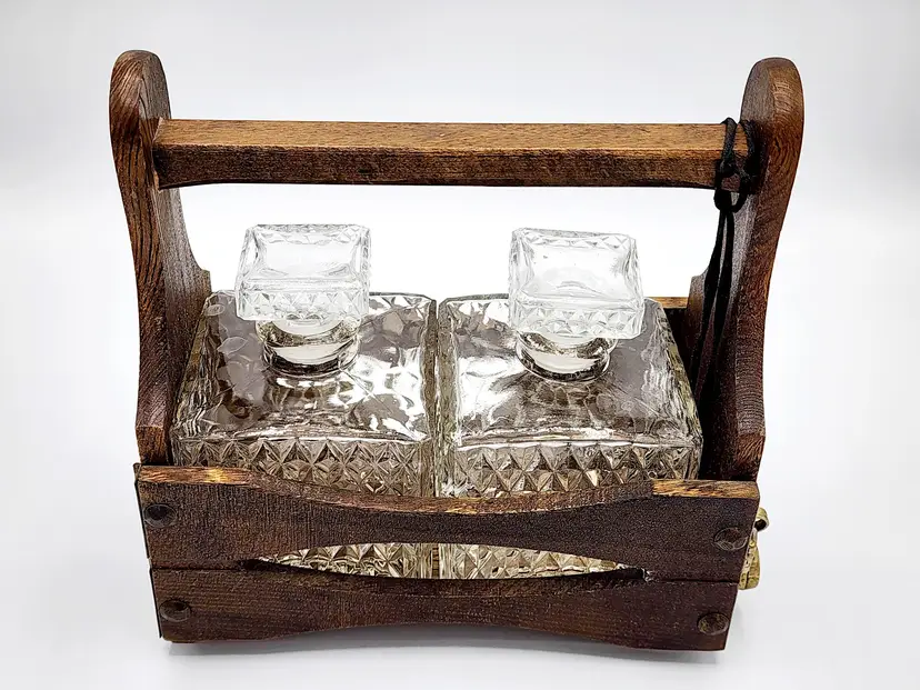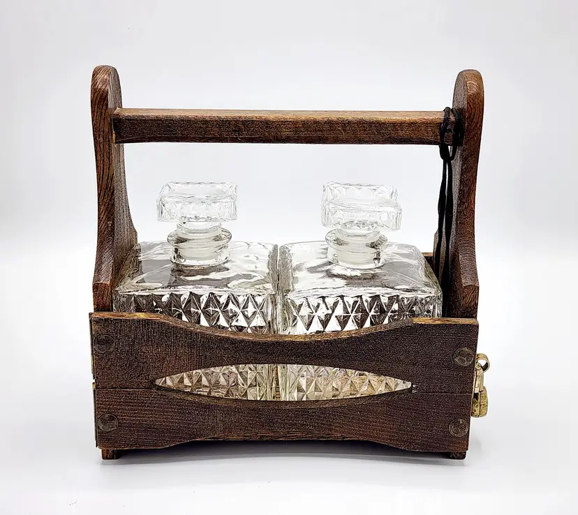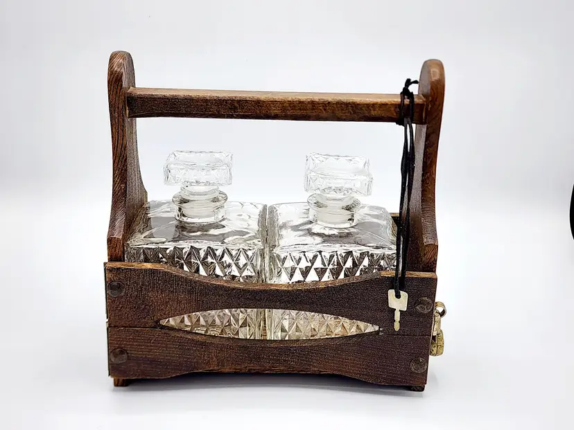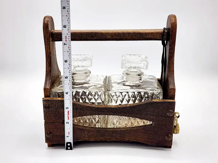 Rustic look - Caddy/crate is wood, decanters are clear glass with diamond point pattern. Lock does have the key and it's working. Very good condition. Measures: 8" long, 4 1/2" wide, 8 1/2" tall.