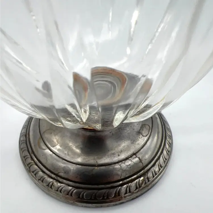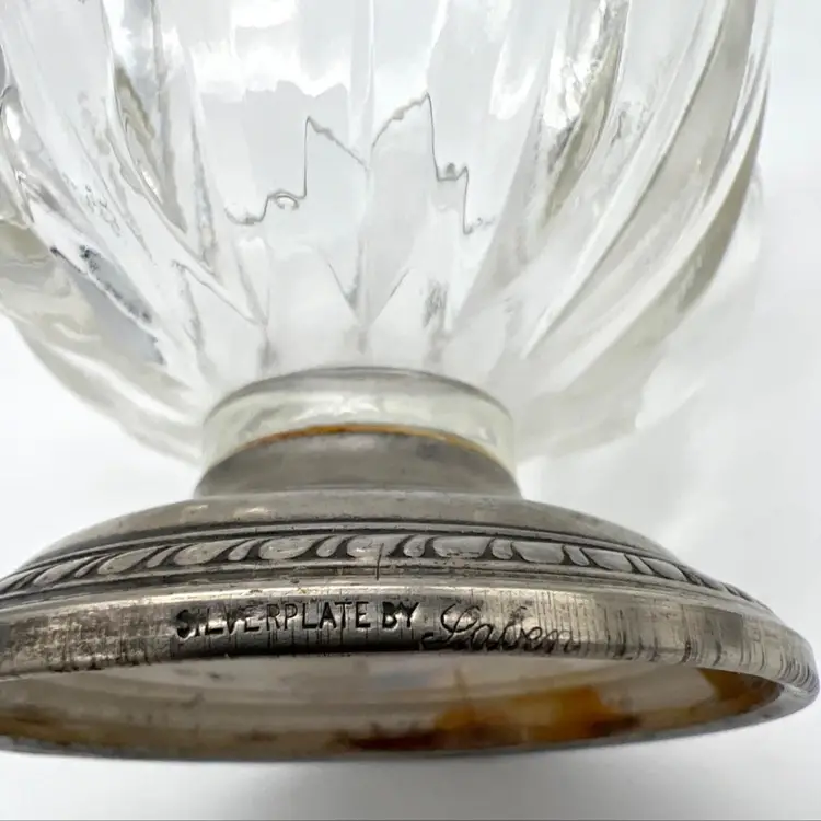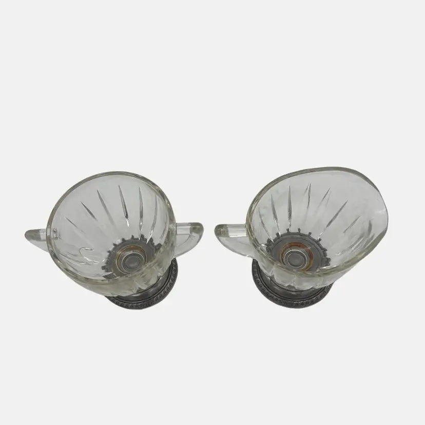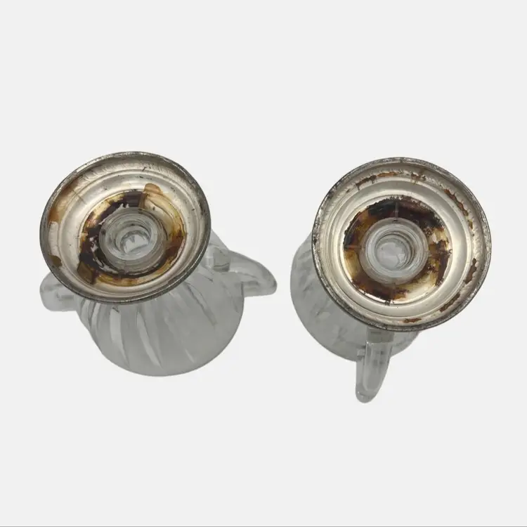 No chips or cracks noted. Some tarnish to the silverplate. There is some staining on the underneath of the bases. I think it might be related to the adhesive that was used to hold the glass to the base. See pictures for further details on condition.