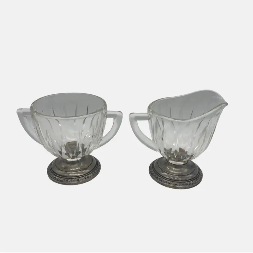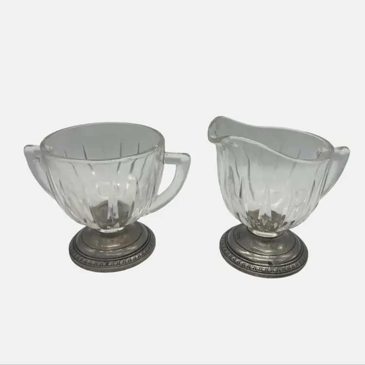 Vintage clear glass creamer and open sugar bowl set with silverplate bases from Saben. Each item measures approximately 3.5" tall.