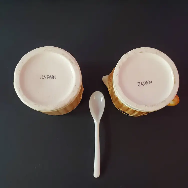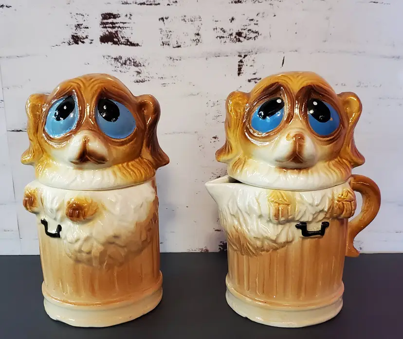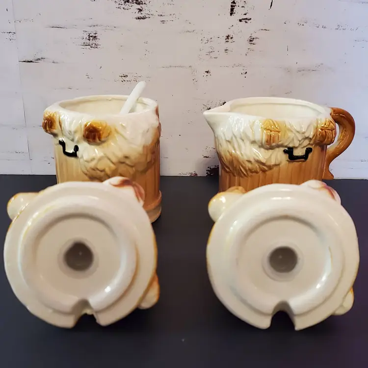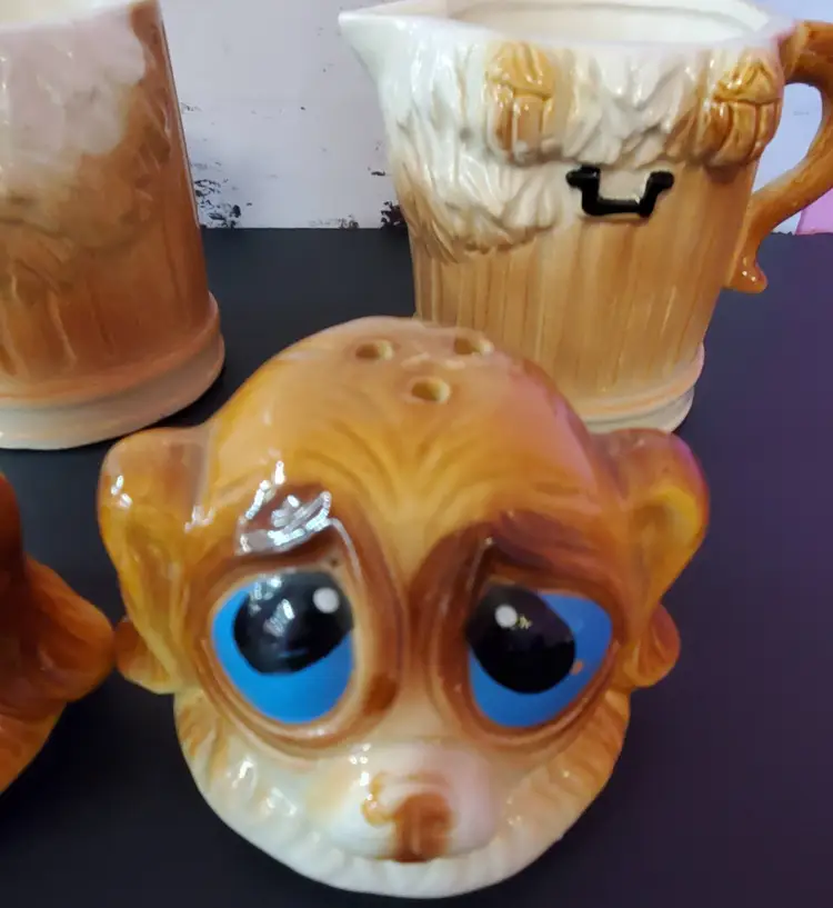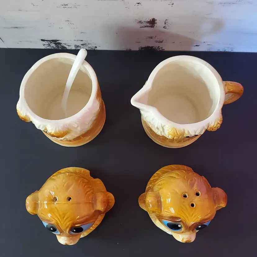 Vintage Sad Puppy Dog Stackable Salt & Pepper Shakers/Creamer and Sugar Bowl. Cold paint wear in places but otherwise good condition.