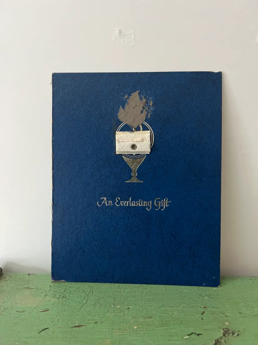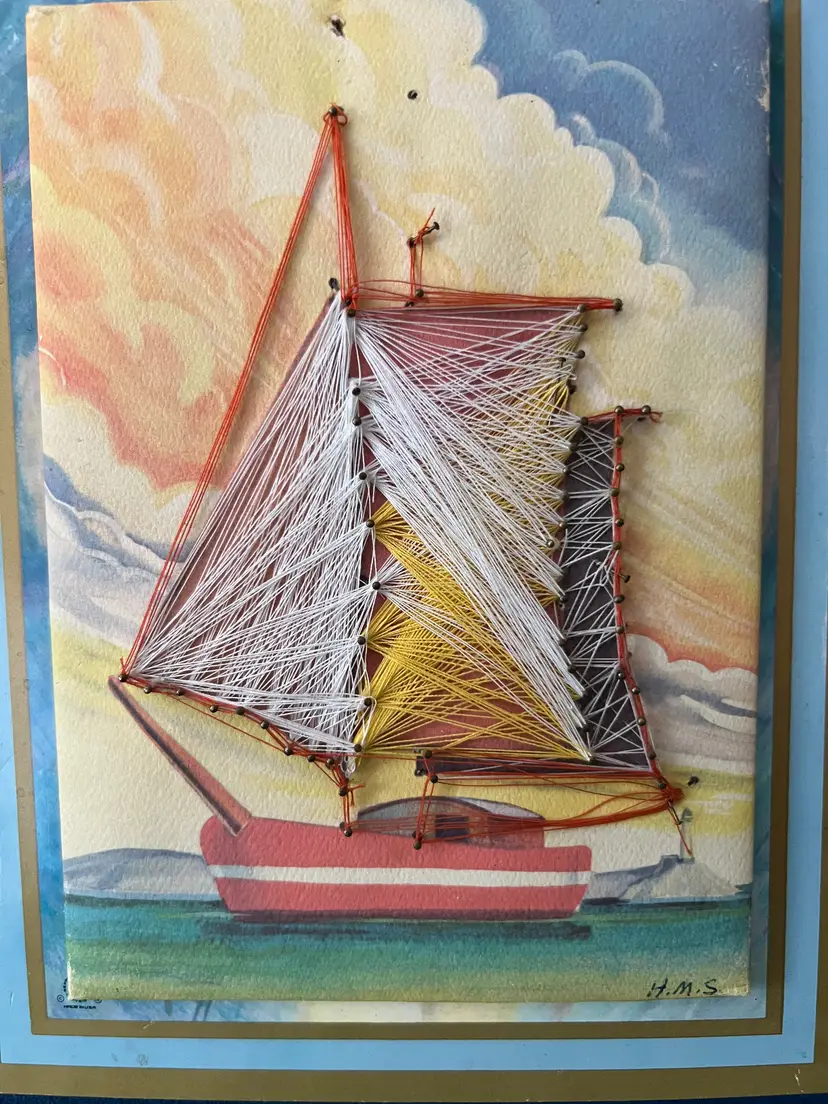 Beautiful sailboat string art. c1980 The back reads "An everlasting gift." There is some wear to the edges of the back board and some wear to the paint on the edges of the raised canvas. The top of the sailboat might be missing a few threads between the two top pins. One of the top pins looks like it was reinforced with a small dab of adhesive The overall measurements are 9.25" x 7 3/8"