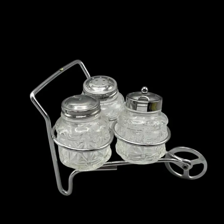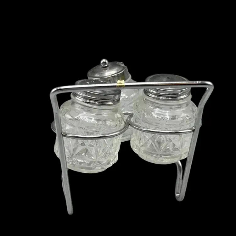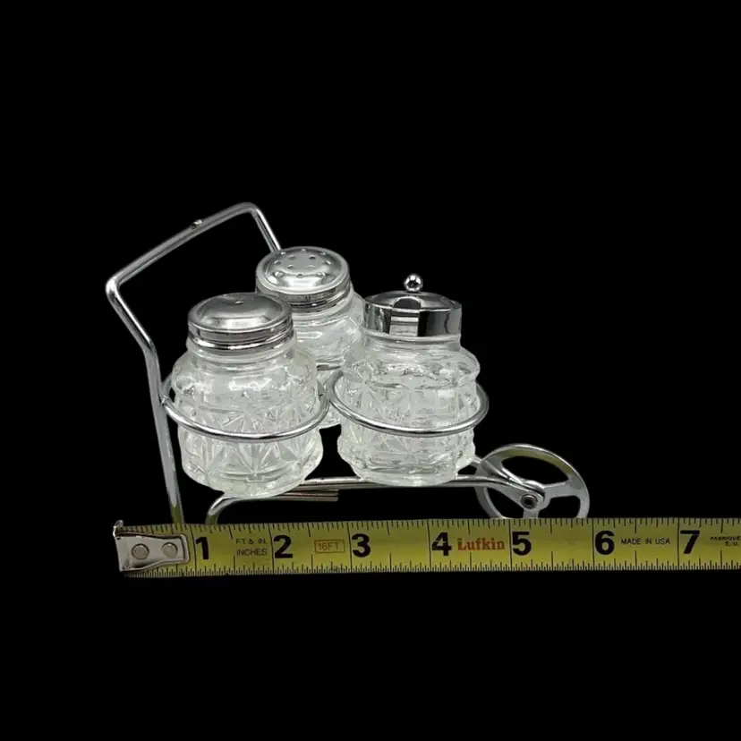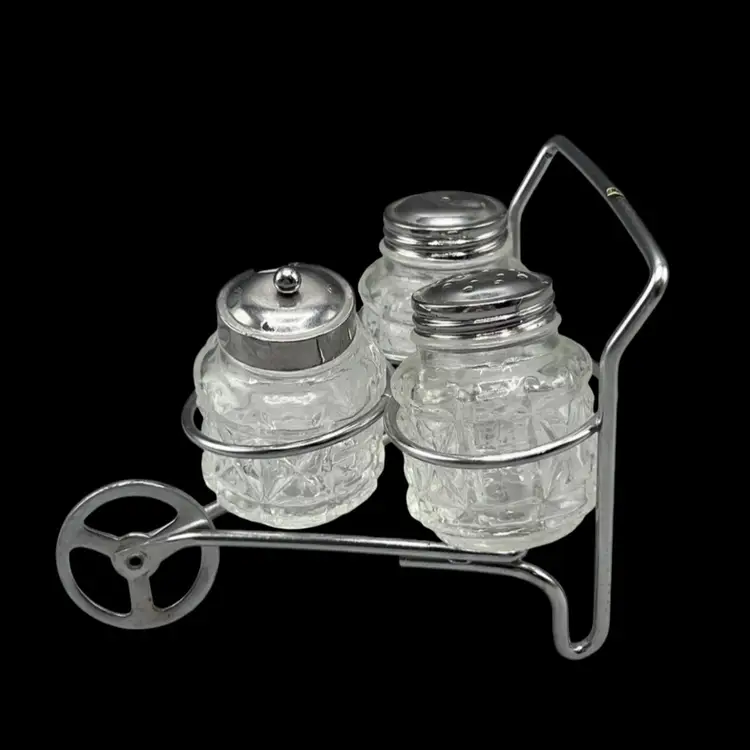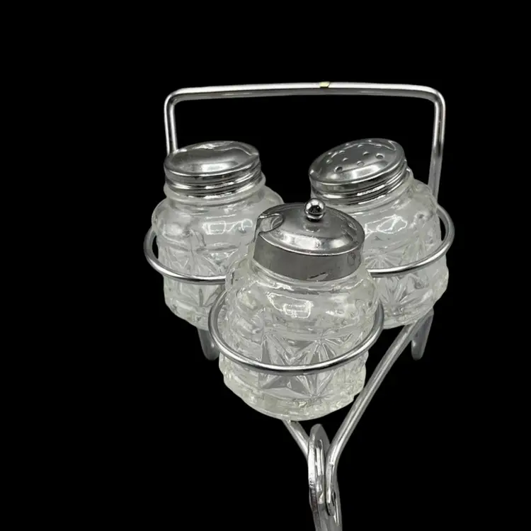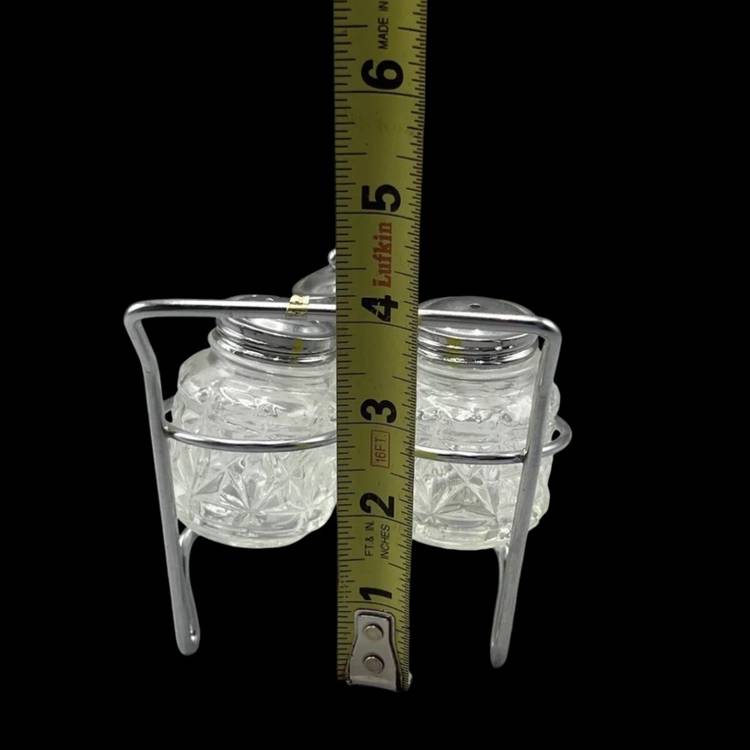 Vintage Salt and Pepper in a Metal Cart Holder Caddy M331 Anchor Hocking. In excellent condition see photos for condition and exact measurements.
