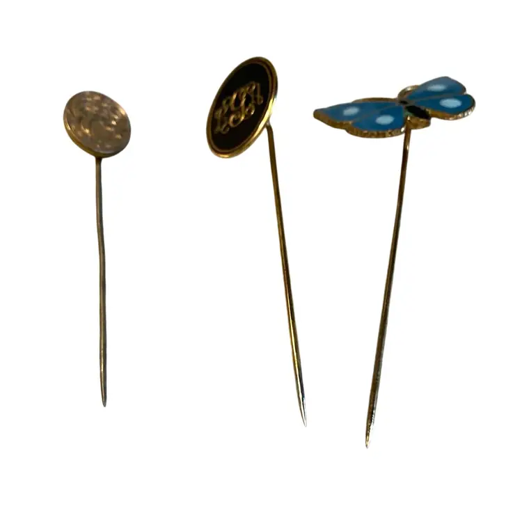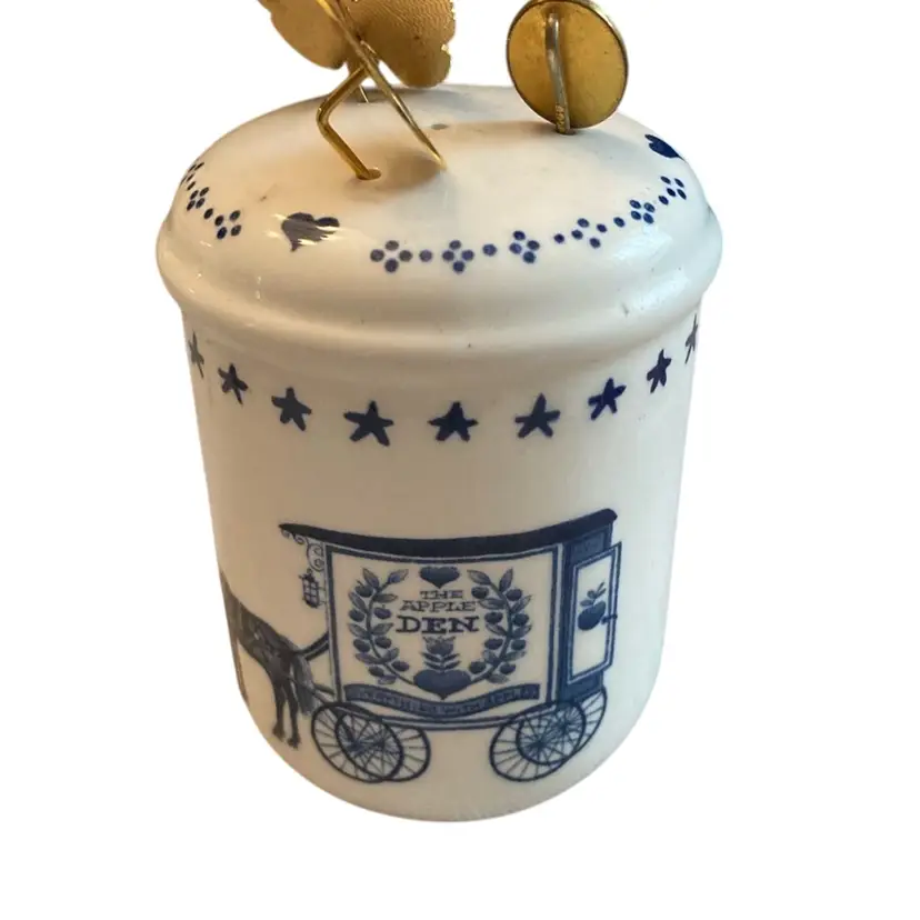 3 ” tall x 2.5” vintage salt shaker with pictures of horse and cart saying Jelly Farm Cape Cod and The Apple Den. Three hat pins included - they do not have their ends.