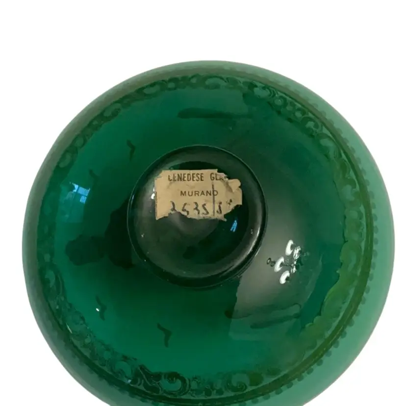 Gorgeous green glass dish hand painted with gold details. Beautiful lady standing in a gondola. Piece still has partial original sticker on bottom. Company was founded in 1859 in Venice, Italy.
