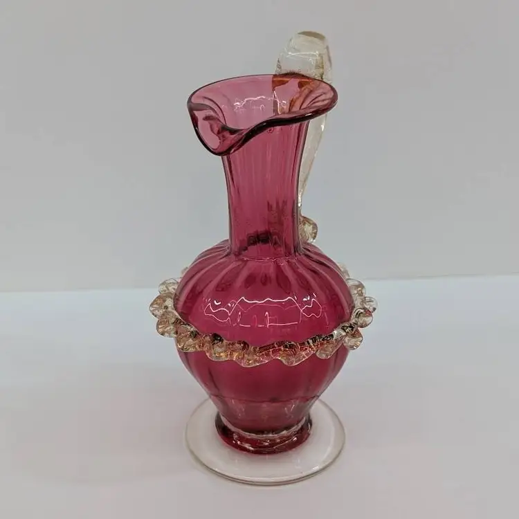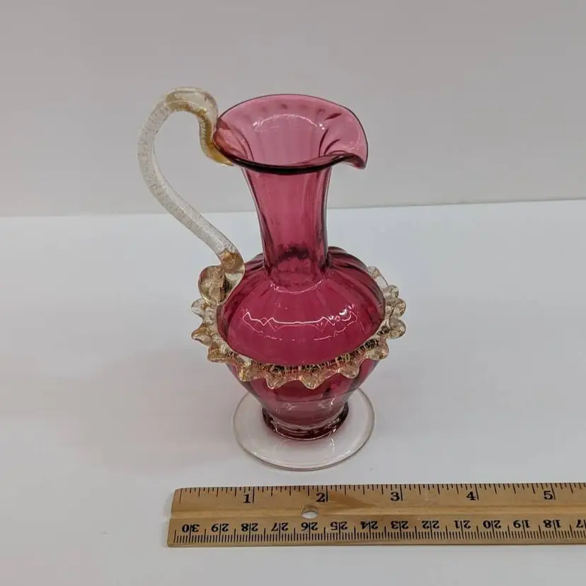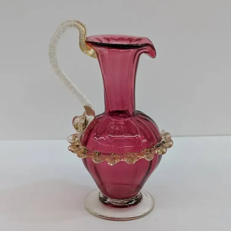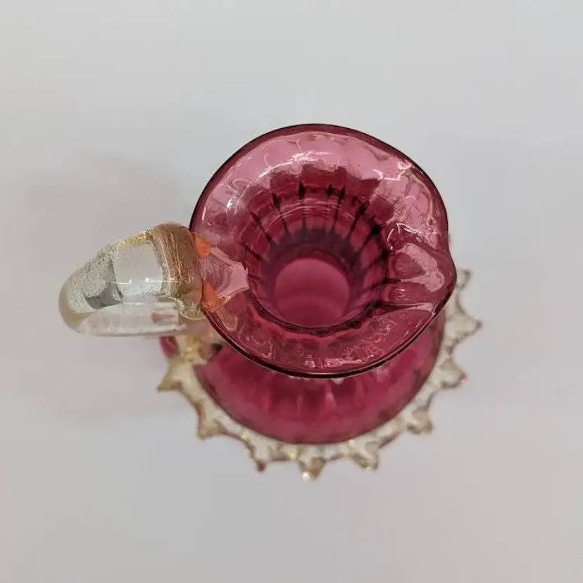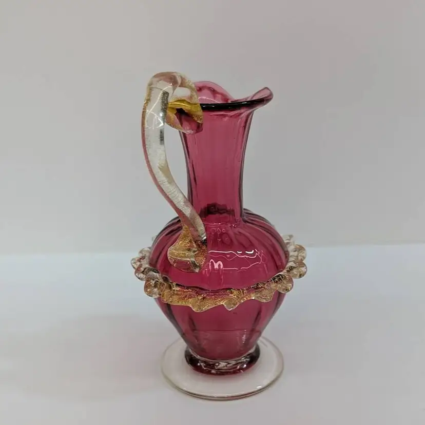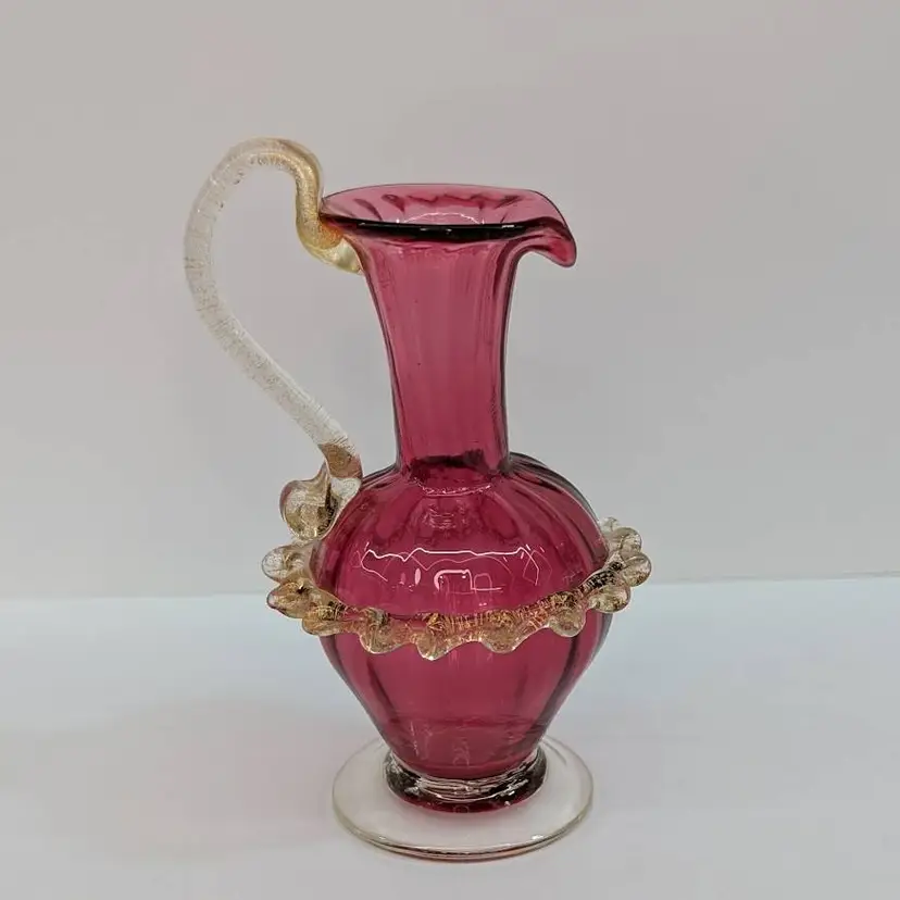 Gorgeous, little hand blown glass pitcher from Salviati in a cranberry color with an applied handle and ruffle with gold flakes. In nice, used condition with minimal wear. Measurements ~ 3 x 2.75 x 5"