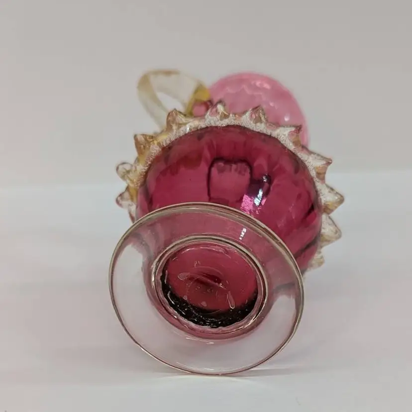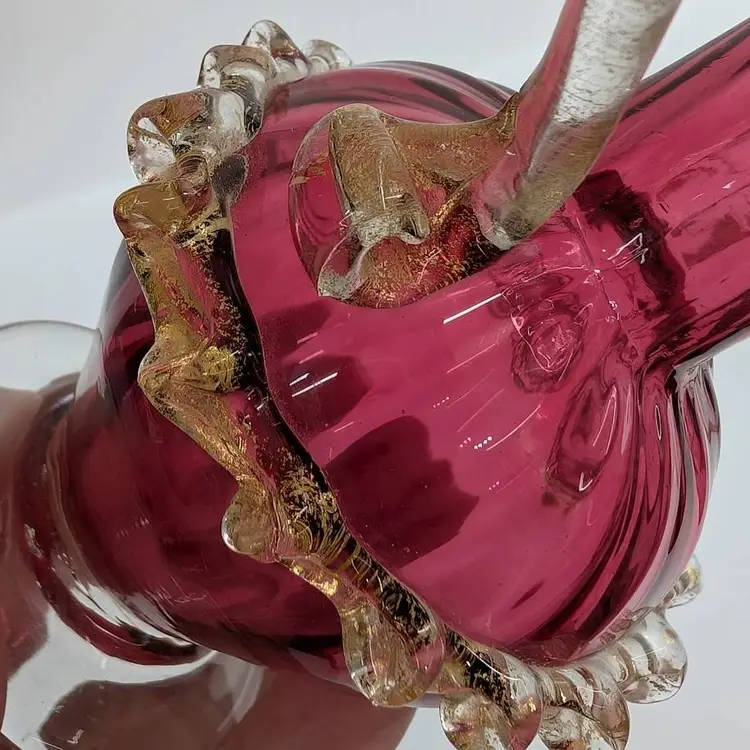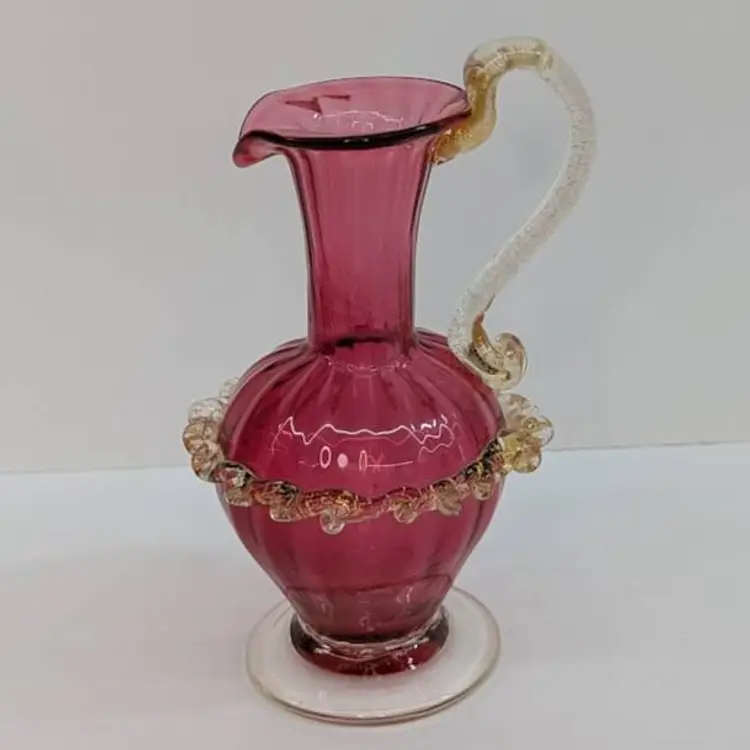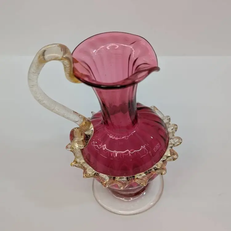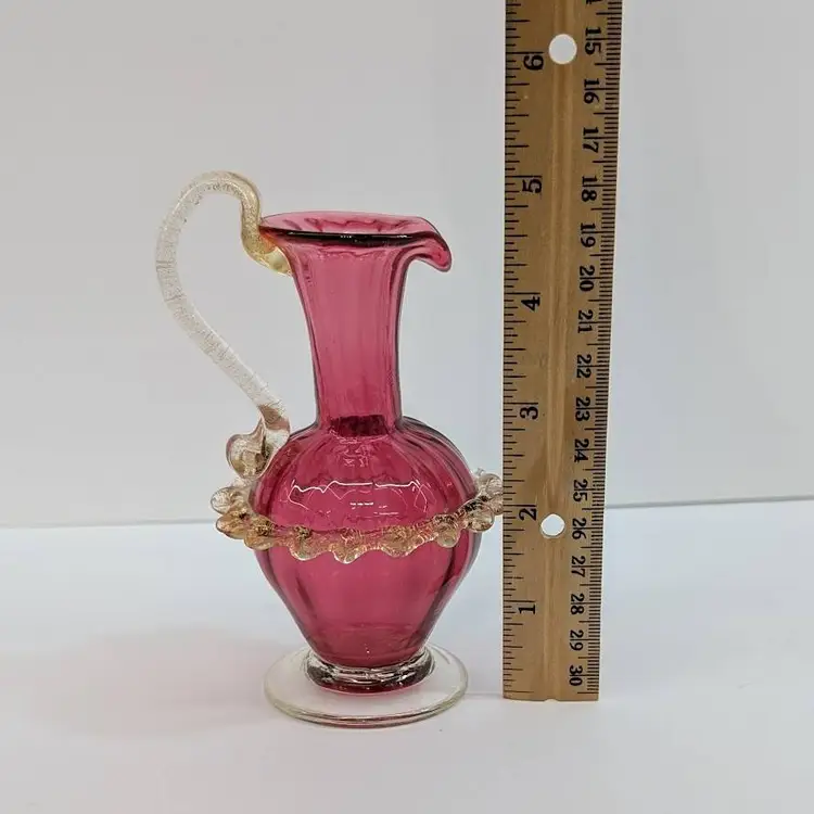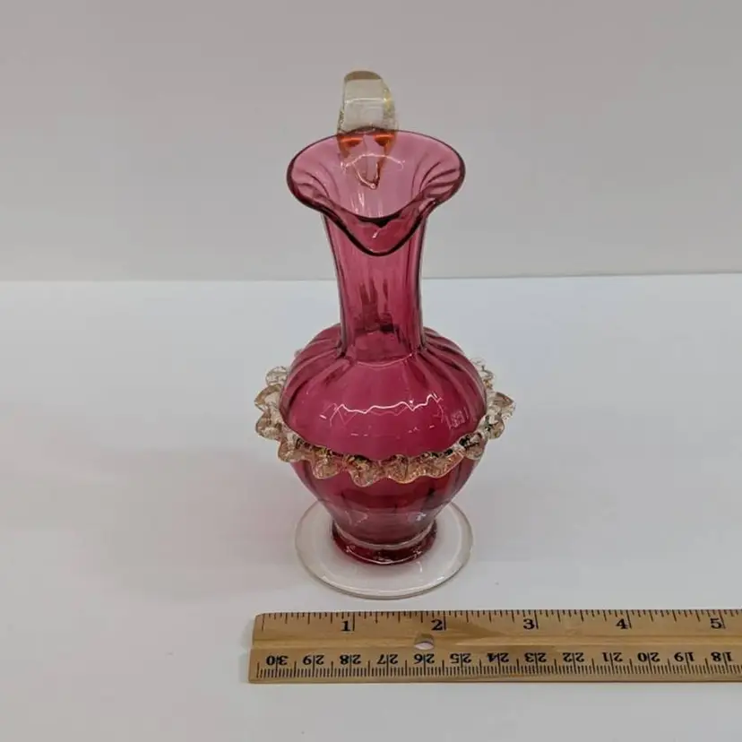 Gorgeous, little hand blown glass pitcher from Salviati in a cranberry color with an applied handle and ruffle with gold flakes. In nice, used condition with minimal wear. Measurements ~ 3 x 2.75 x 5"