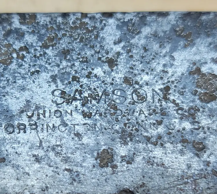 Up for sale is a vintage SAMSON brand slick chisel, made by Union Hardware Company of Torrington, Connecticut. This is a 1 inch wide slick, an older pattern favored by timber framers and patternmakers for controlled paring and smoothing. Details: Maker: SAMSON (Union Hardware Co.) Location stamped: Torrington, Connecticut, U.S.A. Width: 1 inch Style: Slick chisel Handle: Original wooden handle Construction: Solid vintage high-carbon steel Condition: This chisel is in good vintage condition. It shows honest age, patina, and light surface rust from decades of use and storage. The stamp is still visible. The handle appears original and solid. No cracks or breaks observed. The cutting edge will need sharpening before use. Please review photos carefully as they are part of the description. Notes: This is a quality American-made edge tool from the early to mid-1900s. Samson chisels are well regarded for their steel and durability. Great candidate for restoration or continued shop use. Sold as shown.