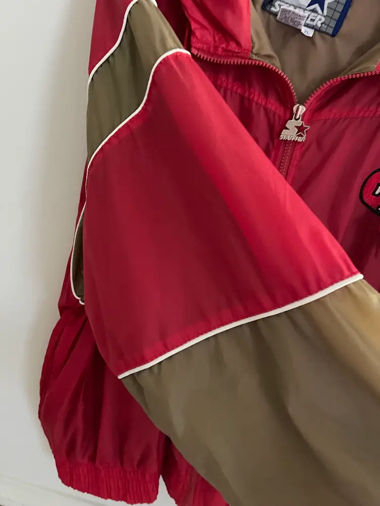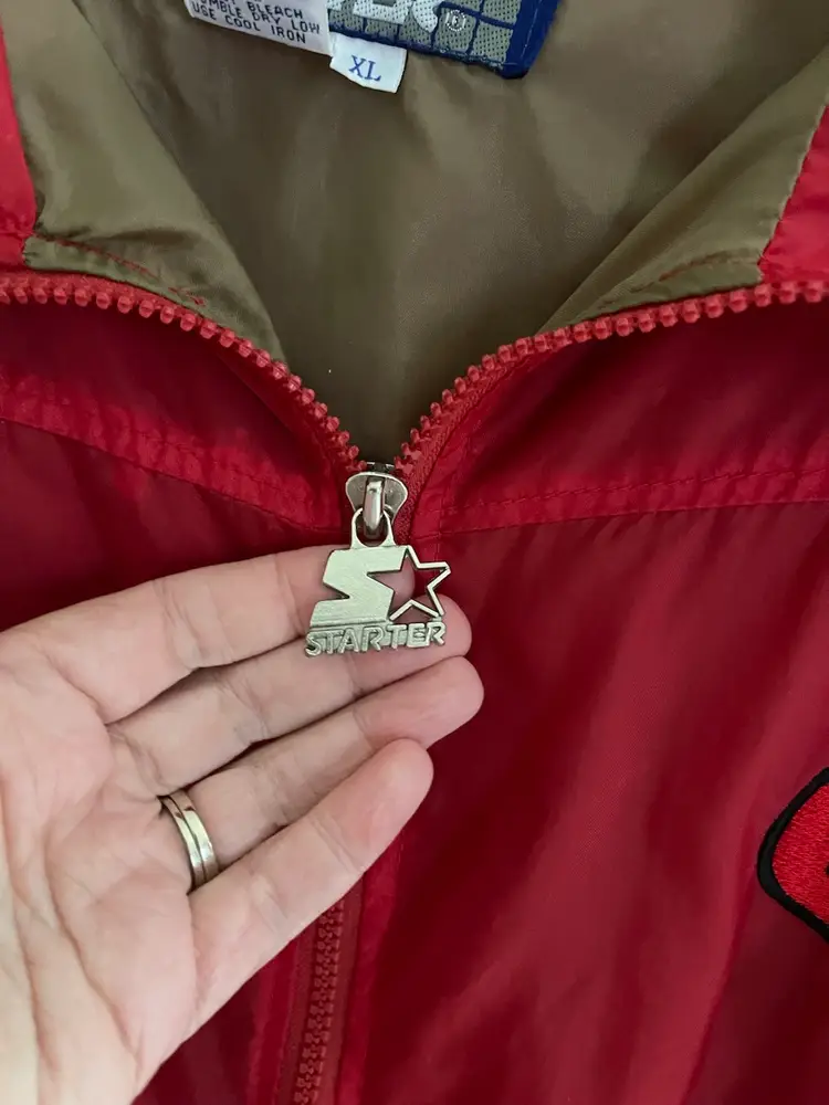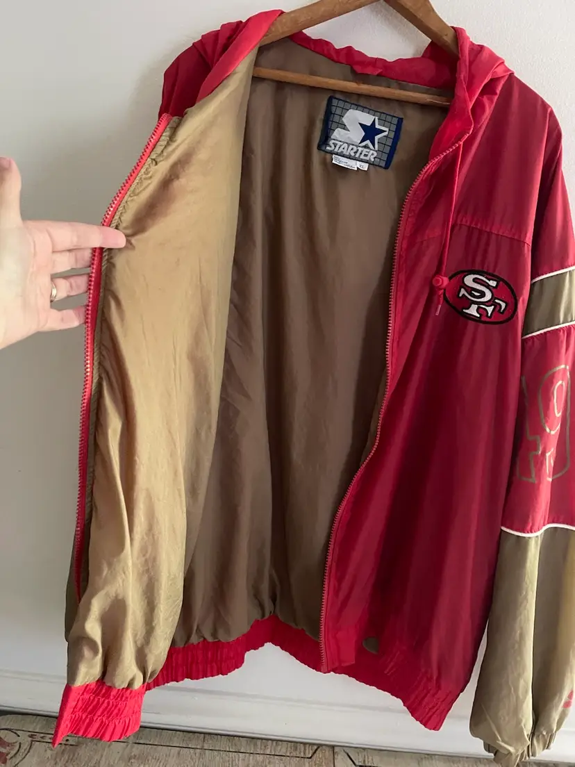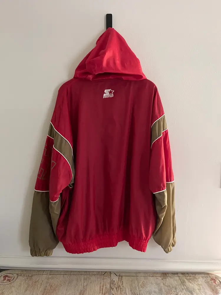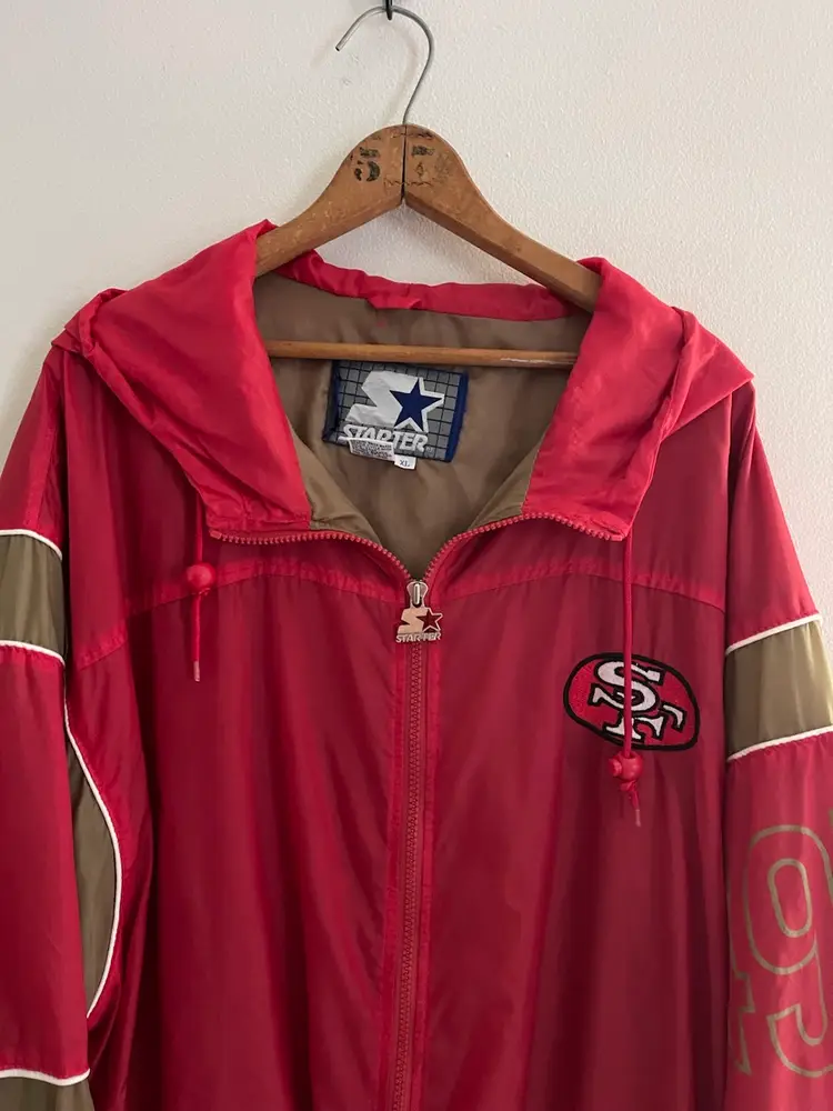 Vintage San Francisco 49ers Starter Jacket (SEE CONDITION and PHOTOS) 90s/Early 00s Windbreaker Mens XL Red/Gold Spell Out on Sleeve Hood Starter Logo on Sleeve and Back 49ers Patch on Chest Plastic Zipper with Metal Pull Front Pockets Lightweight Toggle Hood