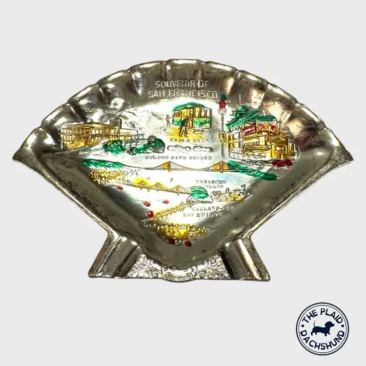 Fabulous 60’s souvenir of shell shaped tin ashtray decorated with great places to visit in the Bay Area. Made in Japan. Amazing kitsch people collected as they drove around the country for family vacations