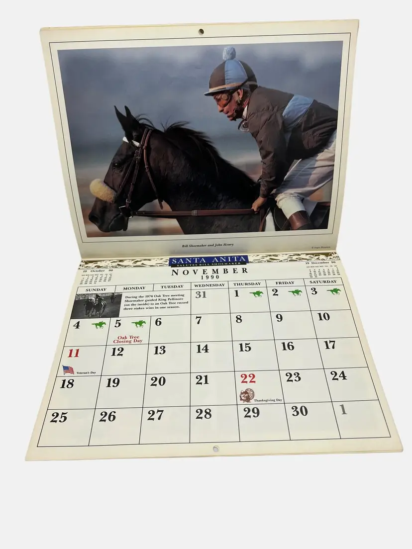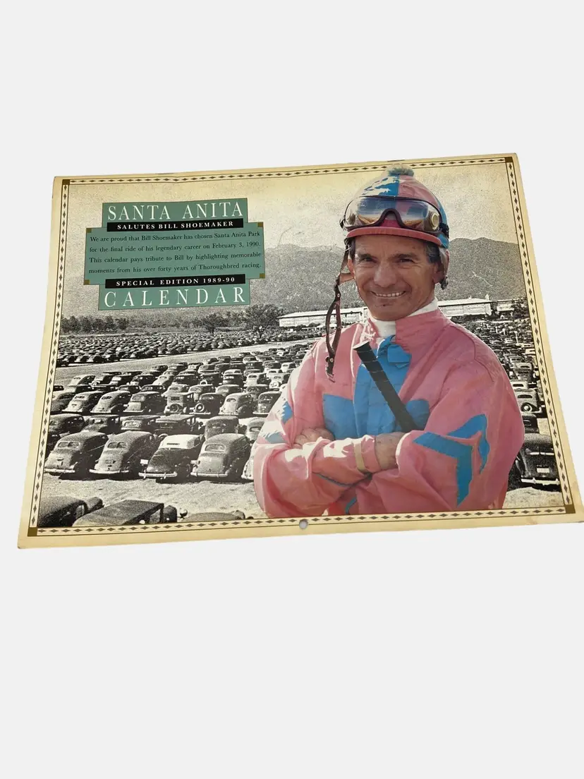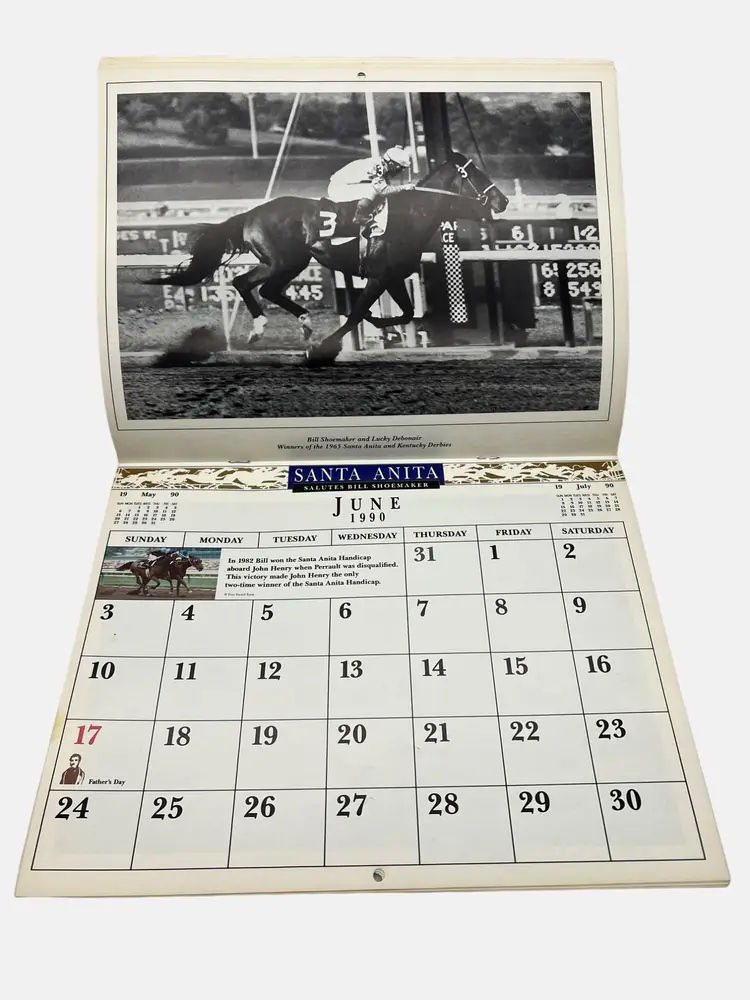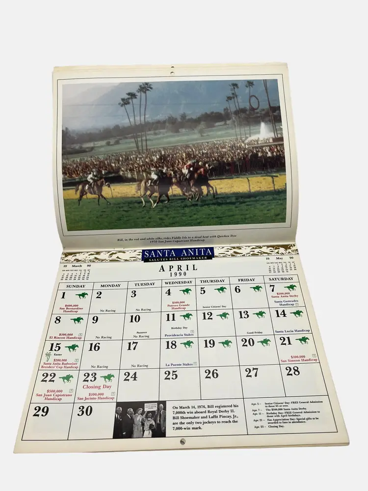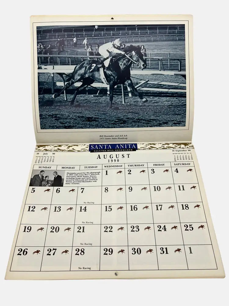 This special edition calendar from 1990 features iconic images from the Santa Anita racetrack and the career of legendary jockey Bill Shoemaker.