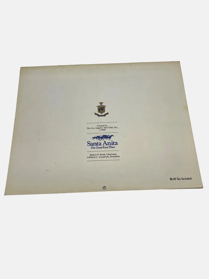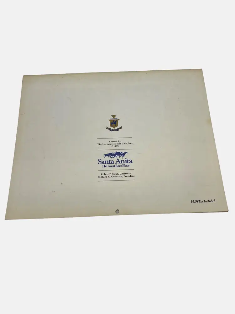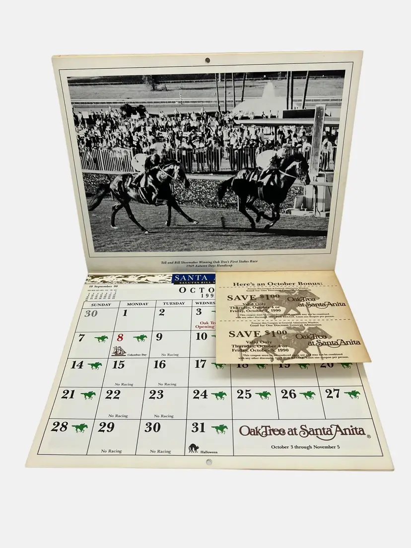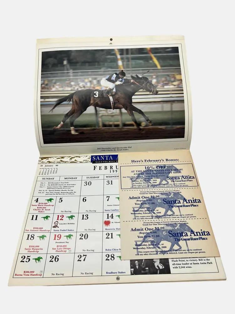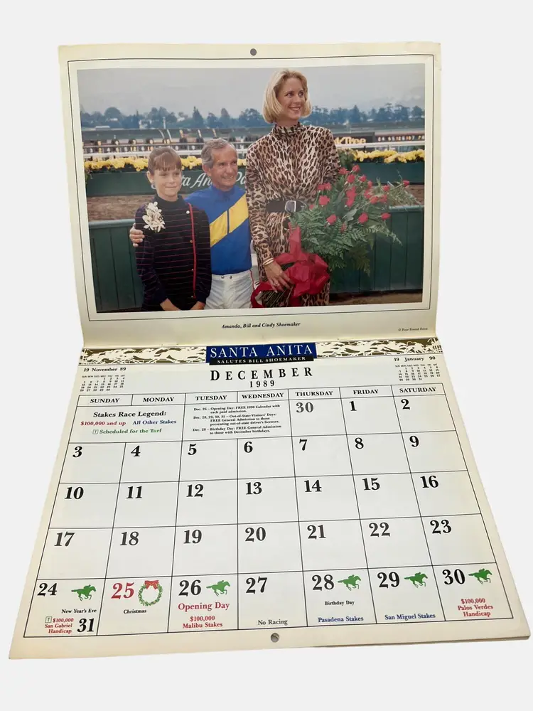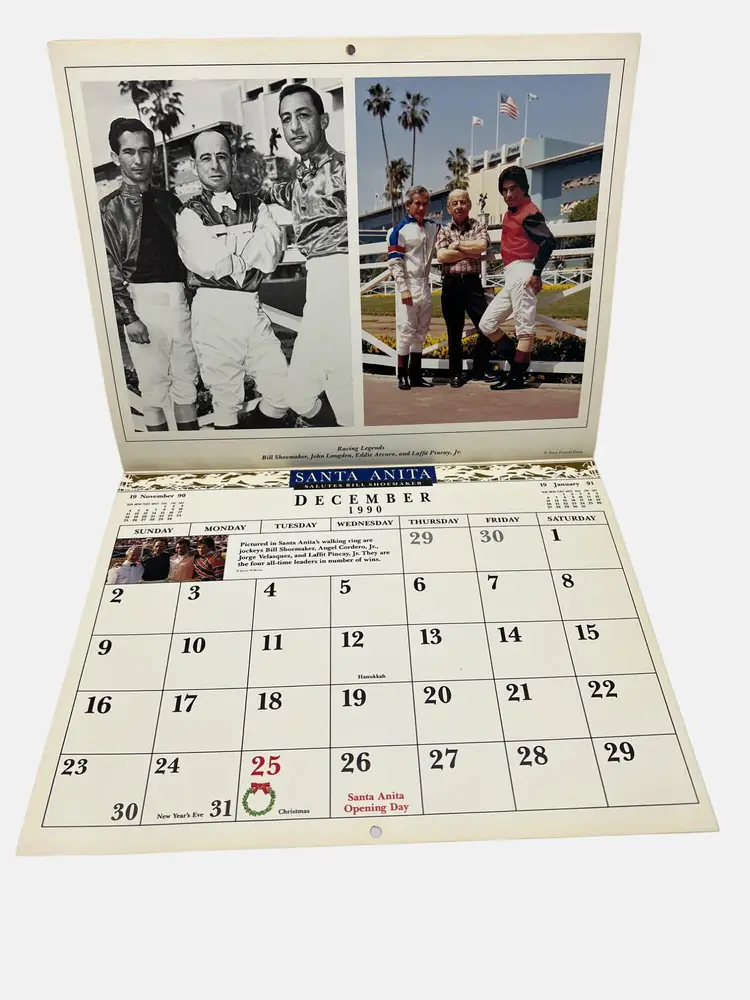 This special edition calendar from 1990 features iconic images from the Santa Anita racetrack and the career of legendary jockey Bill Shoemaker.