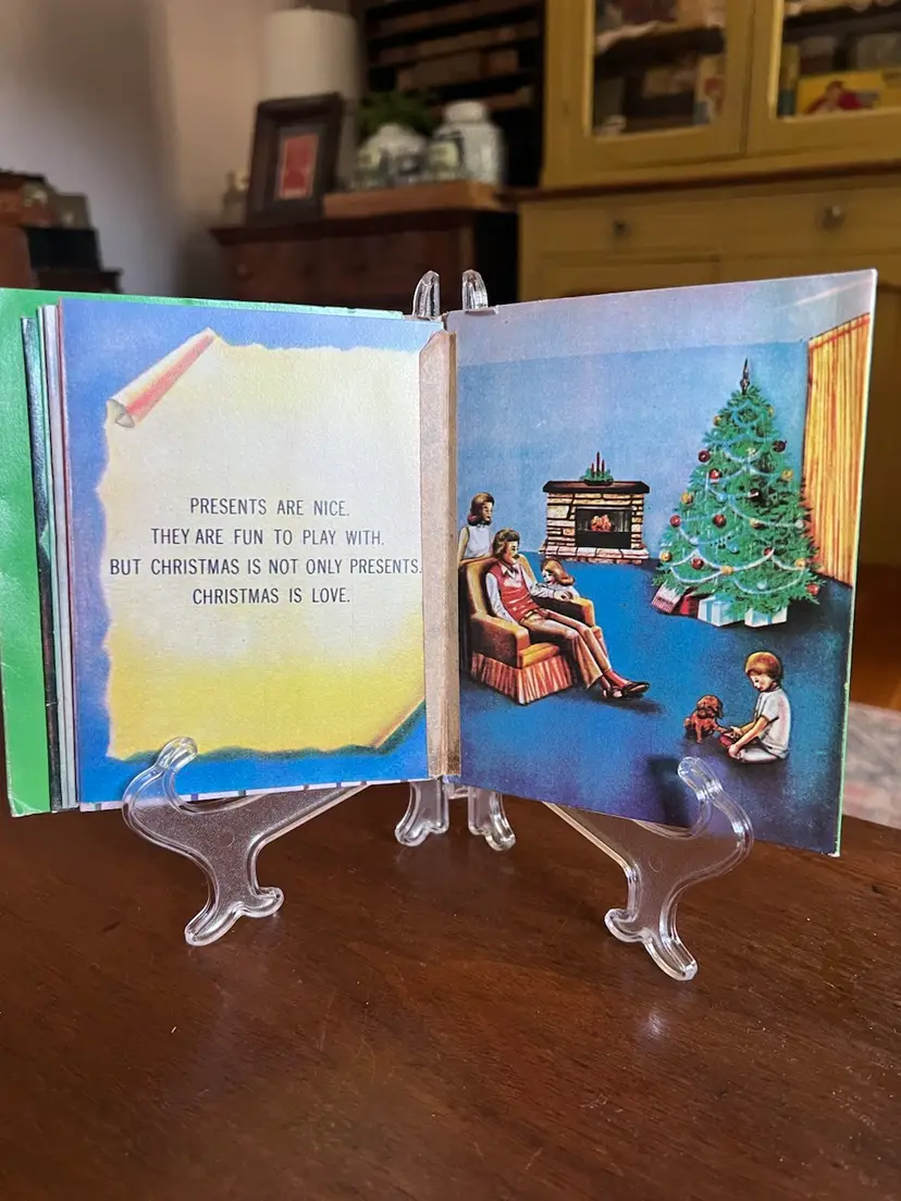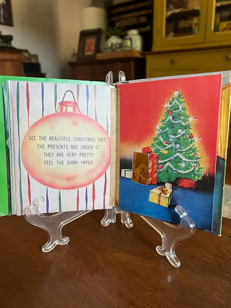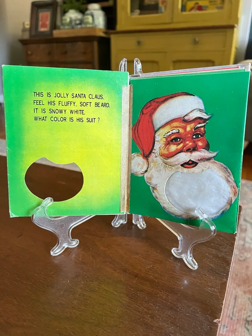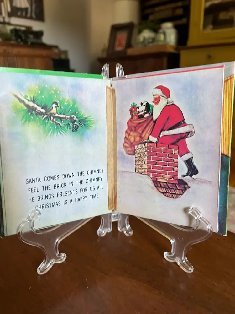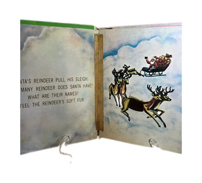 Vintage Christmas book (no copywrite date listed in book, but definitely older). Please note: there is tape in binding between EACH page of this book, this is how this book was produced (if you see other listings of this book, all books have this tape between the pages). I have photographed what the tape looks like. Book measures 6x5 inches. Multiple pages with fun textures to feel on each page.