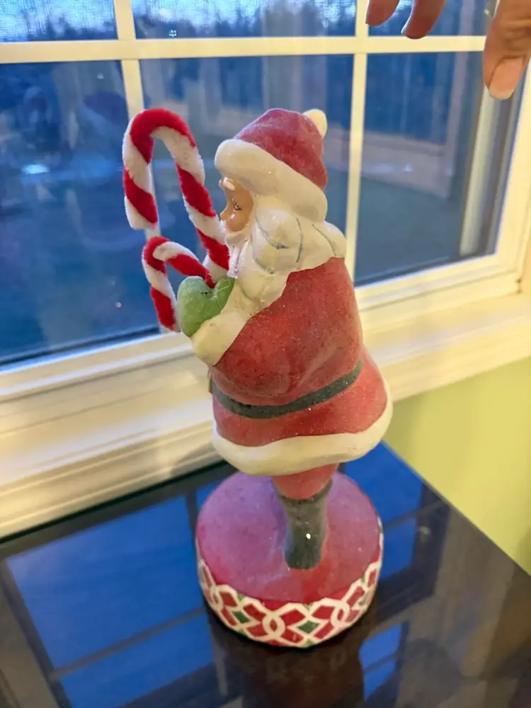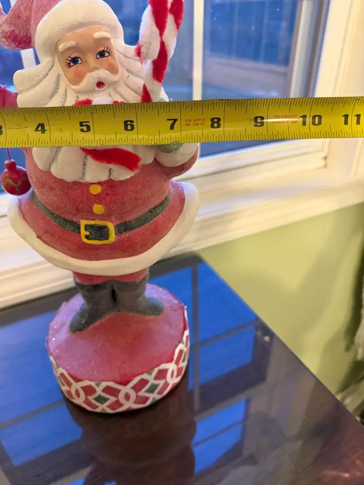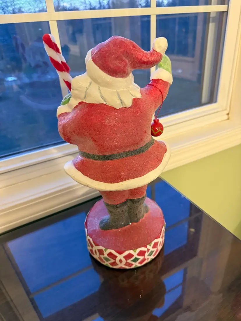 This sparkly vintage Santa/St. Nick figurine is a colorful resin figure that holds candy, canes, and an ornament. Standing at 14 inches tall, this medium-sized figurine is perfect for Christmas decor. The contemporary style and musical theme make it a charming addition to any holiday display, especially for adults who appreciate unique Santa figurines from the 1990s. Unboxed and uncustom bundled, this Santa figure adds a touch of nostalgia and festive cheer to any room during the holiday season.