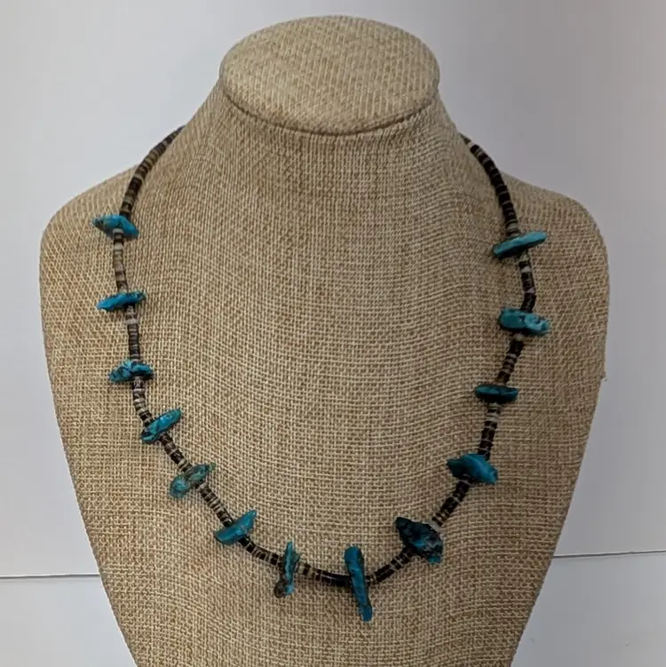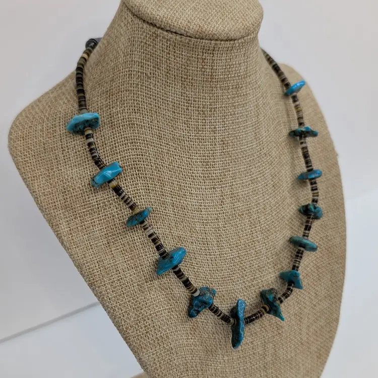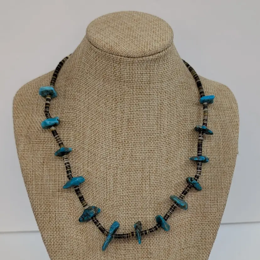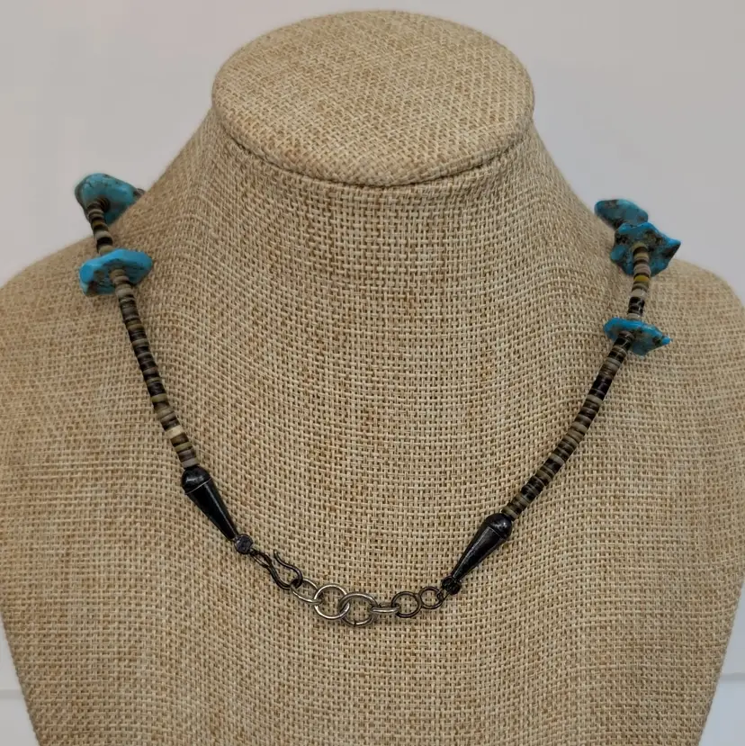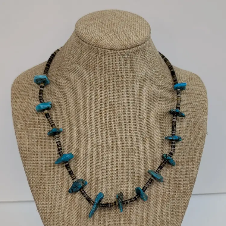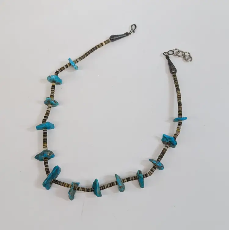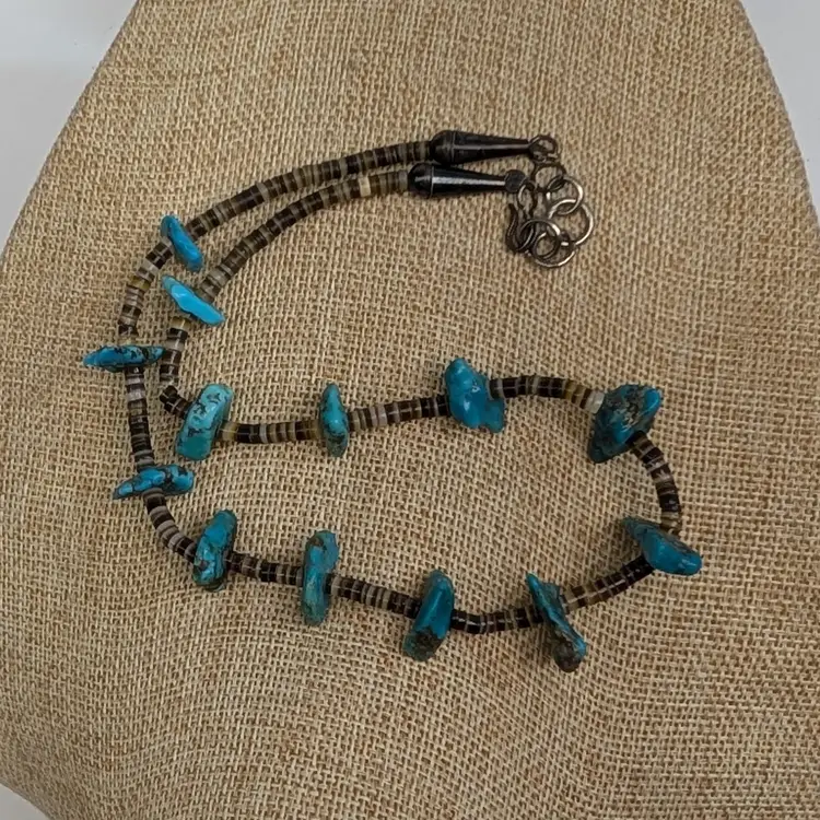 Beautiful mix of dark brown and cream heishi shell beads and turquoise tab beads. The ends are sterling but 4 jump rings have been added as an extender and they are not sterling. In nice, used condition. Measurements ~ 16.25 to 17"